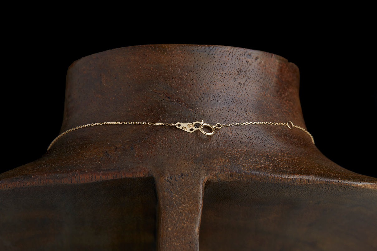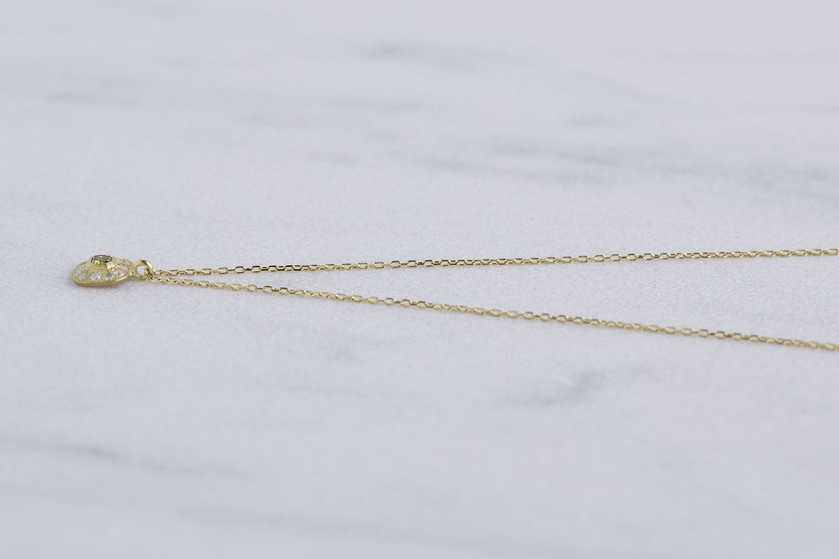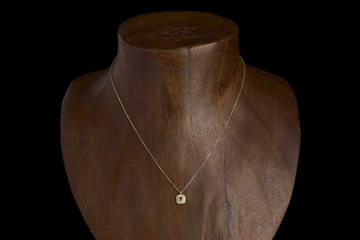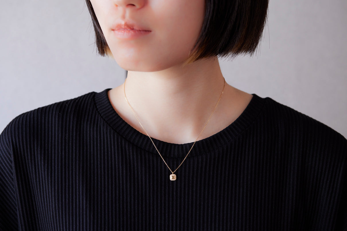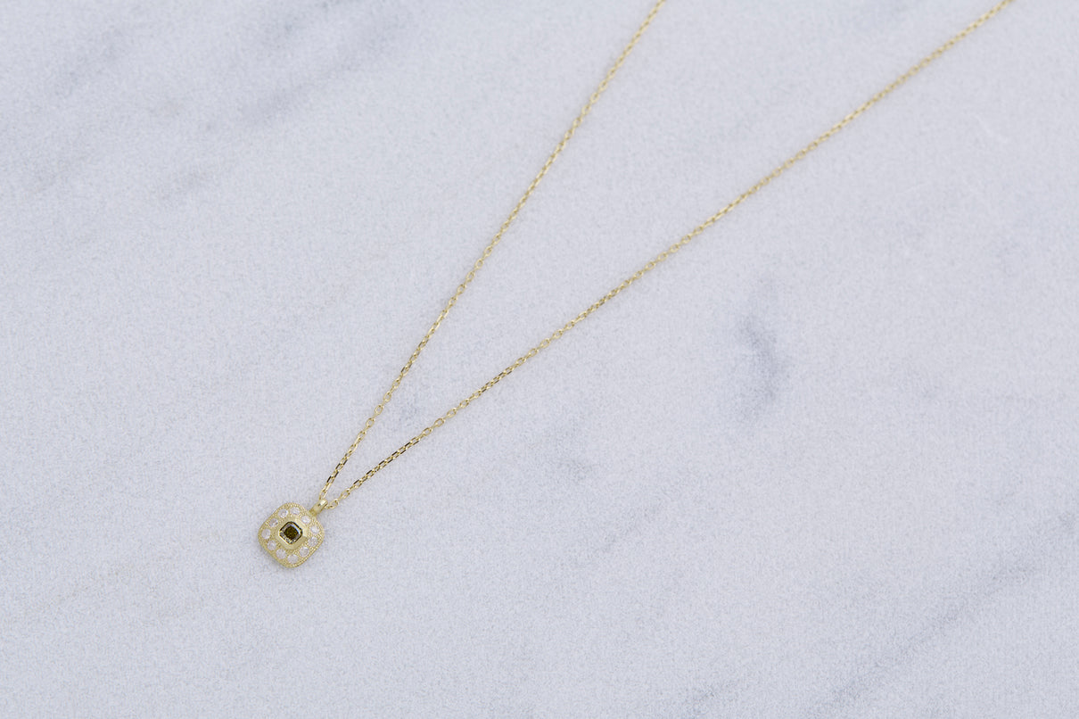 クッションカットのダイヤモンドを、アイスカラーのメレダイヤモンドと細かな手仕によるミル打ちで縁取った、クラシカルな印象のプラチナネックレス。センターダイヤモンドは深みのあるオリーブカラーのダイヤモンドで、取り巻くアイスカラーダイヤモンドとのシックなカラーの組み合わせが、一点ものならではの他にない個性と存在感を放ちます。小ぶりで華奢な印象のサイズ感のため、日常的に身につけて頂きやすいネックレスです。