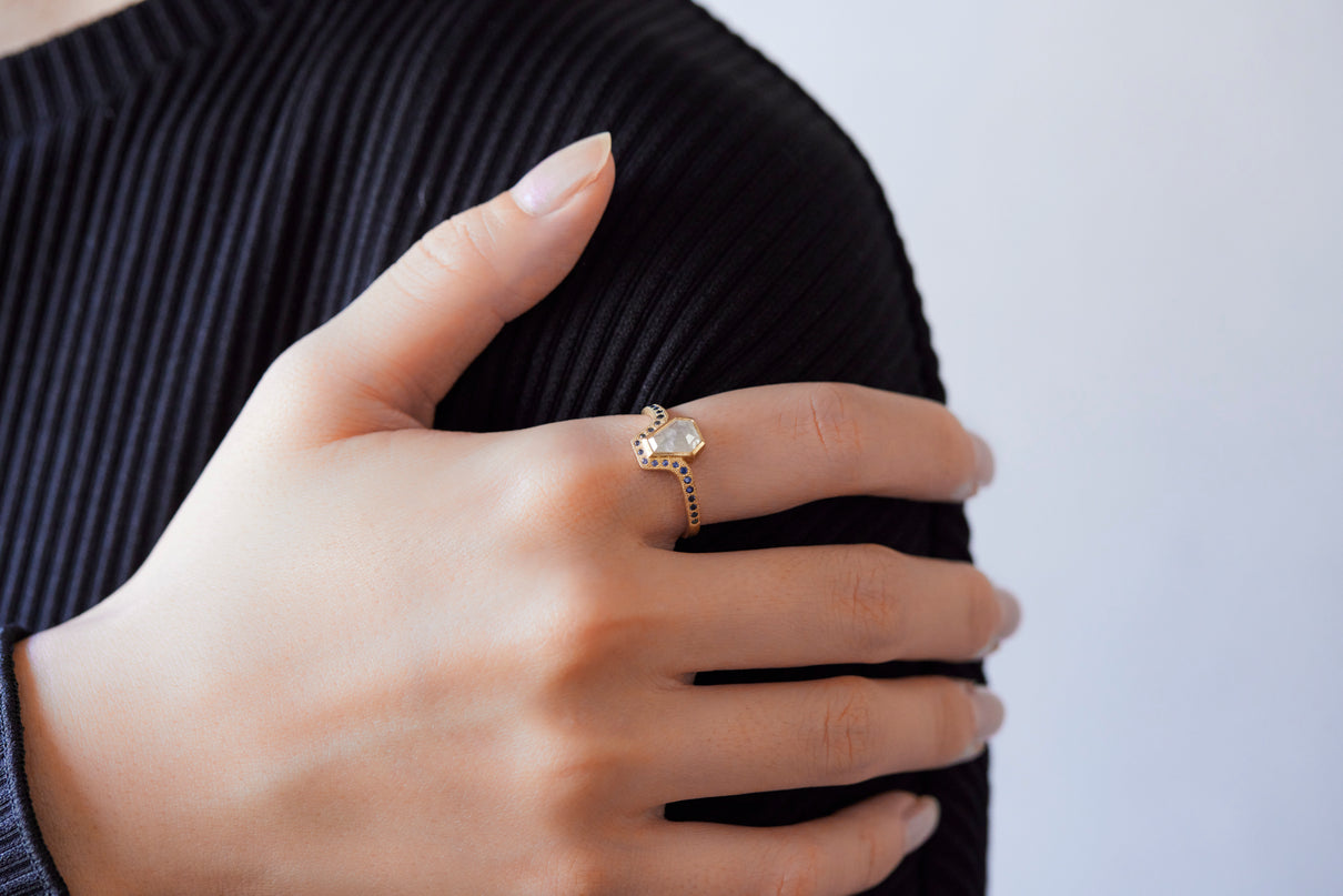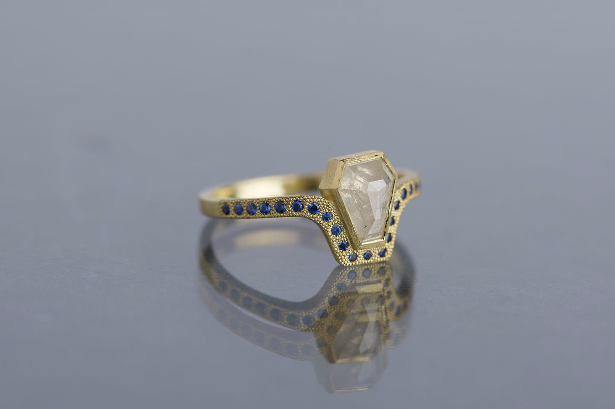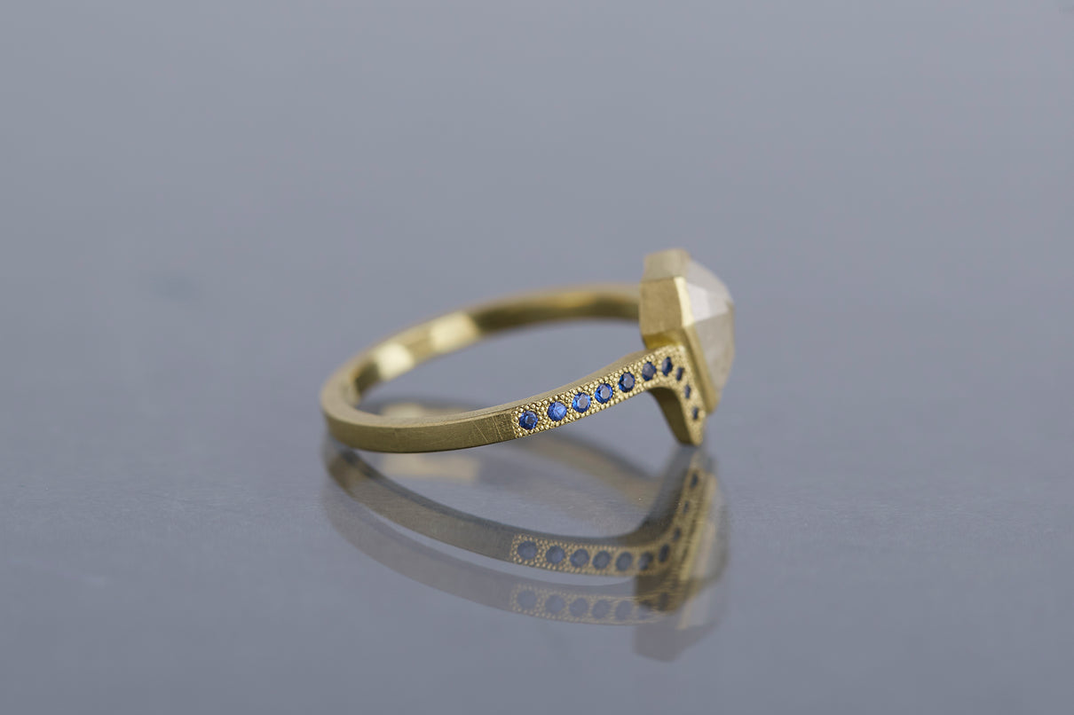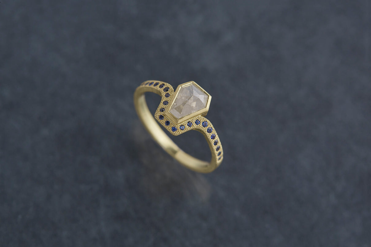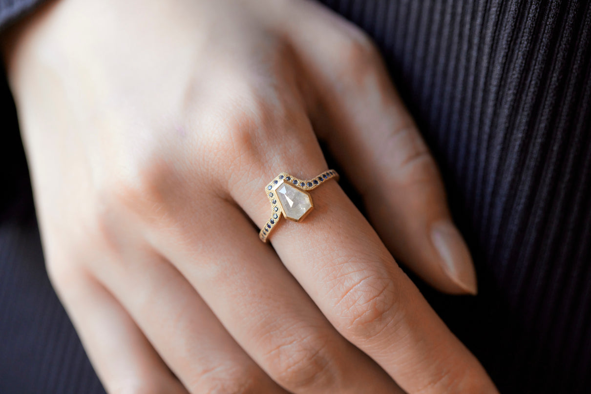 アイスカラーダイヤモンドの半周からアームにかけて、23ピースものメレサファイアと細かな手仕事のミル打ちで贅沢に縁取ったゴールドリング。無色透明以外にも多種多様なカラーが存在するダイヤモンドの中でも、美しい乳白色は大変希少価値が高く、その穏やかな美しさはホワイトダイヤモンドとも呼ばれ世界中で人気を博しています。そんなアイスカラーのダイヤモンドの中でも、1ct以上の大粒の希少なダイヤモンドを使用し、落ち着いた深い濃紺のサファイアと組み合わせて丁寧に仕立てました。あえてアシンメトリーにデザインをしたリングアームで重心に変化を持たせ、ダイヤモンドの存在をより引き立てています。ダイヤモンドならではの華やかな煌めきとサファイアのシックな印象を兼ね備えた、装いの主役となる確かな存在感のあるリング。ダイヤモンドは4月の誕生石、サファイアは9月の誕生石としても親しまれているため、特別なお守りとしての贈り物にもお勧めです。