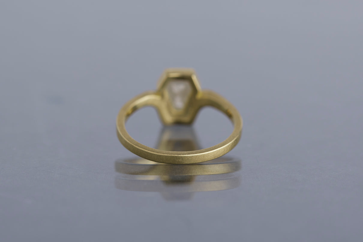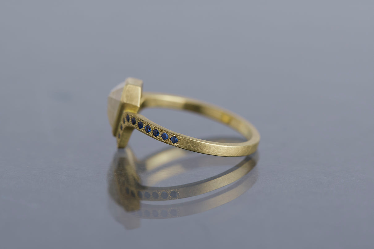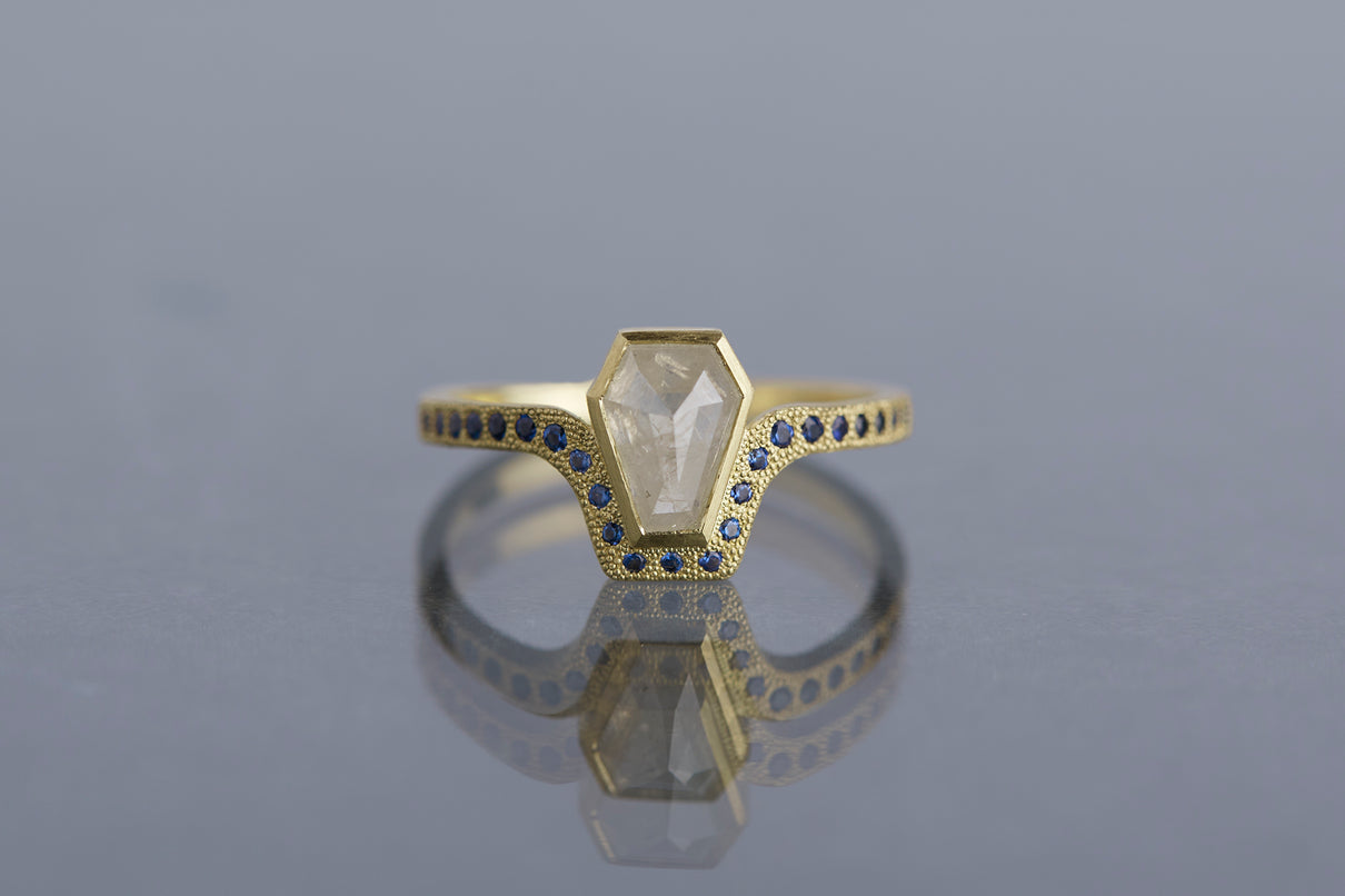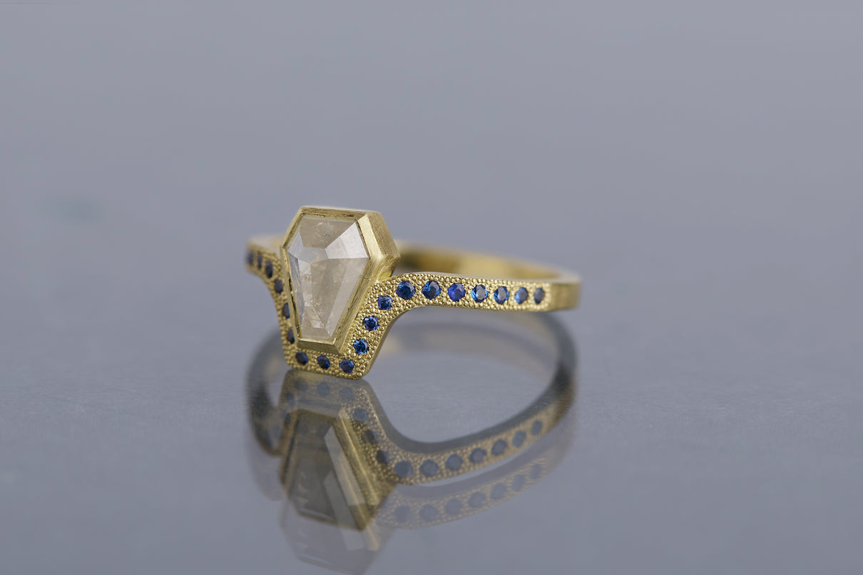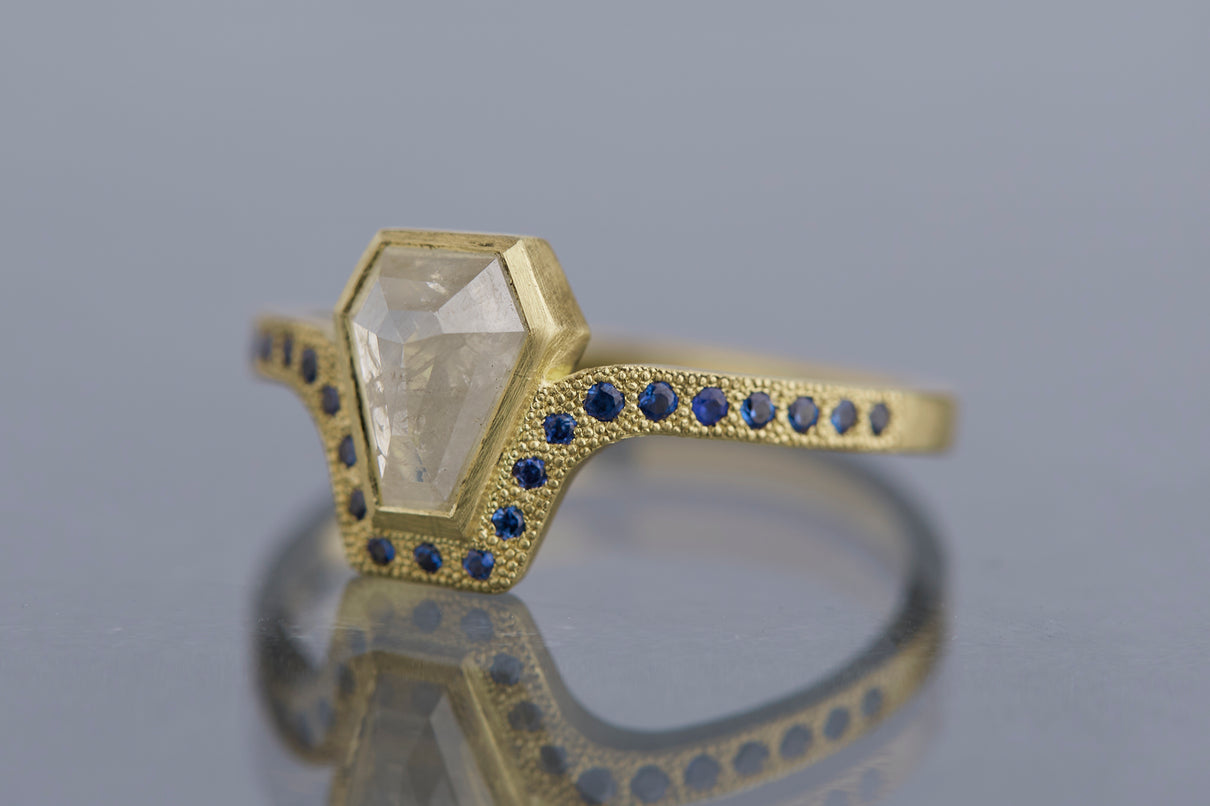 アイスカラーダイヤモンドの半周からアームにかけて、23ピースものメレサファイアと細かな手仕事のミル打ちで贅沢に縁取ったゴールドリング。無色透明以外にも多種多様なカラーが存在するダイヤモンドの中でも、美しい乳白色は大変希少価値が高く、その穏やかな美しさはホワイトダイヤモンドとも呼ばれ世界中で人気を博しています。そんなアイスカラーのダイヤモンドの中でも、1ct以上の大粒の希少なダイヤモンドを使用し、落ち着いた深い濃紺のサファイアと組み合わせて丁寧に仕立てました。あえてアシンメトリーにデザインをしたリングアームで重心に変化を持たせ、ダイヤモンドの存在をより引き立てています。ダイヤモンドならではの華やかな煌めきとサファイアのシックな印象を兼ね備えた、装いの主役となる確かな存在感のあるリング。ダイヤモンドは4月の誕生石、サファイアは9月の誕生石としても親しまれているため、特別なお守りとしての贈り物にもお勧めです。
