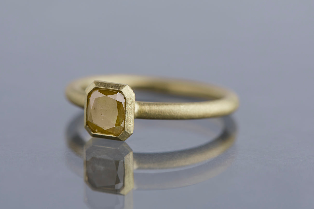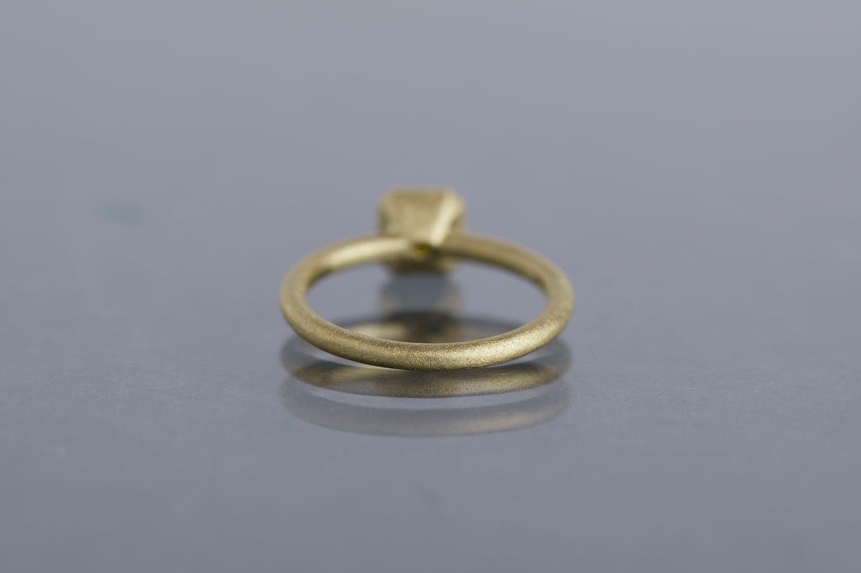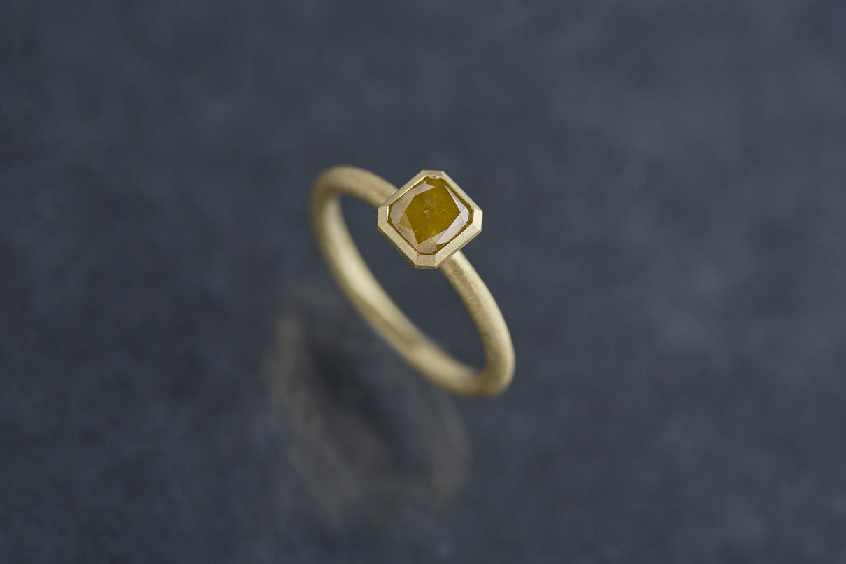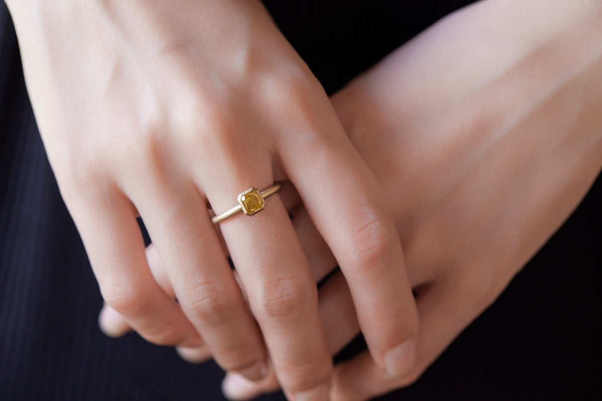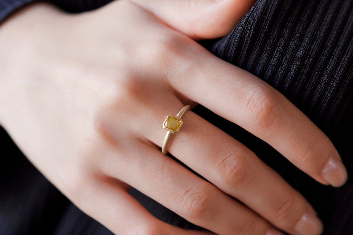 ナチュラルな美しさを持つイエローダイヤモンドをシンプルにあしらった、プリミティブな印象のゴールドリング。コロンとした量感のある不透明なスクエアカットのダイヤモンドは、角度を変える度に表面が強く光を反射して煌めき、そのきりっとしたハイライトはやはりダイヤモンドならではの美しさです。高さを抑えた石座とアーム部分は自然に繋がるミニマムなデザインで、落ち着きのあるマットテクスチャーを施しています。どんな装いにも合わせやすい、デイリーに活躍する1点もののダイヤモンドリングです。