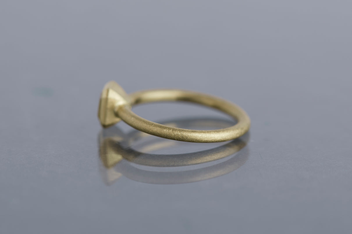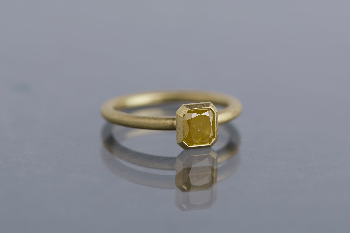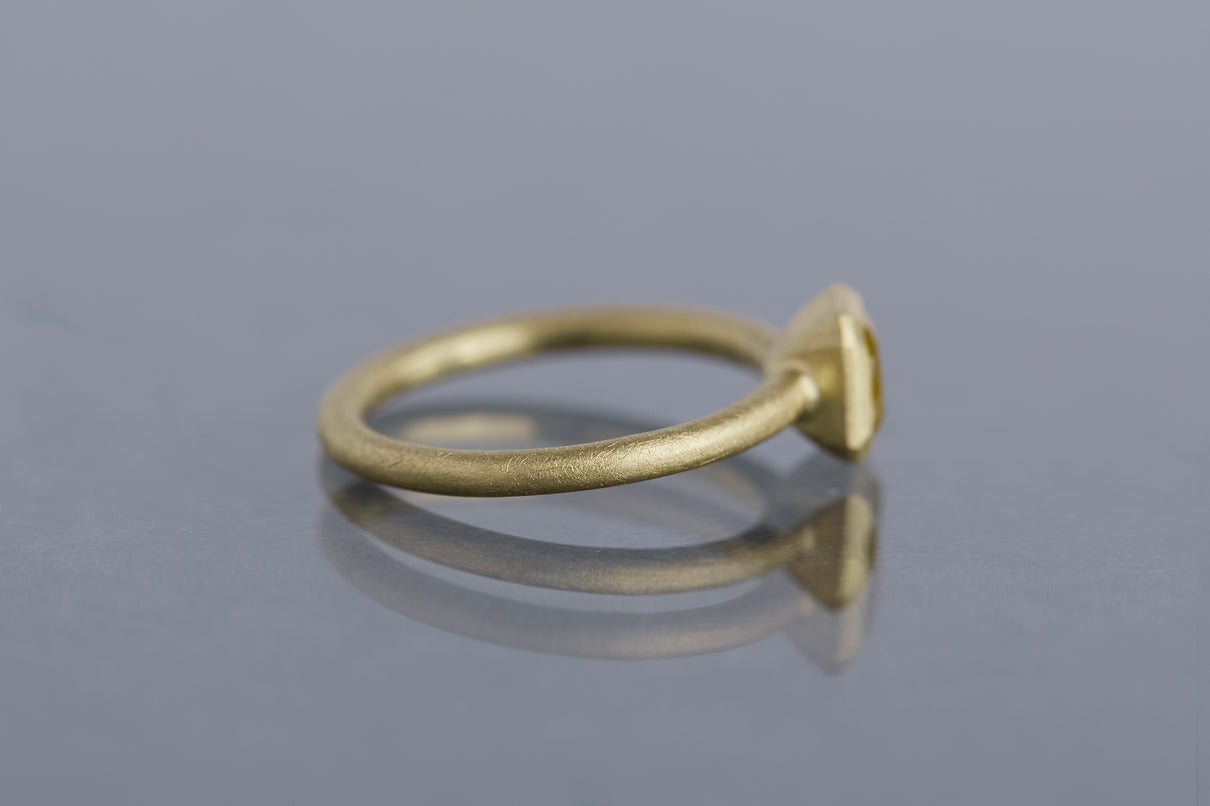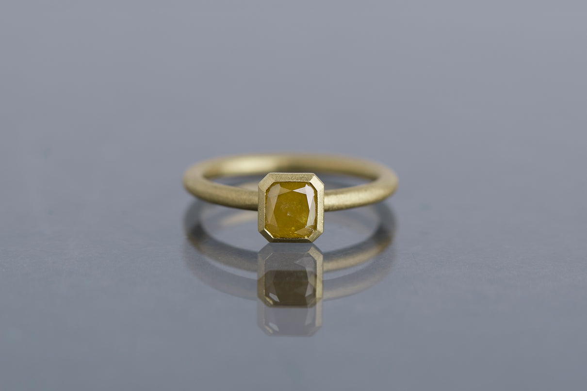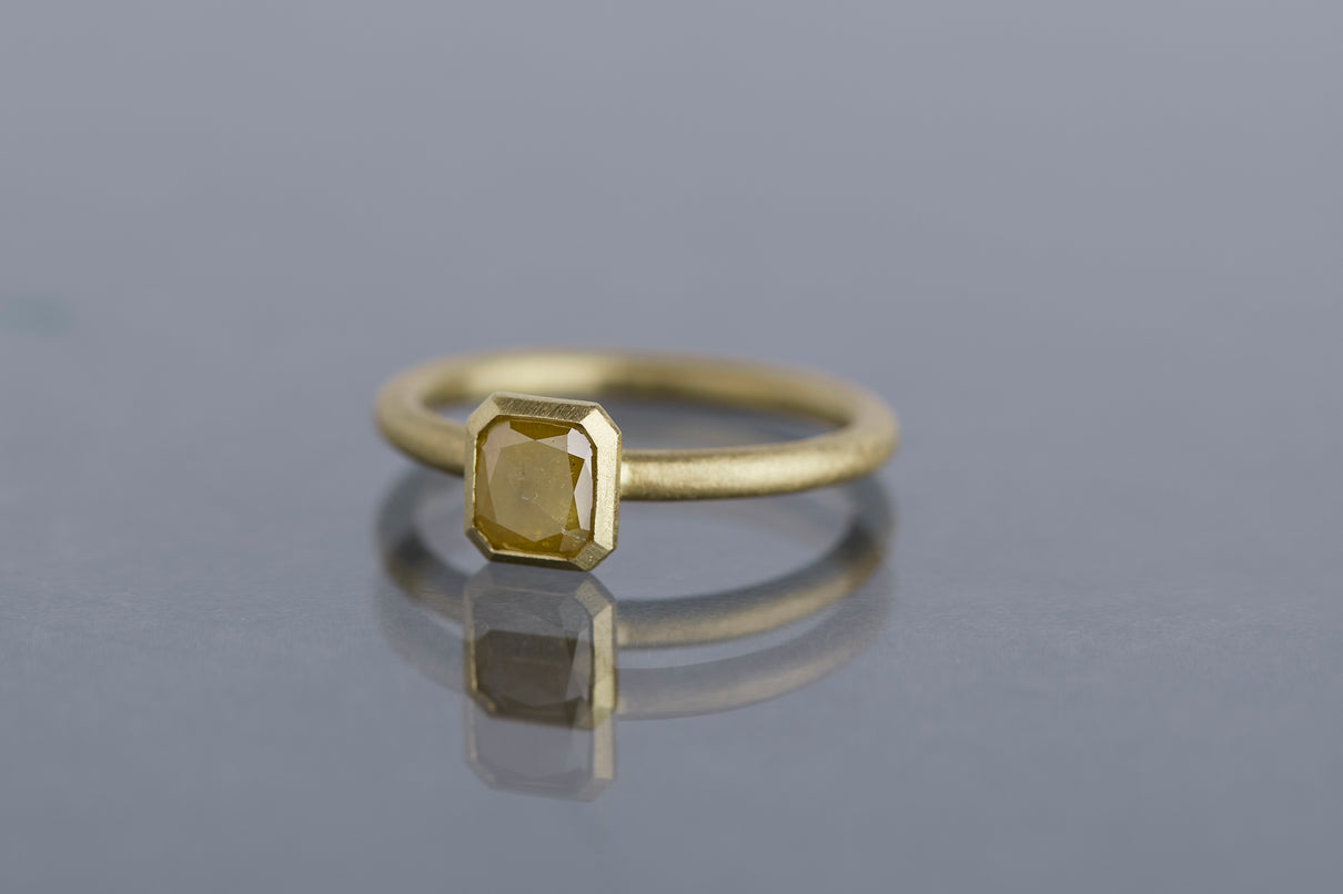 ナチュラルな美しさを持つイエローダイヤモンドをシンプルにあしらった、プリミティブな印象のゴールドリング。コロンとした量感のある不透明なスクエアカットのダイヤモンドは、角度を変える度に表面が強く光を反射して煌めき、そのきりっとしたハイライトはやはりダイヤモンドならではの美しさです。高さを抑えた石座とアーム部分は自然に繋がるミニマムなデザインで、落ち着きのあるマットテクスチャーを施しています。どんな装いにも合わせやすい、デイリーに活躍する1点もののダイヤモンドリングです。