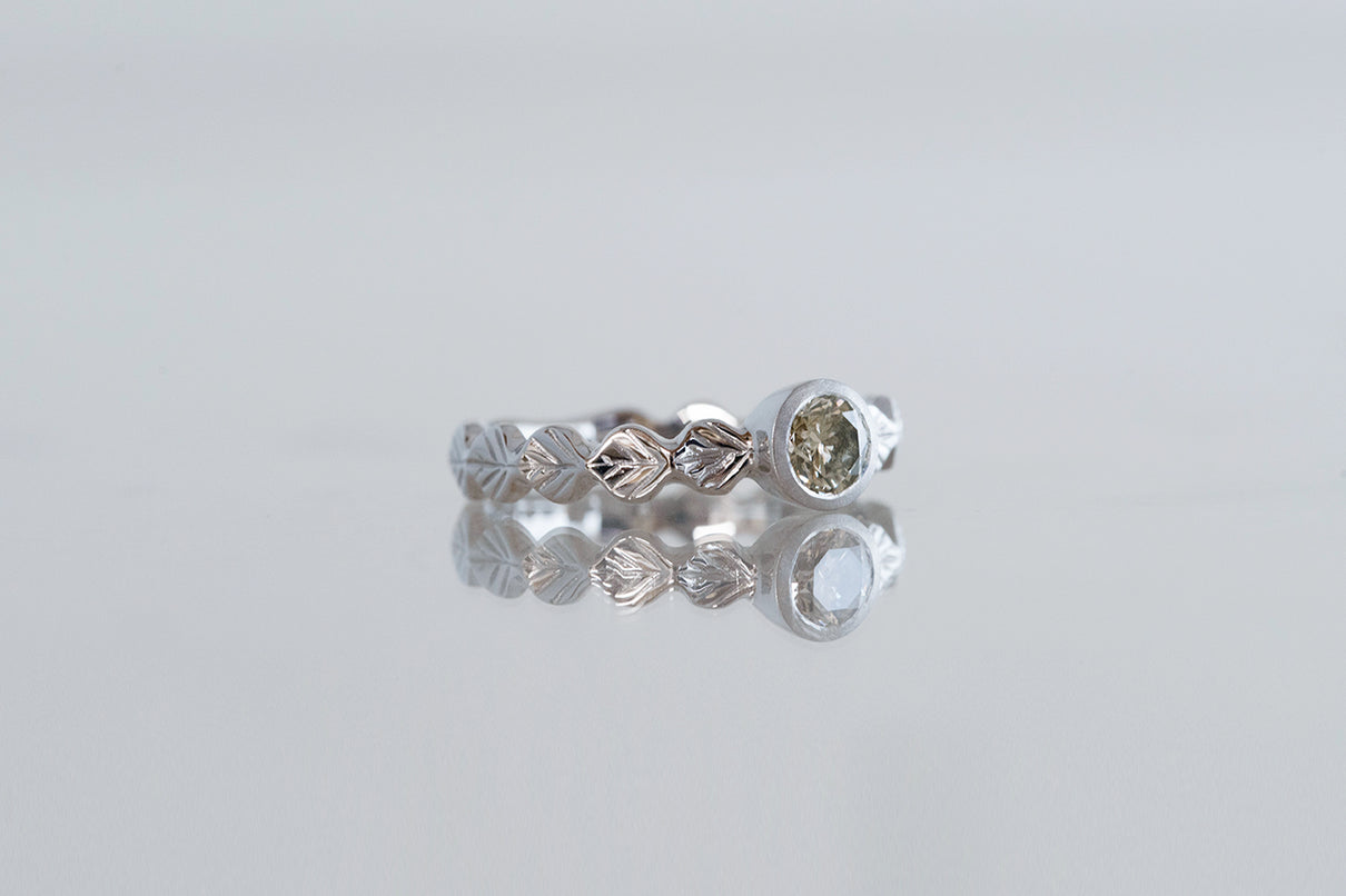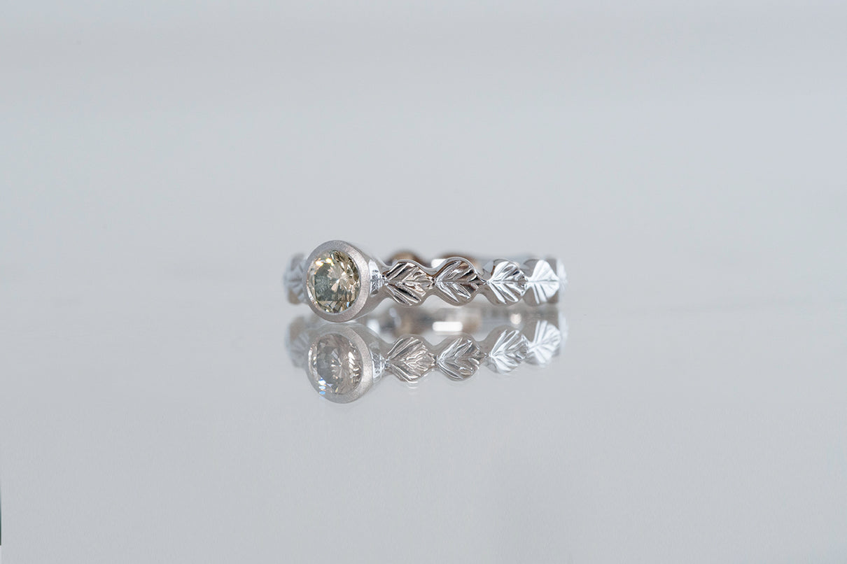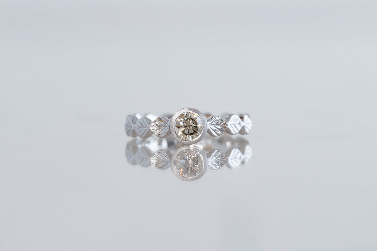 いくつも連なる葉っぱをモチーフに、1枚1枚わずかに異なる表情に遊び心を込めた"Leaf"シリーズの一点もののリングです。微かに黄色く色づいたシャンパンカラーのブリリアントカットのダイヤモンド。その眩く強い煌めきを引き立てるように包み込むマットテクスチャーに仕立てたベゼルセッティングと、ダイヤモンドの輝きと呼応するように艶感を持たせた仕上げのリングアーム。抑揚のある輝きが、指元に特別な華やぎをもたらします。アームは葉のサイズが小ぶりなタイプのLeaf little ベース。日常的に身に着けていただくのはもちろん、特別な贈りものにも最適なアイテムです。