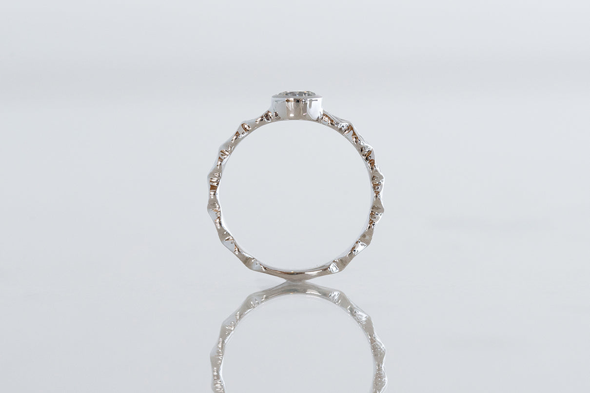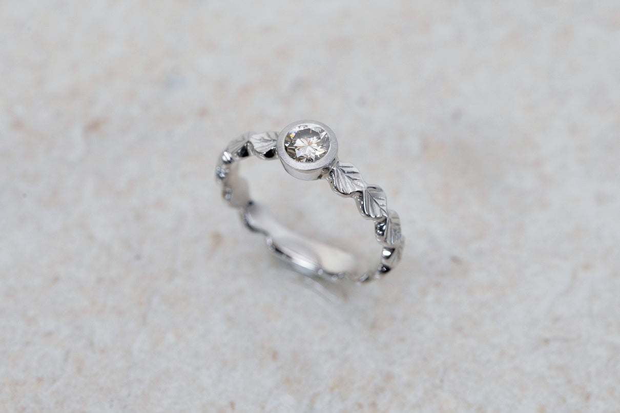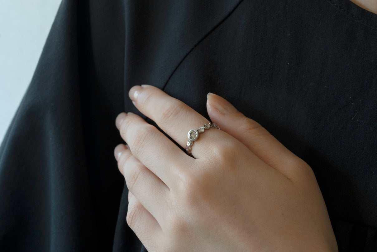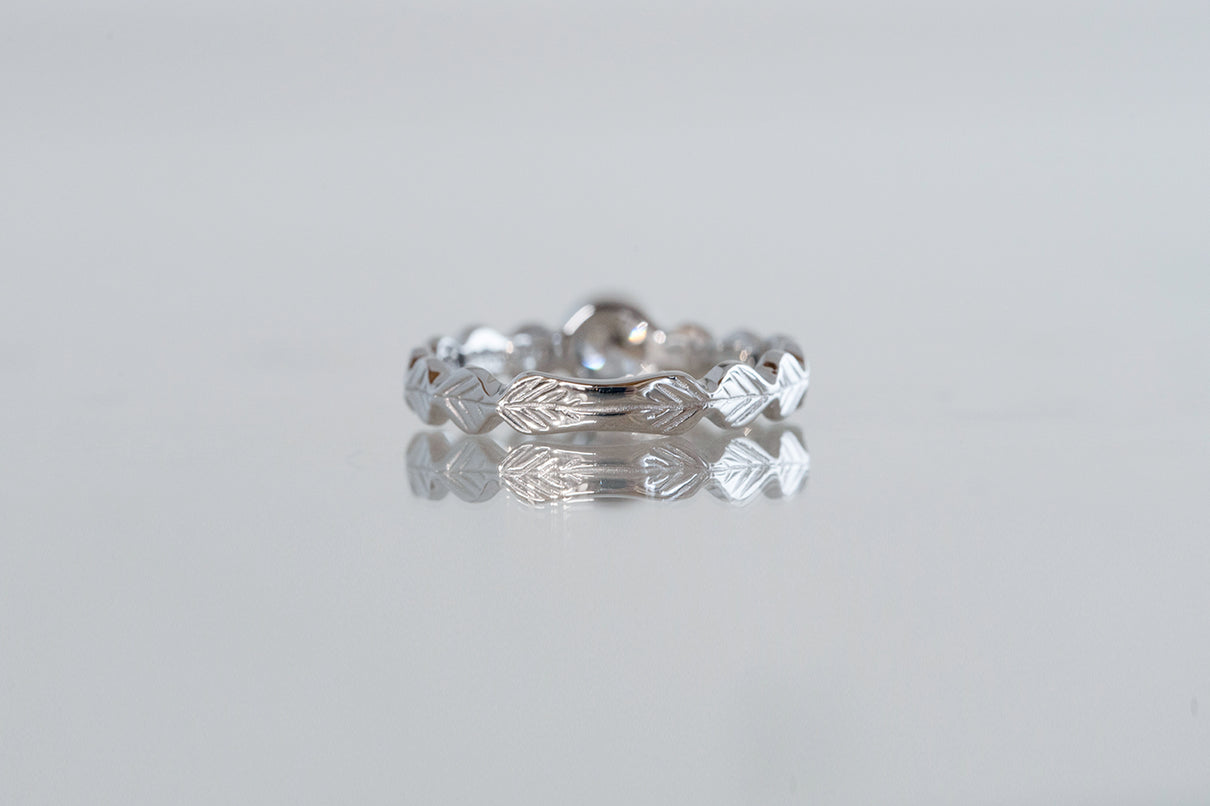 いくつも連なる葉っぱをモチーフに、1枚1枚わずかに異なる表情に遊び心を込めた"Leaf"シリーズの一点もののリングです。微かに黄色く色づいたシャンパンカラーのブリリアントカットのダイヤモンド。その眩く強い煌めきを引き立てるように包み込むマットテクスチャーに仕立てたベゼルセッティングと、ダイヤモンドの輝きと呼応するように艶感を持たせた仕上げのリングアーム。抑揚のある輝きが、指元に特別な華やぎをもたらします。アームは葉のサイズが小ぶりなタイプのLeaf little ベース。日常的に身に着けていただくのはもちろん、特別な贈りものにも最適なアイテムです。