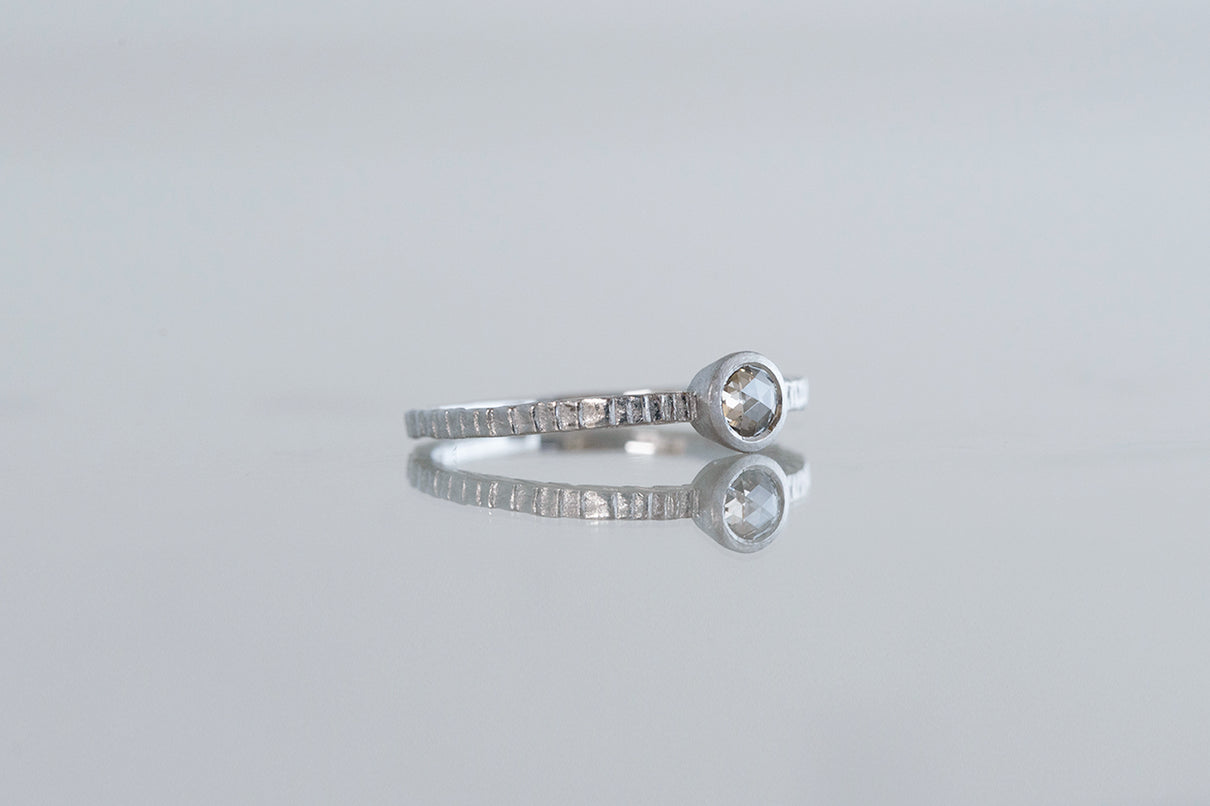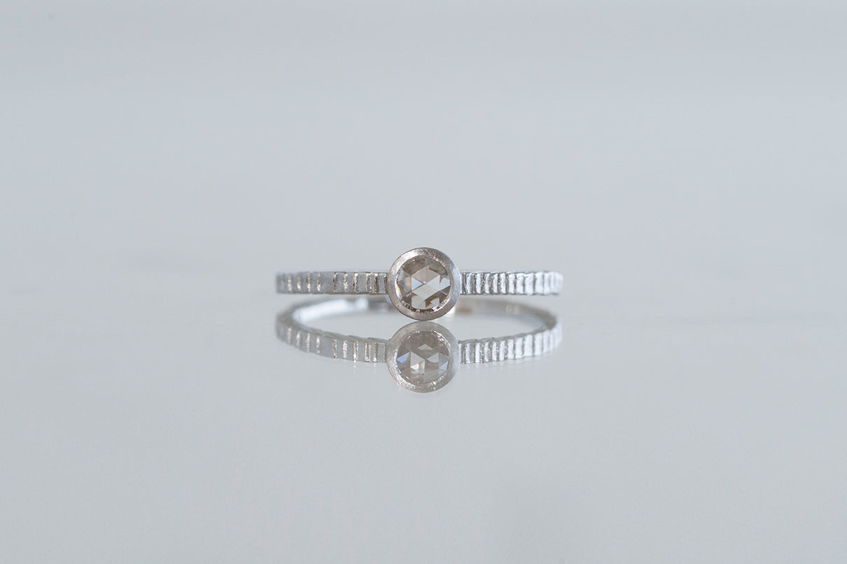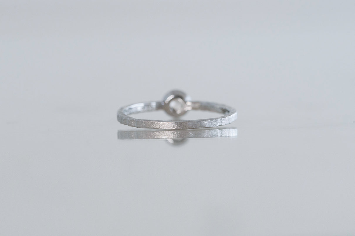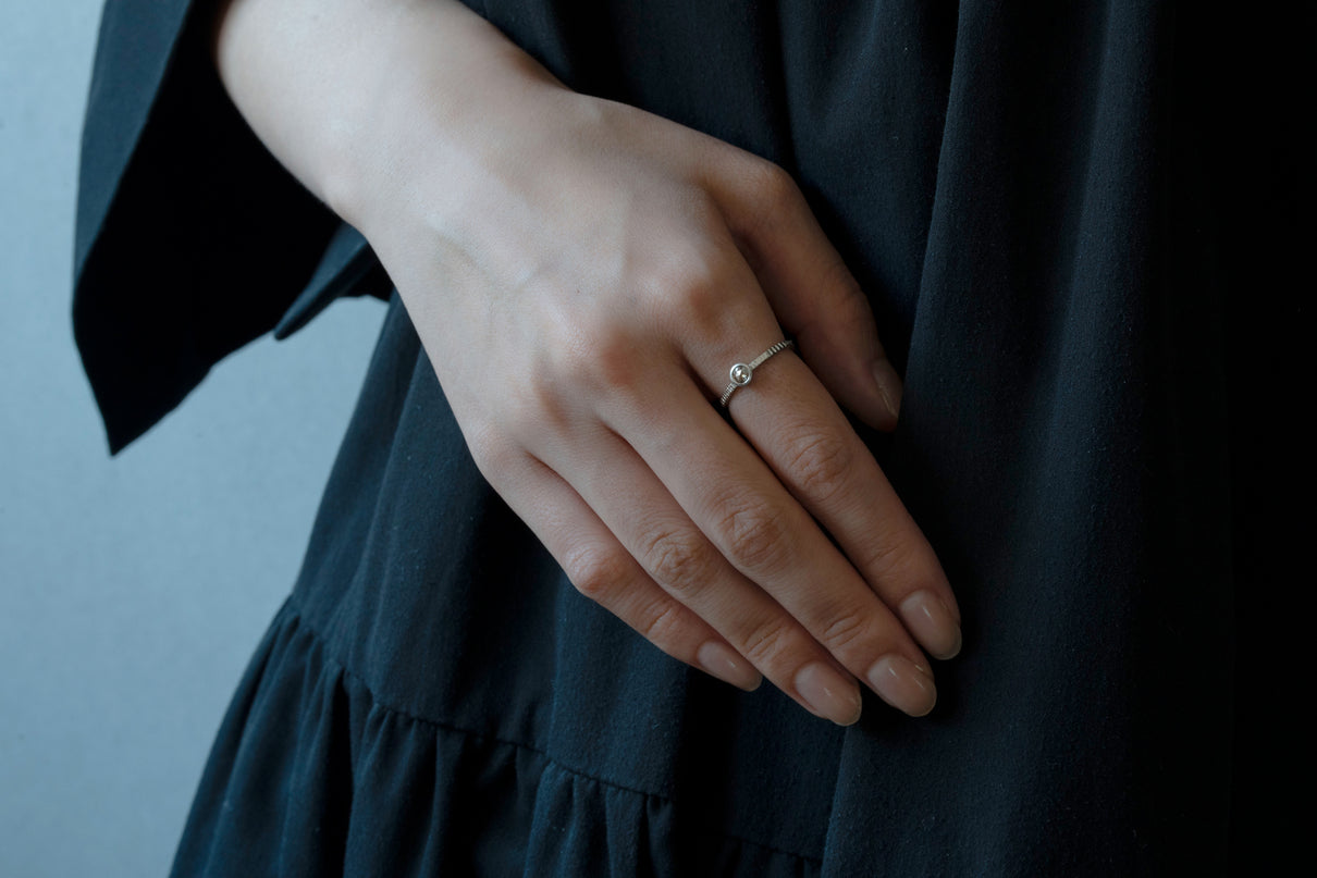 "立ち止まり、目を向ければ 大切なことは 変わらずいつもそこに在る ー" 2023 collection 「Unknown knowns」シリーズのリングをベースに、水滴のような瑞々しい煌めきを放つローズカットのダイヤモンドを留めた一点もののリングです。ごく僅かにグレー色を帯びた透明度の高いカラーのダイヤモンド。湖面に優しい陽の光がゆっくりと注いだような情景を思わせる、柔らかな輝きをお楽しみいただけます。細身のアームは軽やかな付け心地で、普段使いのリングとしてもおすすめです。