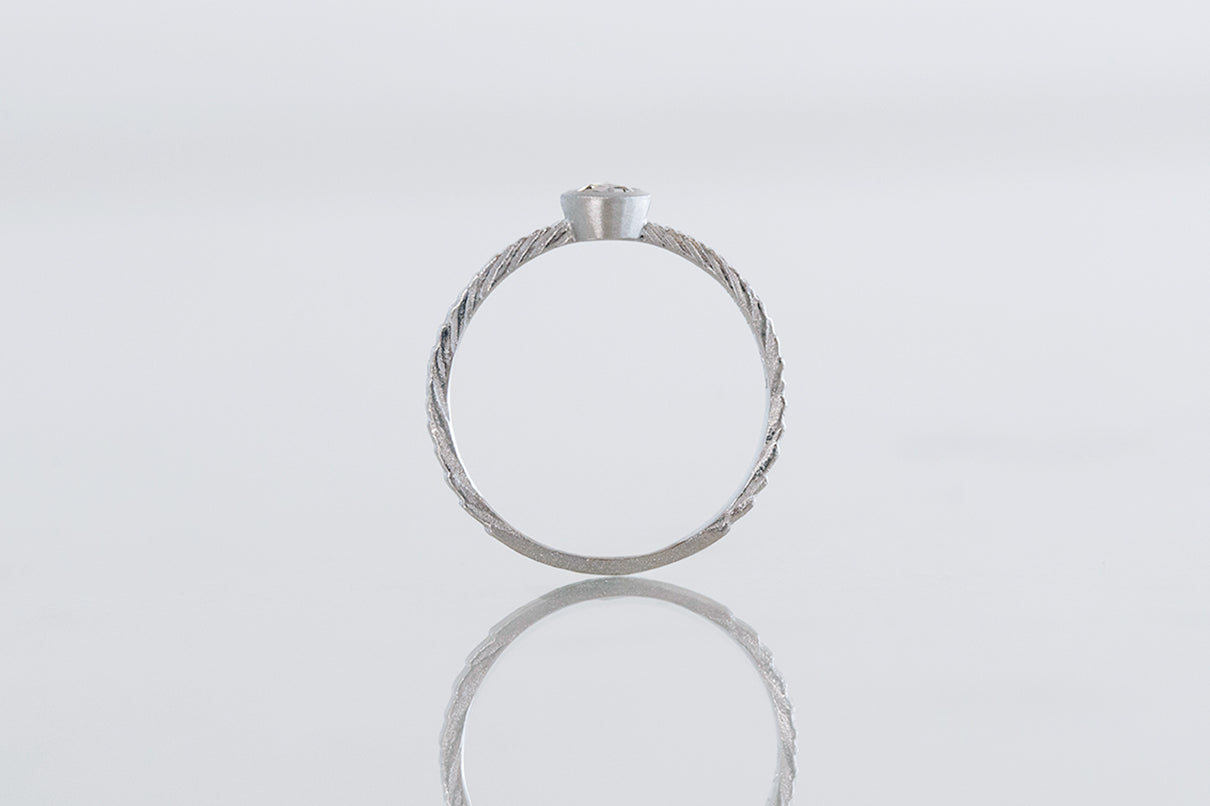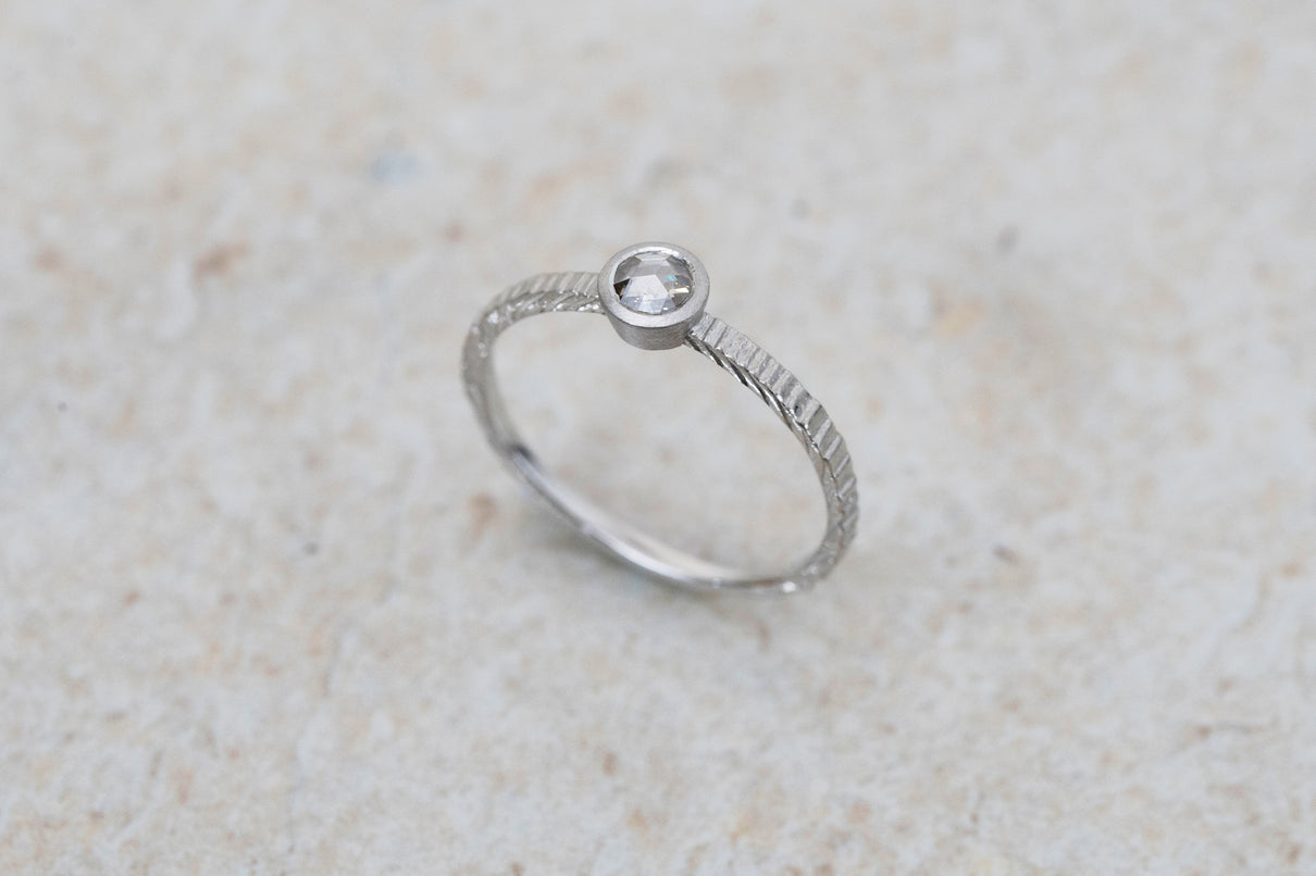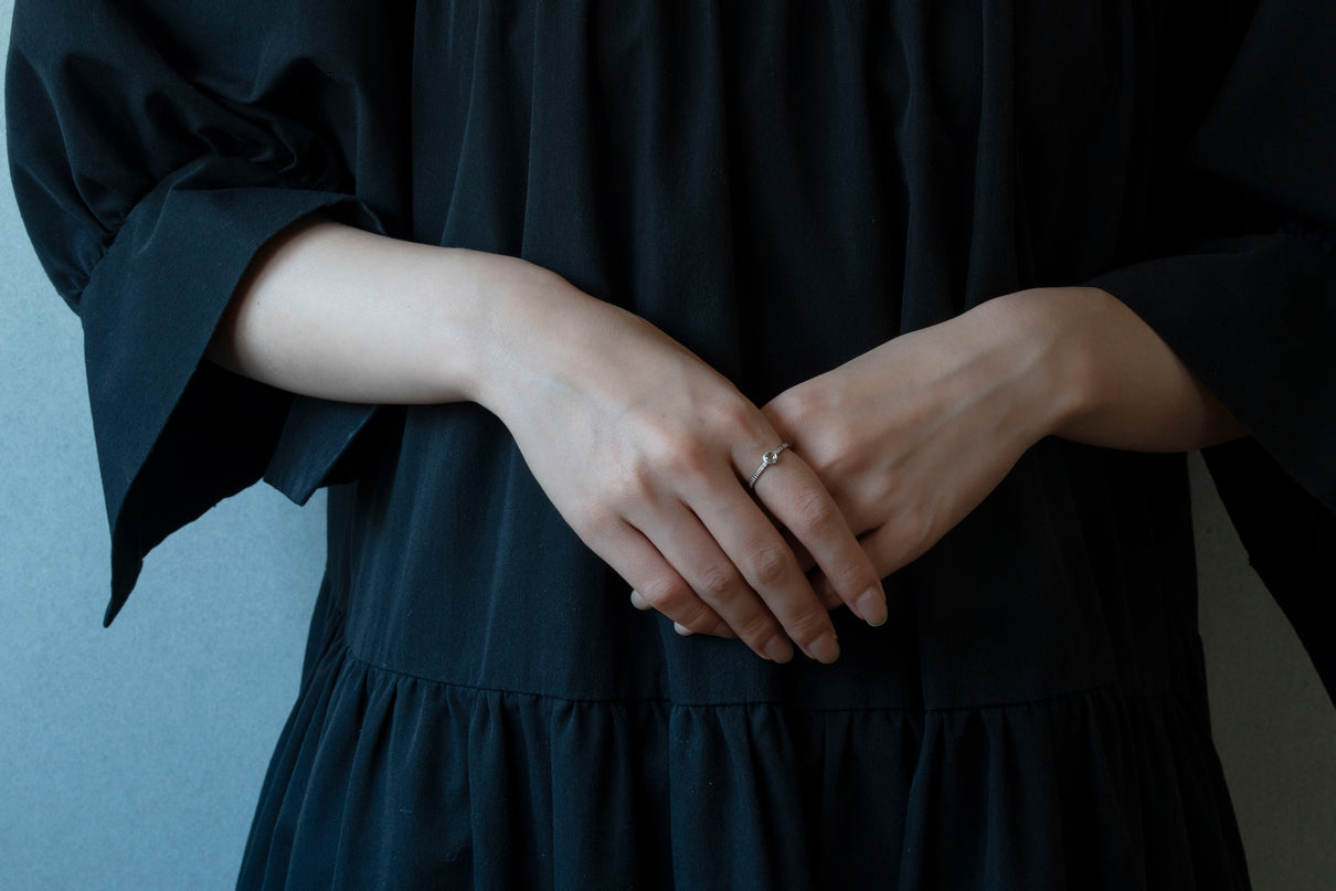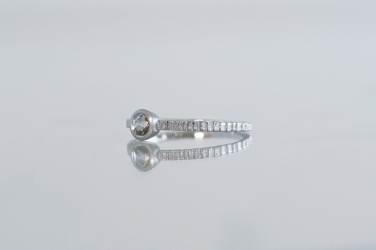 "立ち止まり、目を向ければ 大切なことは 変わらずいつもそこに在る ー" 2023 collection 「Unknown knowns」シリーズのリングをベースに、水滴のような瑞々しい煌めきを放つローズカットのダイヤモンドを留めた一点もののリングです。ごく僅かにグレー色を帯びた透明度の高いカラーのダイヤモンド。湖面に優しい陽の光がゆっくりと注いだような情景を思わせる、柔らかな輝きをお楽しみいただけます。細身のアームは軽やかな付け心地で、普段使いのリングとしてもおすすめです。