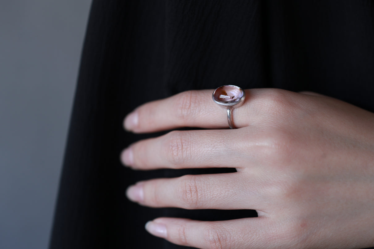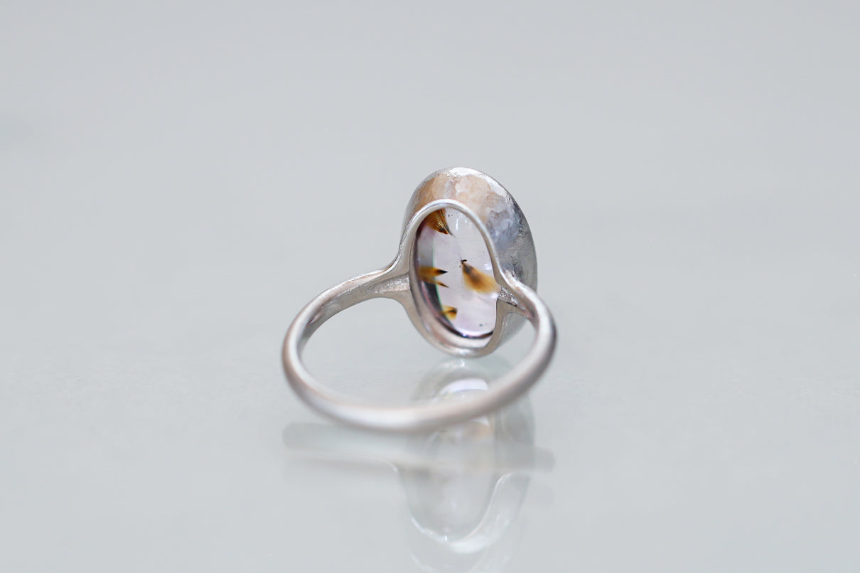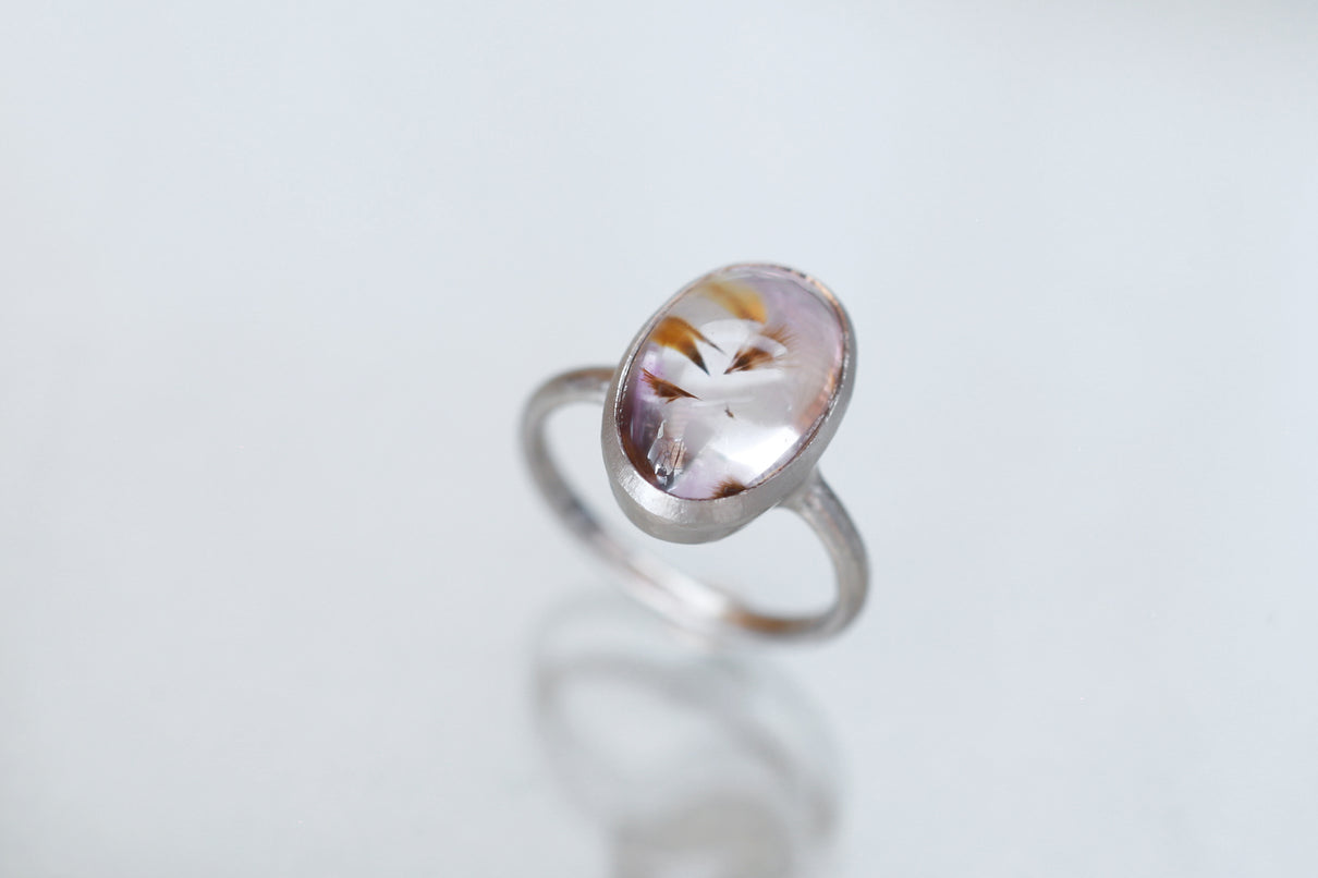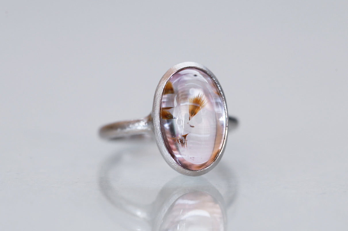 特別な存在感を放つゲーサイトインアメジストで仕立てた1点もののリング。アメジストは日本では古来より "紫水晶" の名で大切に扱われ、2月の誕生石としても広く親しまれている宝石です。まるで水滴のような高い透明度を持ち、ほのかに紫に色づいた上品な色合いを基調としたアメジストで、さらにオレンジブラウンの大変繊細な「ゲーサイト」という針状の結晶を内包した美しいピース。まるで青空が夜空へと変化し始める頃、羽根のついた種子が吹き抜けた風に乗り、はらはらと宙を舞う。そんな一瞬の情景を淡く澄み切ったアメシストに閉じ込めたかのような、どこか儚く、奥ゆかしい魅力に溢れる表情を見せます。そんなゲーサイトインアメジストを引き立てる、プラチナの台座とリングアームにあしらったリング。透明感の高さをよりお楽しみいただけるオーバルカボションカットの滲むような潤みを帯びた艶めきが、手元を印象的に彩ります。2月の誕生石としても親しまれているアメジストは、2月生まれの方の特別なお守りとして贈りものにも最適なアイテムです。