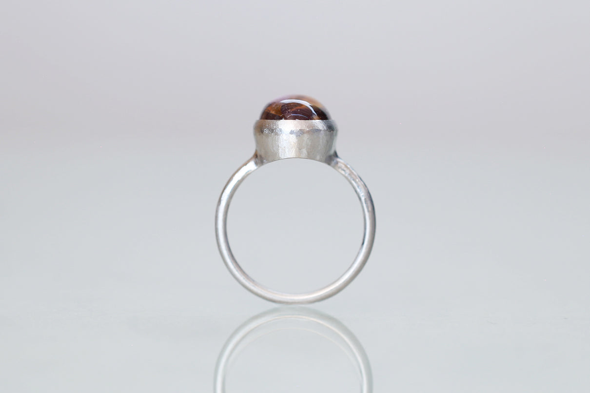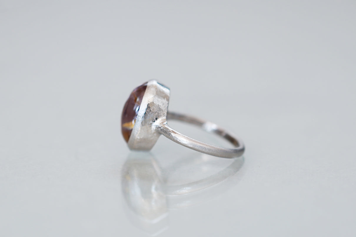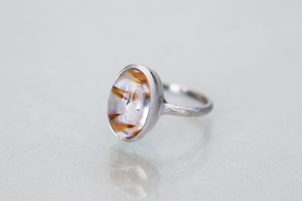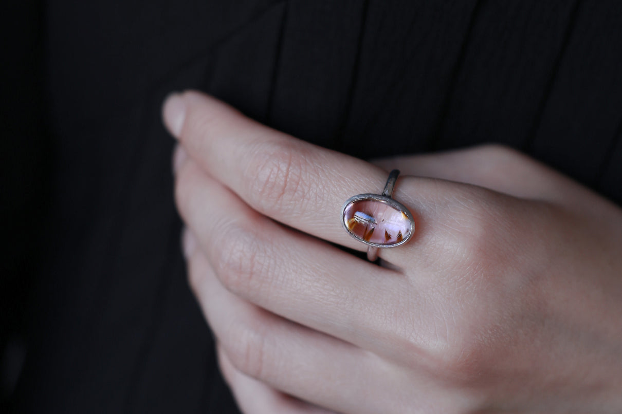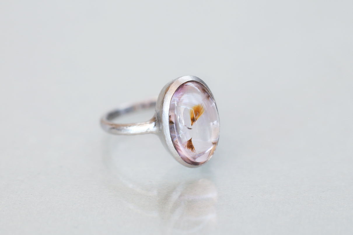 特別な存在感を放つゲーサイトインアメジストで仕立てた1点もののリング。アメジストは日本では古来より "紫水晶" の名で大切に扱われ、2月の誕生石としても広く親しまれている宝石です。まるで水滴のような高い透明度を持ち、ほのかに紫に色づいた上品な色合いを基調としたアメジストで、さらにオレンジブラウンの大変繊細な「ゲーサイト」という針状の結晶を内包した美しいピース。まるで青空が夜空へと変化し始める頃、羽根のついた種子が吹き抜けた風に乗り、はらはらと宙を舞う。そんな一瞬の情景を淡く澄み切ったアメシストに閉じ込めたかのような、どこか儚く、奥ゆかしい魅力に溢れる表情を見せます。そんなゲーサイトインアメジストを引き立てる、プラチナの台座とリングアームにあしらったリング。透明感の高さをよりお楽しみいただけるオーバルカボションカットの滲むような潤みを帯びた艶めきが、手元を印象的に彩ります。2月の誕生石としても親しまれているアメジストは、2月生まれの方の特別なお守りとして贈りものにも最適なアイテムです。