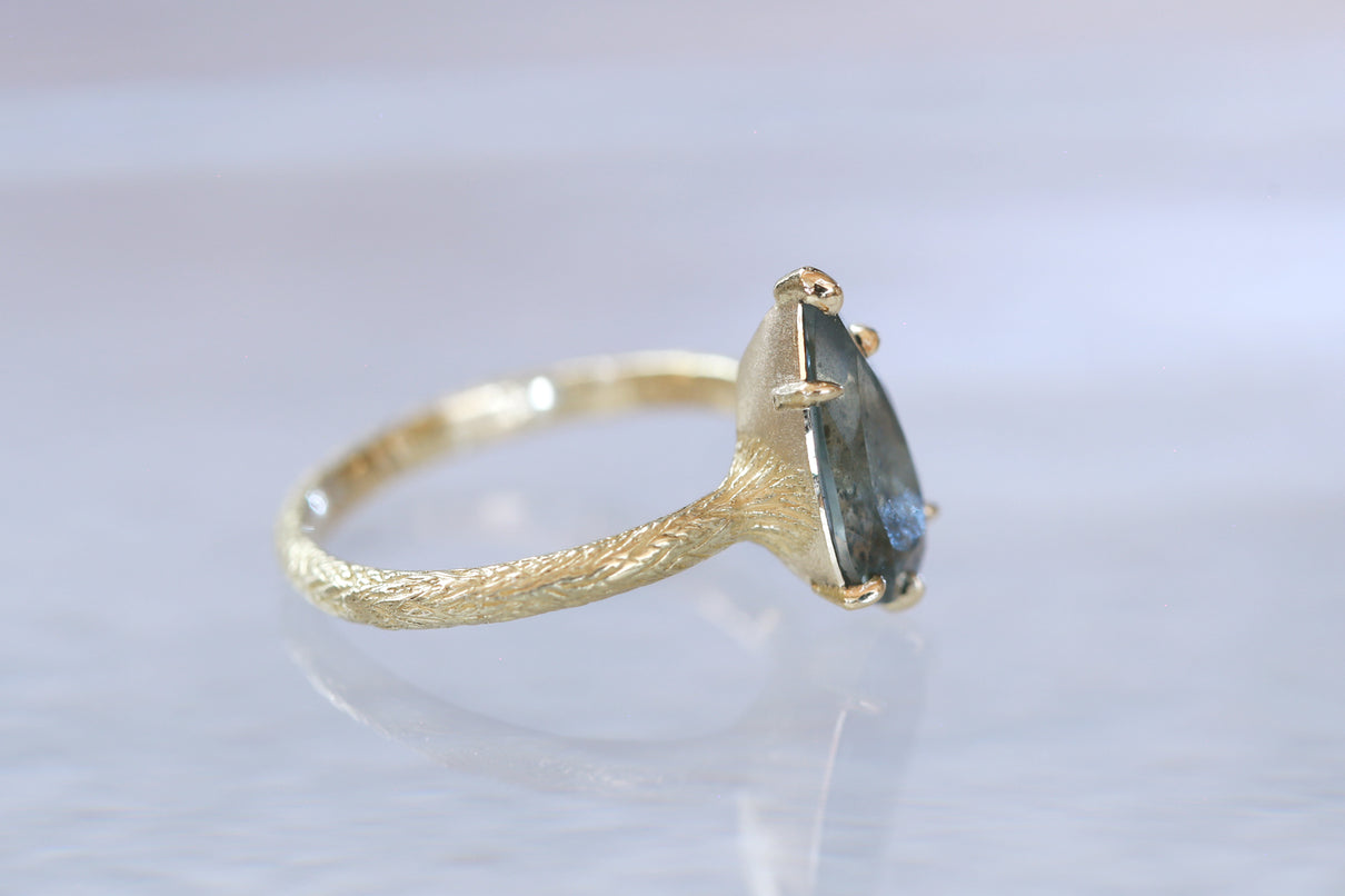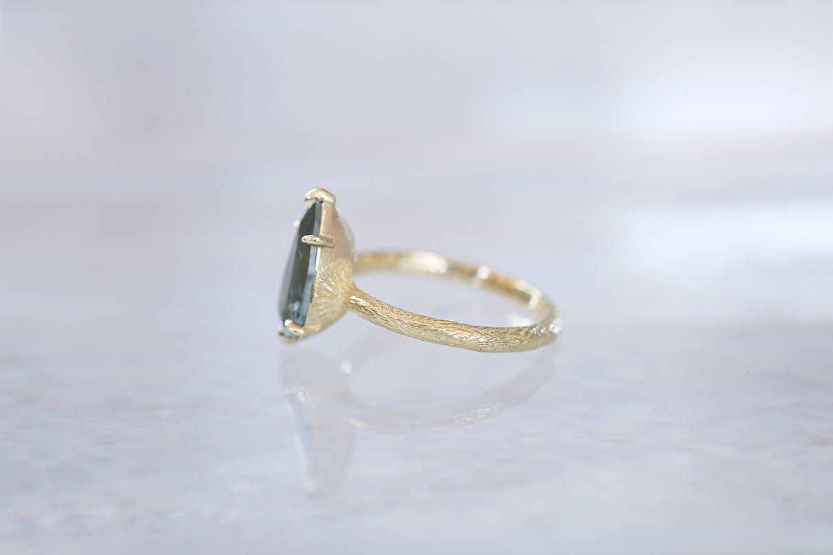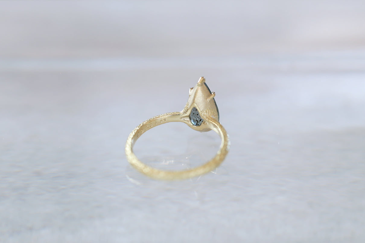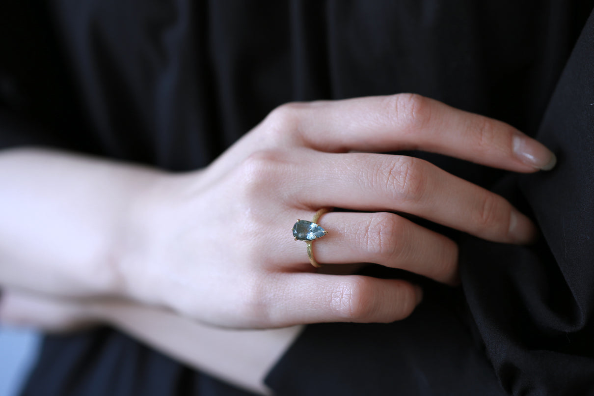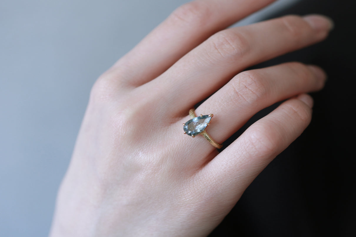 まるで苔のように見えるチタン鉄鉱からなるインクルージョンが複雑に層を成す、個性が光るドロップカットのモスアクアマリンで仕立てた一点もののリング。静寂を纏う有機的な内包物の表面に、角度によって柔らかなシルバーの輝きを放つシラーの対比が素晴らしい、ドロップカットのモスアクアマリン。そんな潤みを滲ませた透明度の高いルースを、華やかな明るさを湛えるイエローゴールドの繊細な6本爪でデザインしました。生物の表皮を覆う有機的で緻密な表情をモチーフにした " Coat " シリーズの手彫り模様のテクスチャーを施したリングは、凹はマット、凸は半光沢仕上げと、それぞれで質感を微妙に変化させ、細部まで手仕事によるこだわりを巡らせています。ひとつとして同じ表現の無い手彫り模様のアームは石の台座を優しく支えるように付き、その対比がモスアクアマリンの魅力を更に趣深く引き立てます。3月の誕生石としても親しまれているアクアマリンは、3月生まれの方の特別なお守りとして贈りものにも最適なアイテムです。
