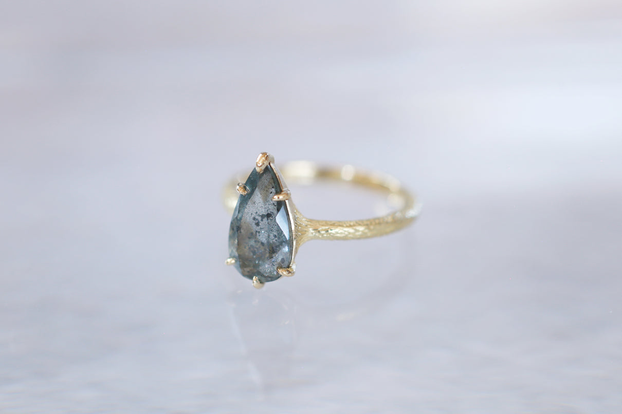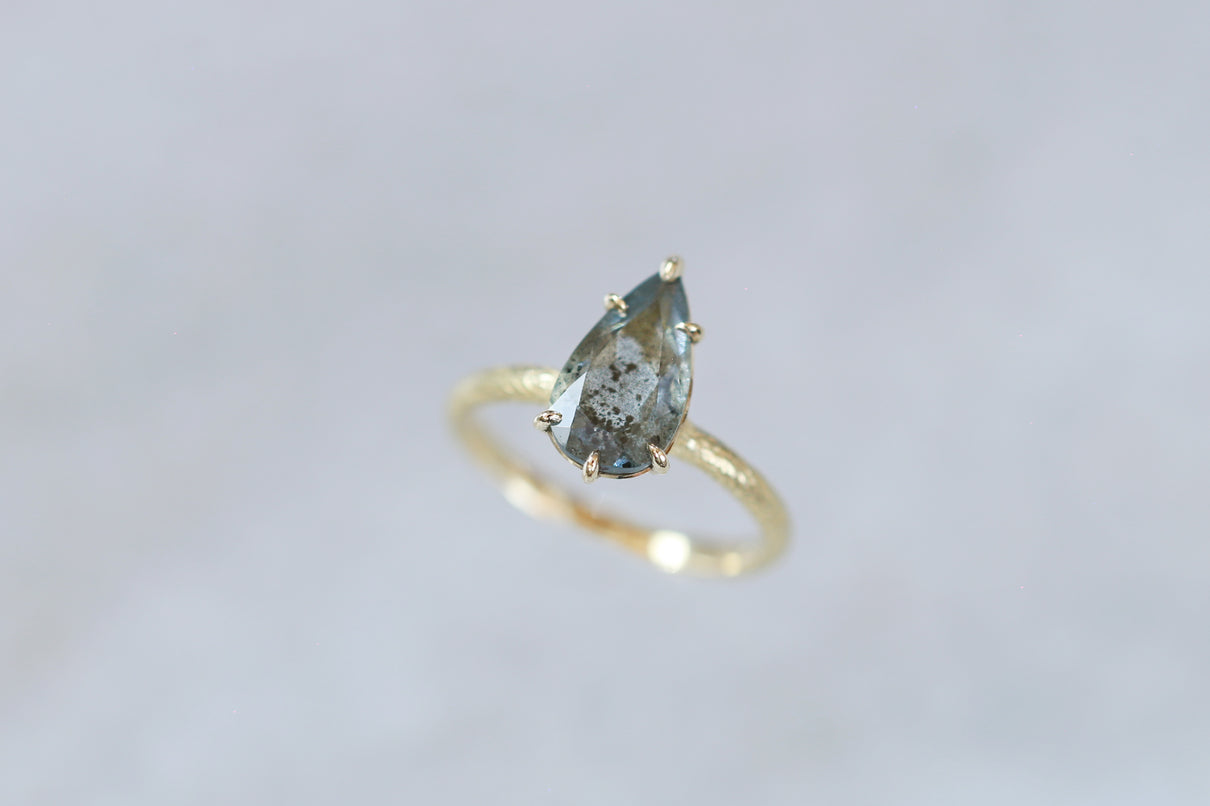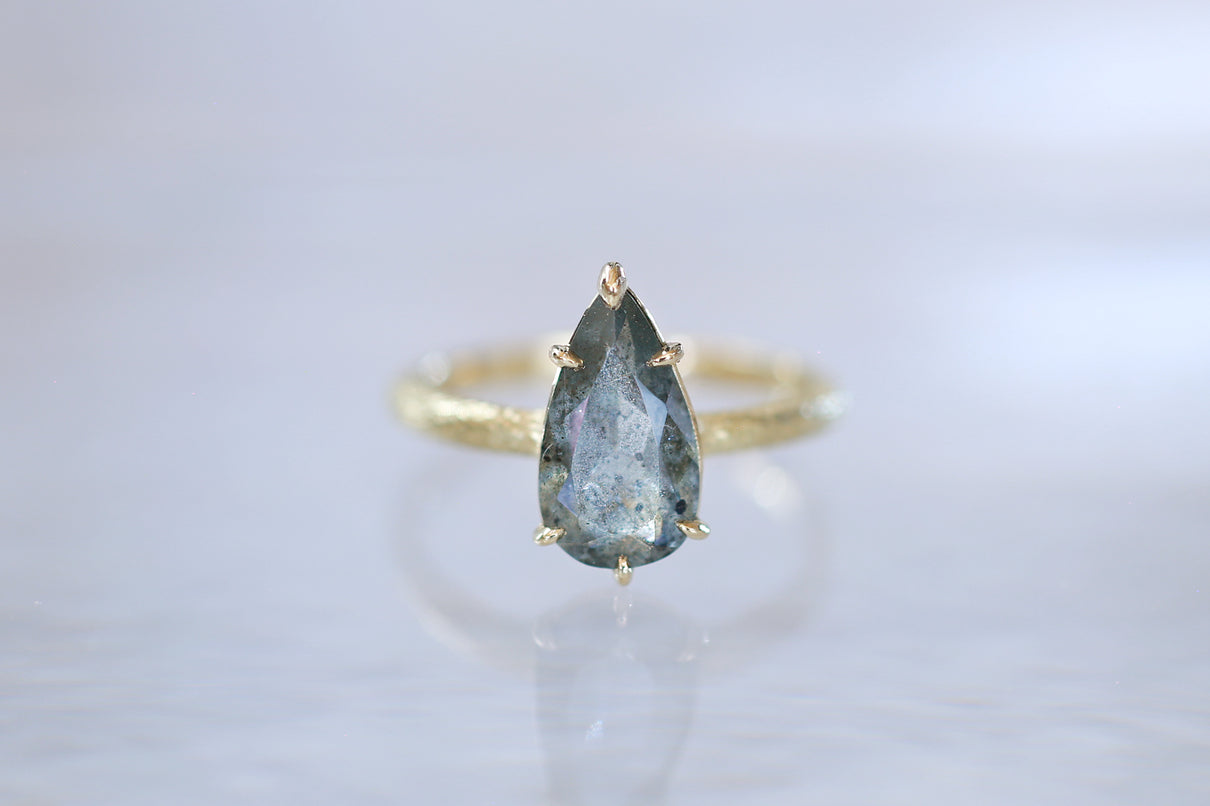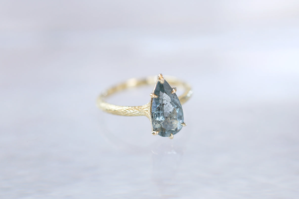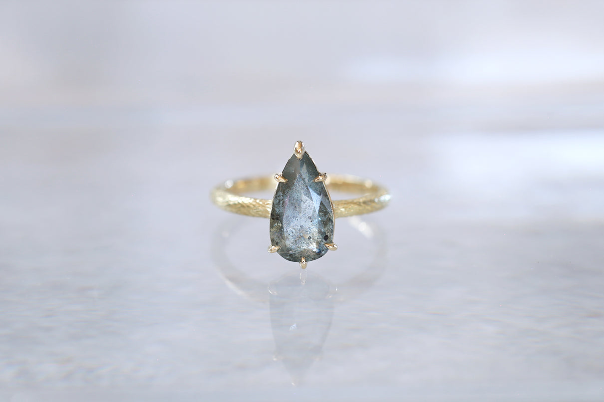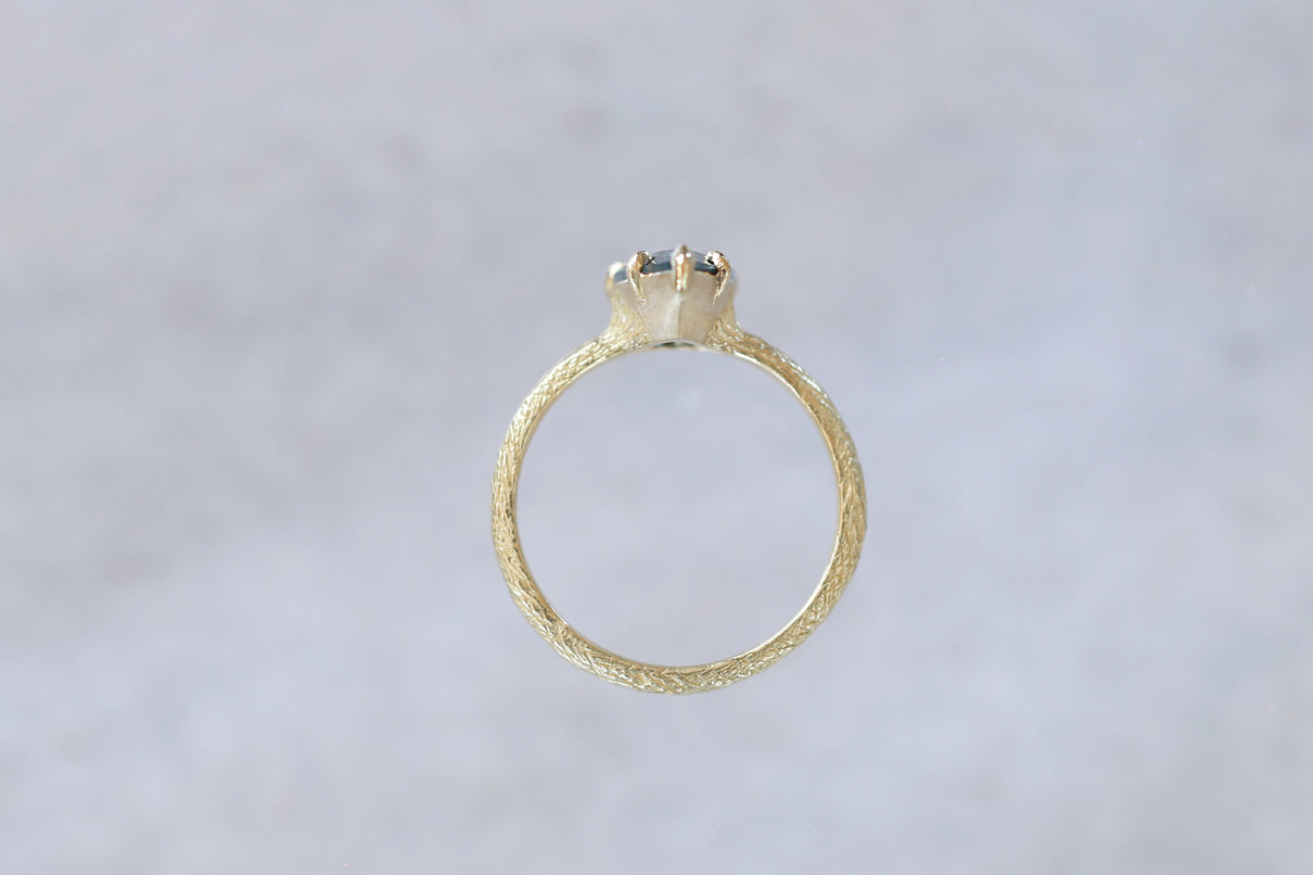 まるで苔のように見えるチタン鉄鉱からなるインクルージョンが複雑に層を成す、個性が光るドロップカットのモスアクアマリンで仕立てた一点もののリング。静寂を纏う有機的な内包物の表面に、角度によって柔らかなシルバーの輝きを放つシラーの対比が素晴らしい、ドロップカットのモスアクアマリン。そんな潤みを滲ませた透明度の高いルースを、華やかな明るさを湛えるイエローゴールドの繊細な6本爪でデザインしました。生物の表皮を覆う有機的で緻密な表情をモチーフにした " Coat " シリーズの手彫り模様のテクスチャーを施したリングは、凹はマット、凸は半光沢仕上げと、それぞれで質感を微妙に変化させ、細部まで手仕事によるこだわりを巡らせています。ひとつとして同じ表現の無い手彫り模様のアームは石の台座を優しく支えるように付き、その対比がモスアクアマリンの魅力を更に趣深く引き立てます。3月の誕生石としても親しまれているアクアマリンは、3月生まれの方の特別なお守りとして贈りものにも最適なアイテムです。