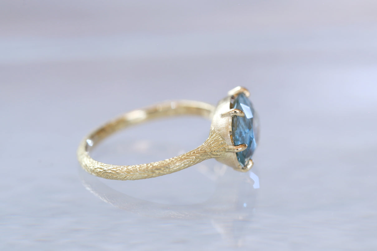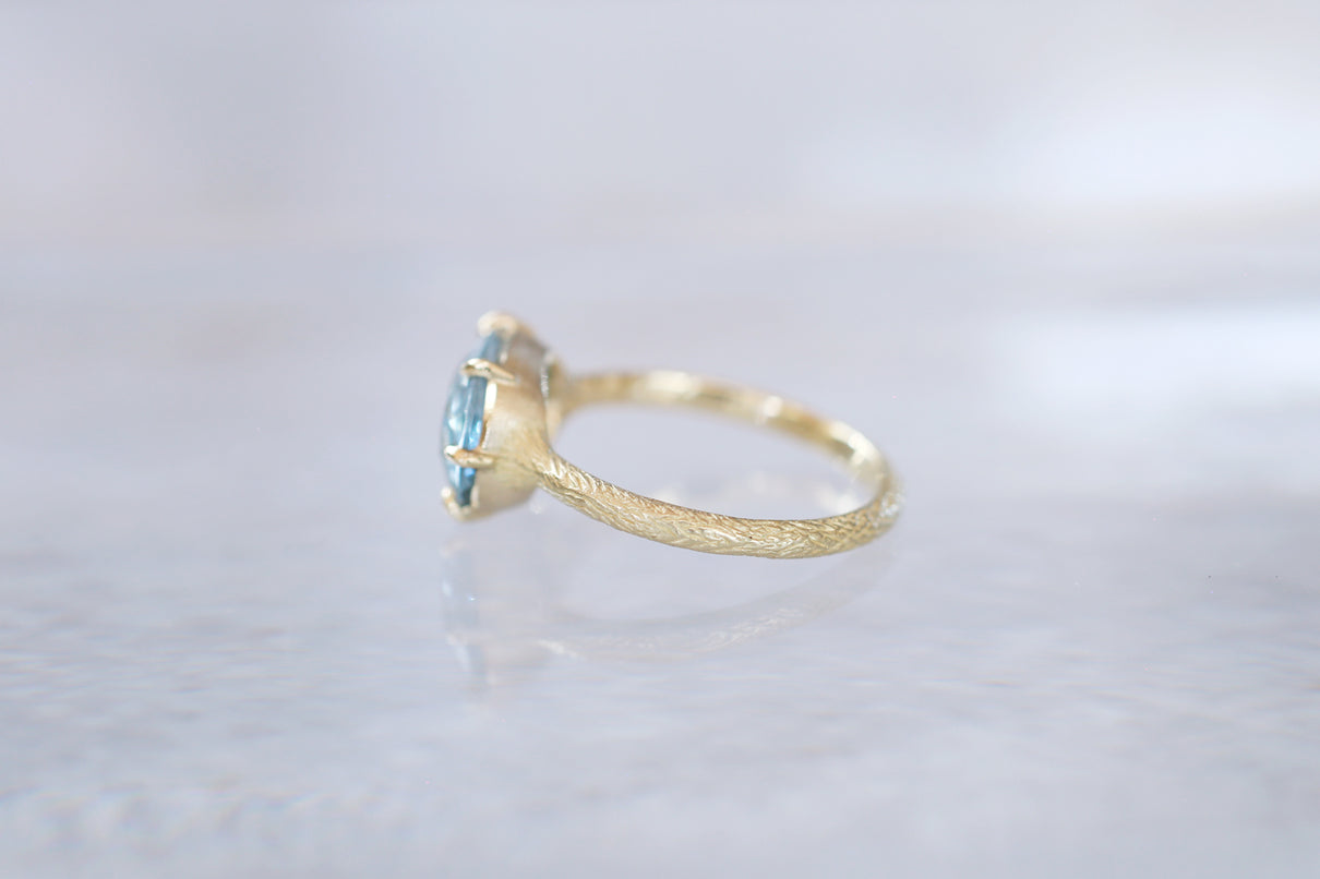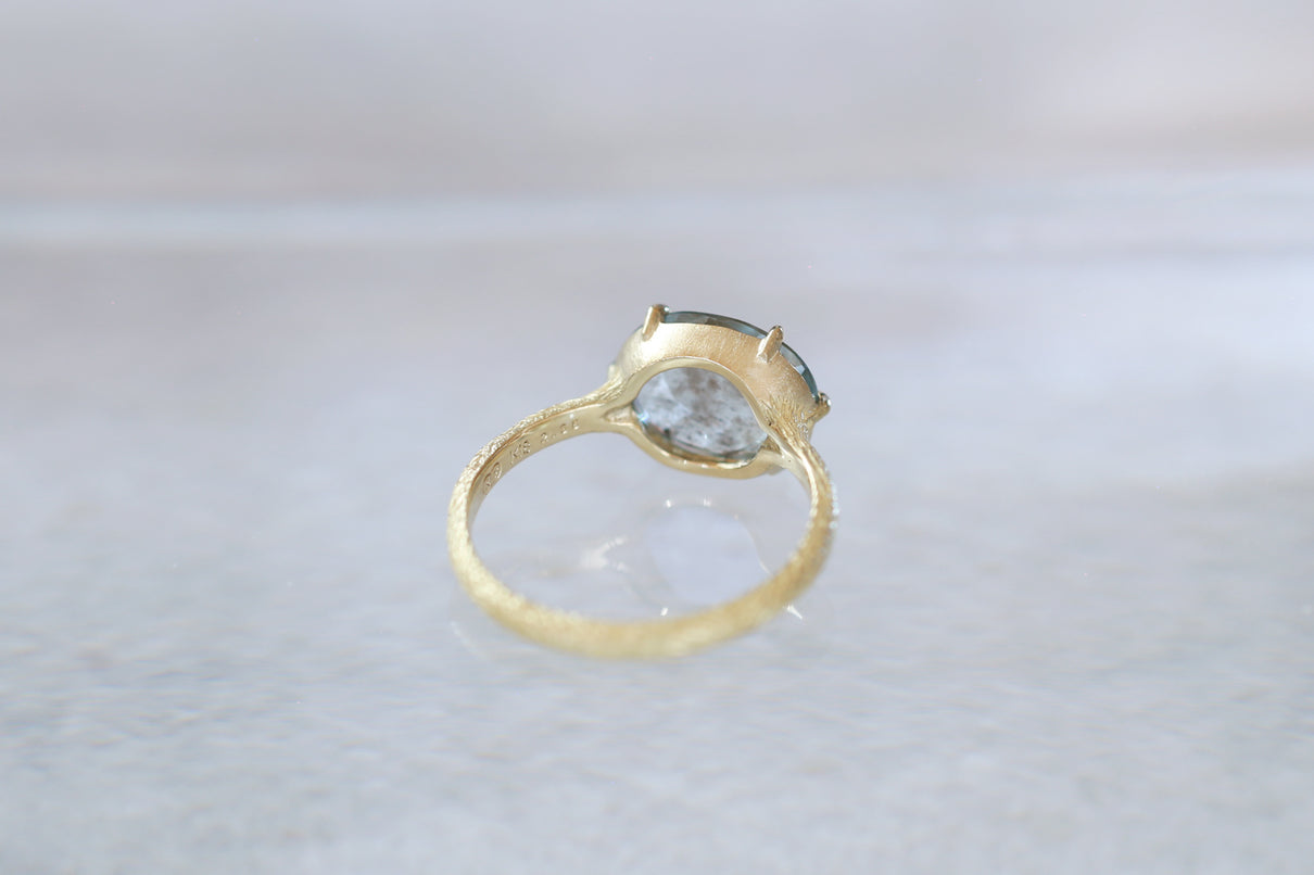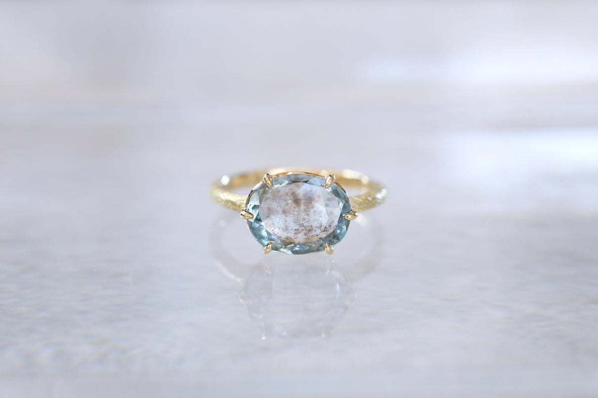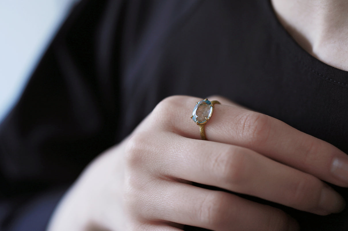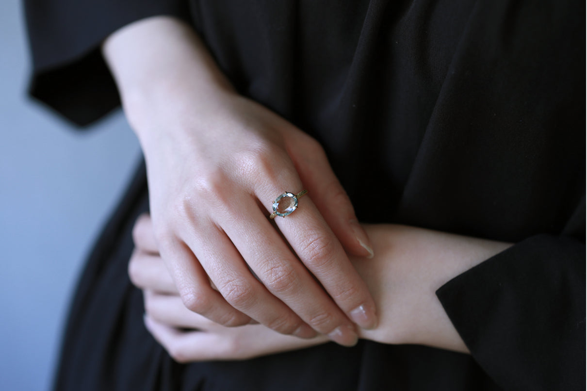 まるで苔のように見えるチタン鉄鉱からなるインクルージョンが複雑に層を成す、個性が光るオーバルカットのモスアクアマリンで仕立てた一点もののリング。特に高い透明度を誇るアクアマリンが魅力のオーバルカットは、柔らかく広がる雲のような箔状の煌めきを内包し、角度を変えるたび立体的にその輝きが見え隠れします。そんな柔らかな内包物が印象的なルースを、華やかな明るさを湛えるイエローゴールドの繊細な6本爪でデザインしました。生物の表皮を覆う有機的で緻密な表情をモチーフにした " Coat " シリーズの手彫り模様のテクスチャーを施したリングは、凹はマット、凸は半光沢仕上げと、それぞれで質感を微妙に変化させ、細部まで手仕事によるこだわりを巡らせています。ひとつとして同じ表現の無い手彫り模様のアームは石の台座を優しく支えるように付き、その対比がモスアクアマリンの魅力を更に趣深く引き立てます。3月の誕生石としても親しまれているアクアマリンは、3月生まれの方の特別なお守りとして贈りものにも最適なアイテムです。