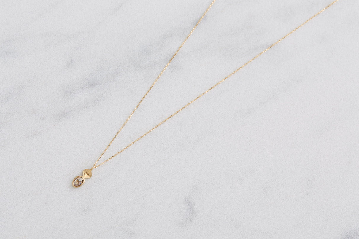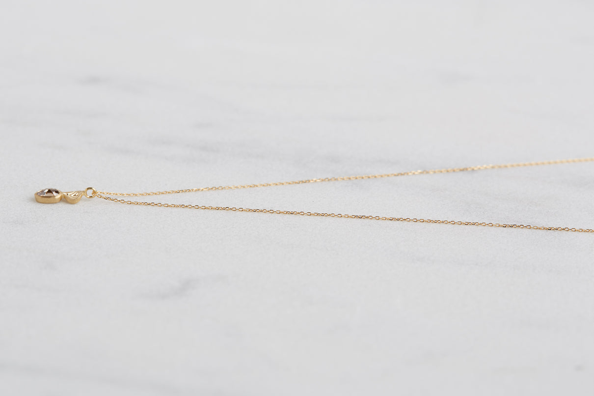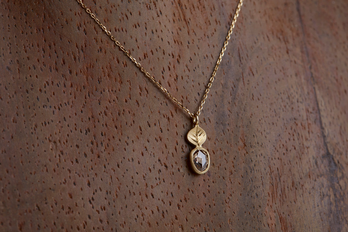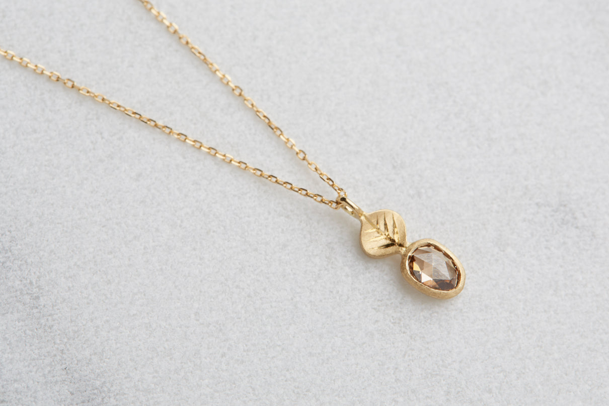 手彫りの葉脈が煌めく小さな葉っぱモチーフのゴールドパーツに、下に向かってやや細くなるオーバルカットのダイヤモンドを留めた " Leaf " コレクションのネックレス。透明度が高く、潤みを帯びた瑞々しいローズカットのブラウンカラーダイヤモンドを、覆輪留めで優しく包み込むようにセッティングしました。小さく繊細なトップながらも、思わず笑みを浮かべてしまうようなシックな存在感を秘めた、日常の装いを品よく引き立てるデザインです。