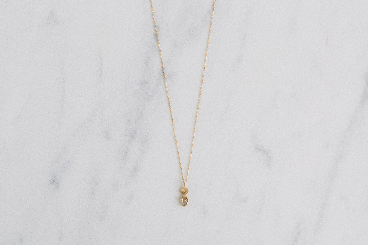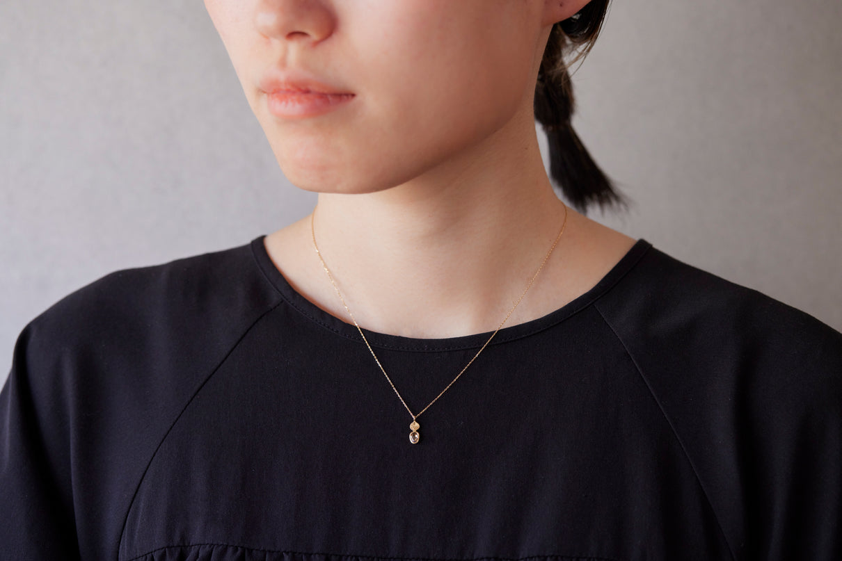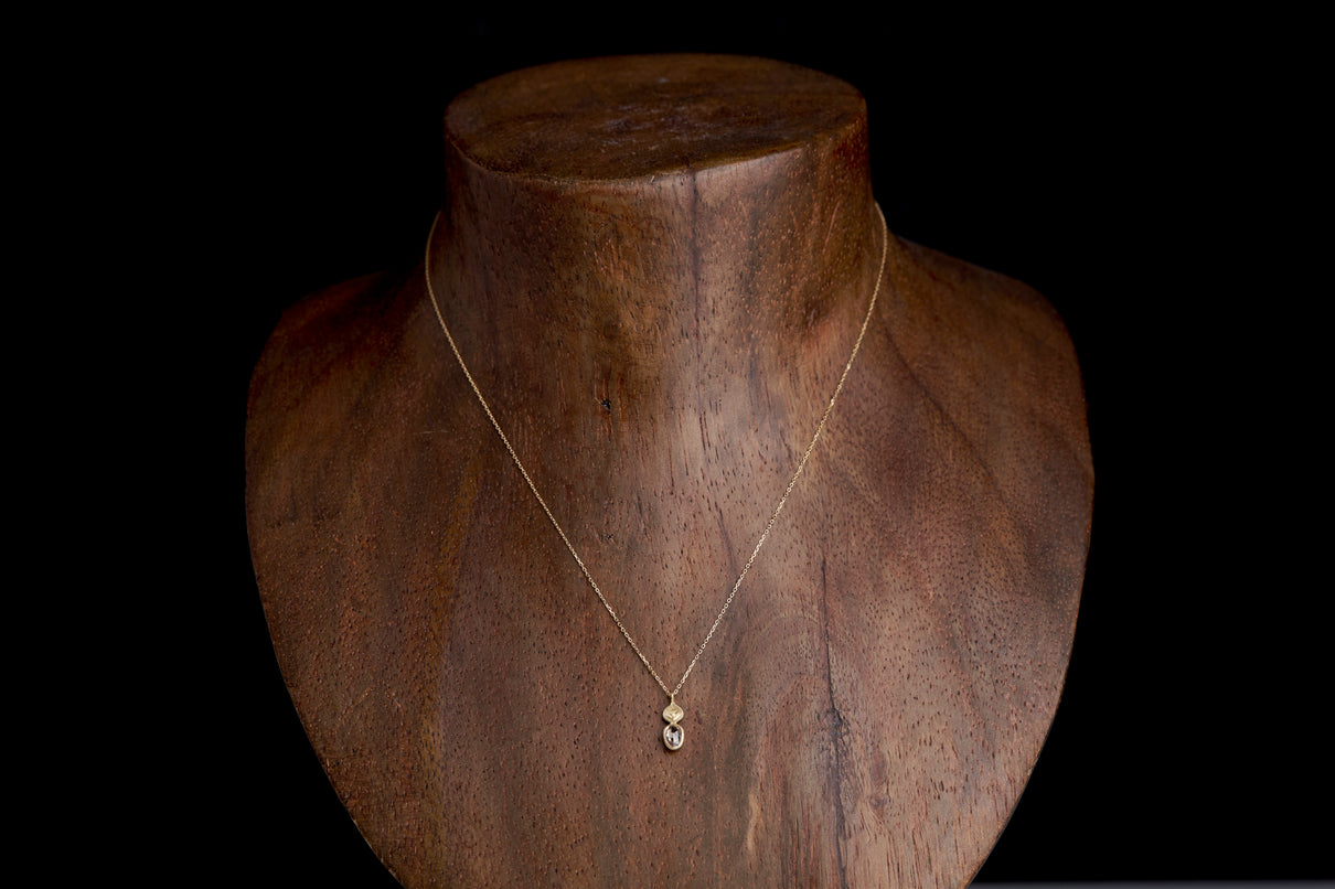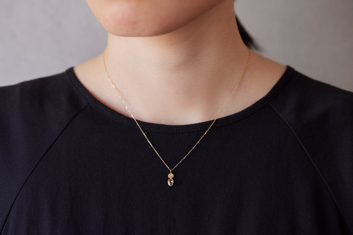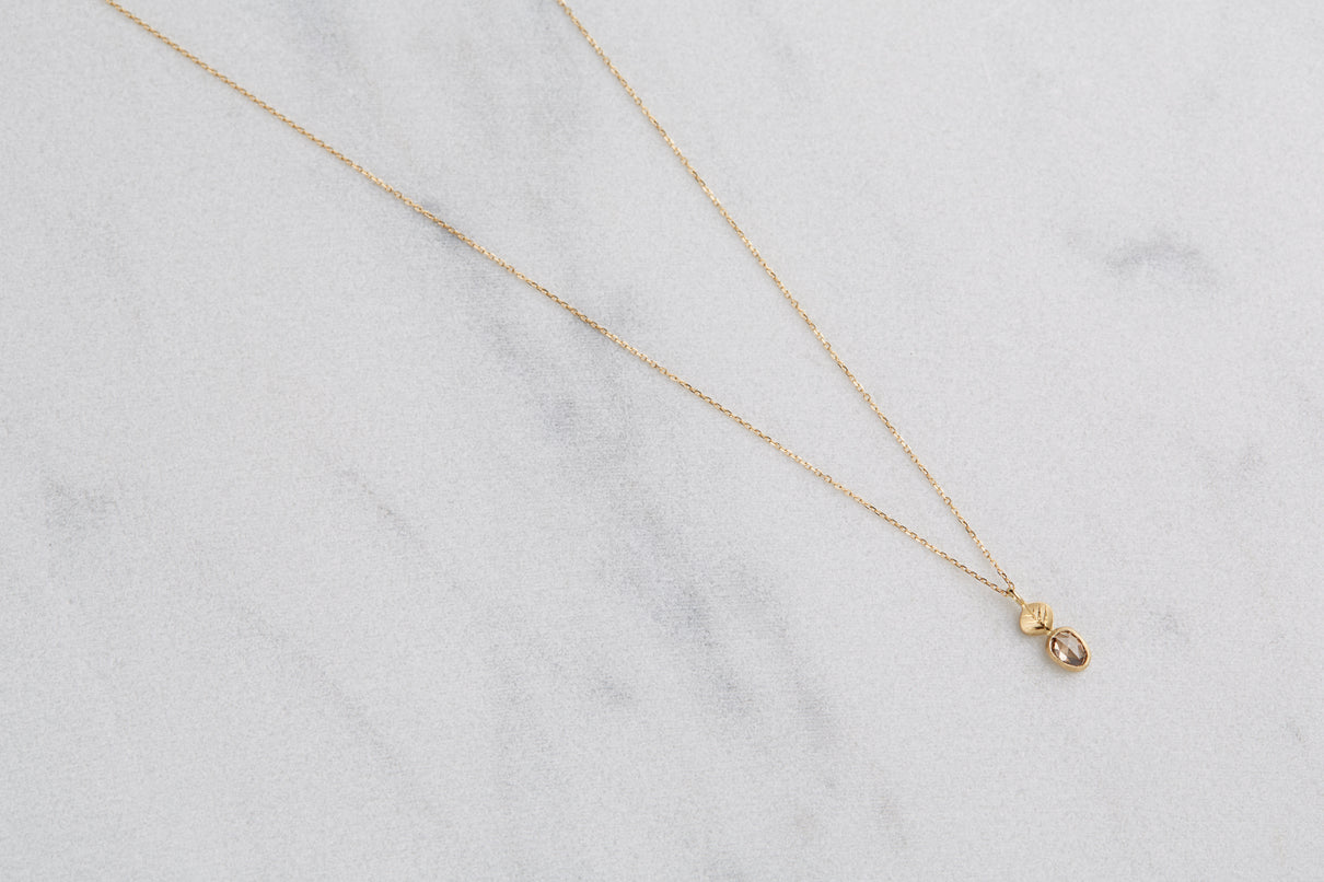 手彫りの葉脈が煌めく小さな葉っぱモチーフのゴールドパーツに、下に向かってやや細くなるオーバルカットのダイヤモンドを留めた " Leaf " コレクションのネックレス。透明度が高く、潤みを帯びた瑞々しいローズカットのブラウンカラーダイヤモンドを、覆輪留めで優しく包み込むようにセッティングしました。小さく繊細なトップながらも、思わず笑みを浮かべてしまうようなシックな存在感を秘めた、日常の装いを品よく引き立てるデザインです。