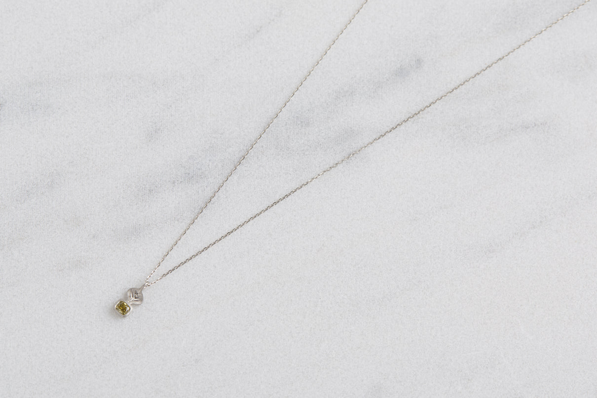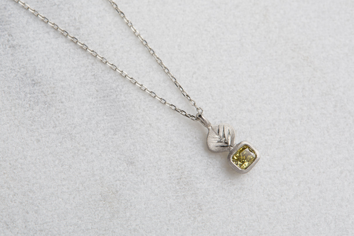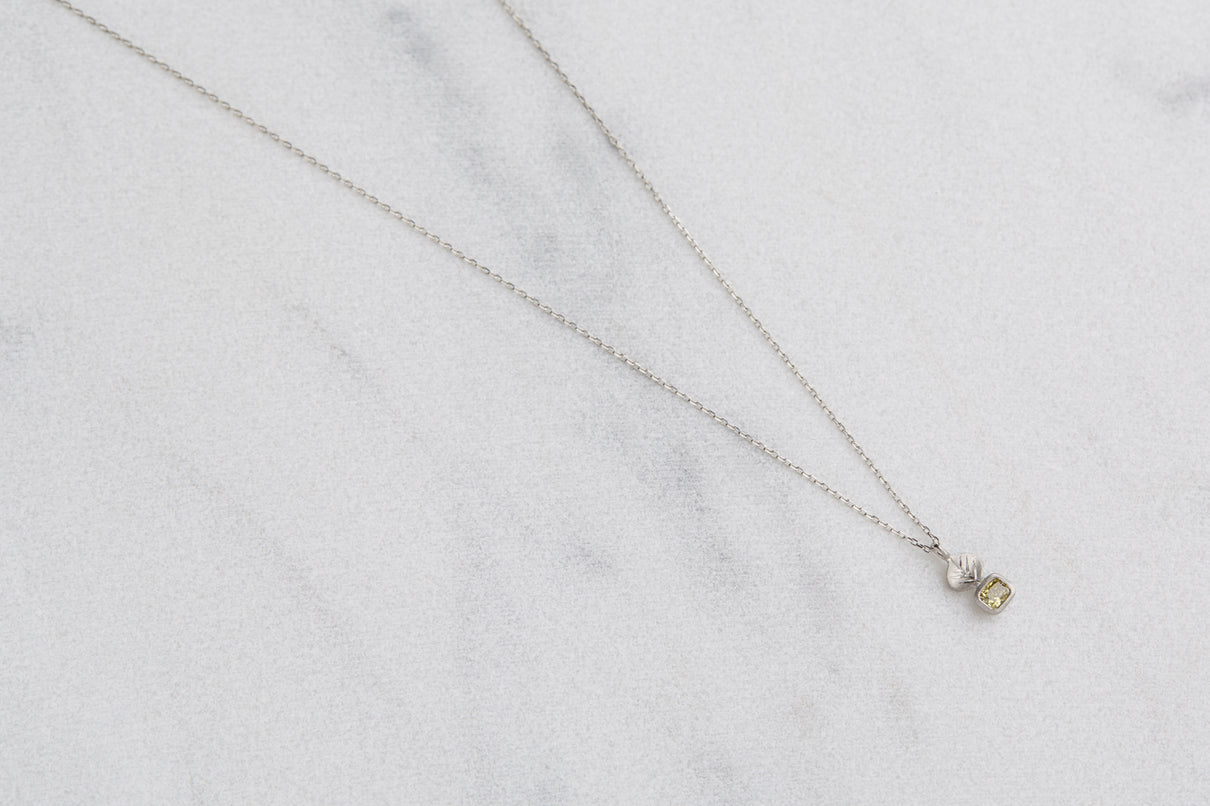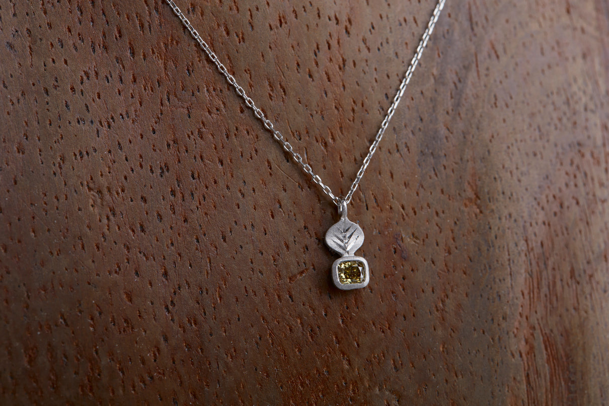 手彫りの葉脈が煌めく小さな葉っぱモチーフのプラチナパーツに、正方形に近いスクエアカットのダイヤモンドを留めた " Leaf " コレクションのネックレス。ファセットの煌めきに奥行きを感じさせるイエローダイヤモンドを、覆輪留めで優しく包み込むようにセッティングしました。小さく繊細な存在でありながら、さりげないひと匙の個性と印象的な魅力を秘めた、日常の装いを品よく引き立てるデザインです。