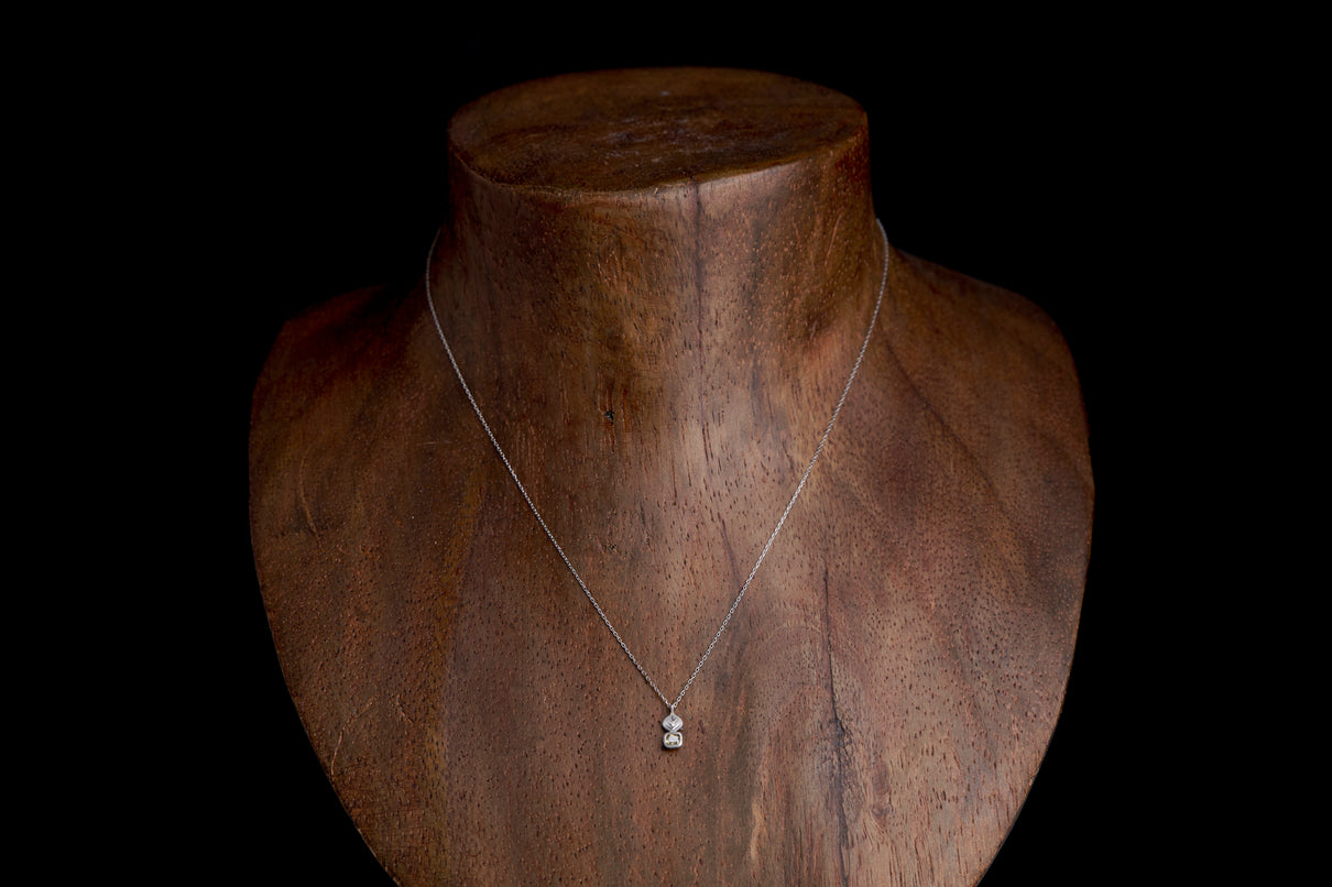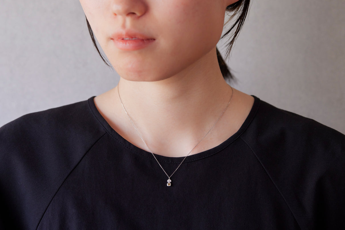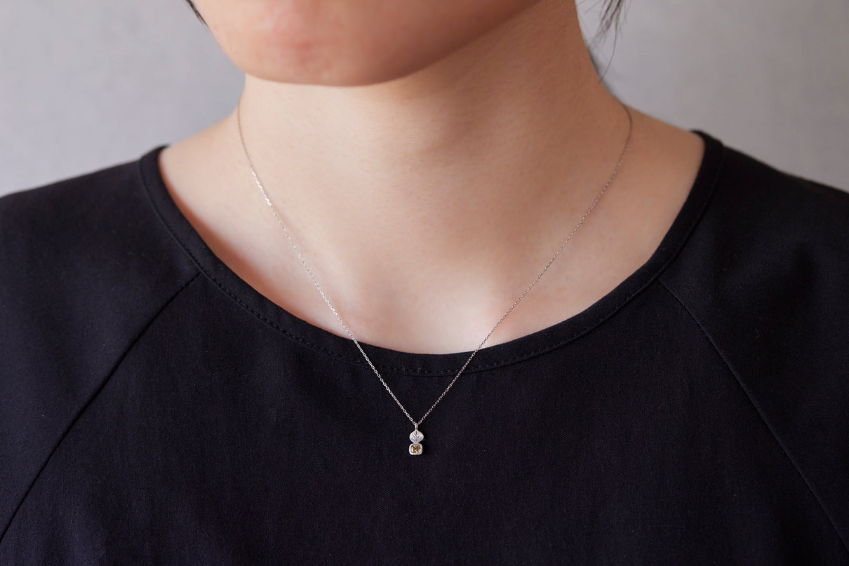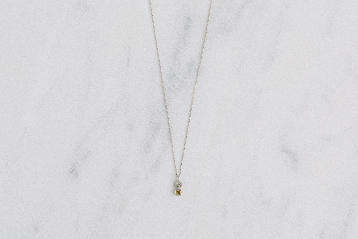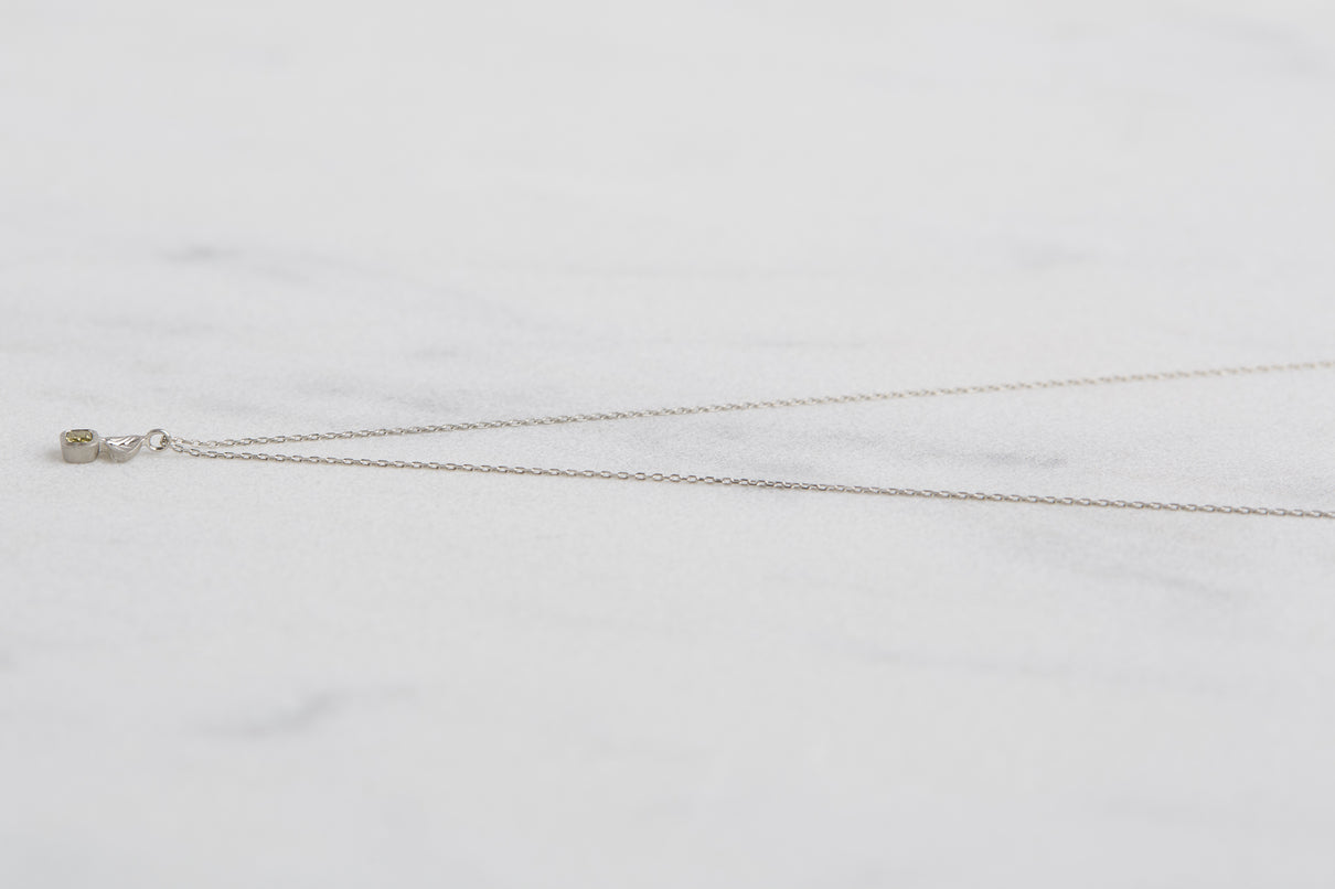 手彫りの葉脈が煌めく小さな葉っぱモチーフのプラチナパーツに、正方形に近いスクエアカットのダイヤモンドを留めた " Leaf " コレクションのネックレス。ファセットの煌めきに奥行きを感じさせるイエローダイヤモンドを、覆輪留めで優しく包み込むようにセッティングしました。小さく繊細な存在でありながら、さりげないひと匙の個性と印象的な魅力を秘めた、日常の装いを品よく引き立てるデザインです。