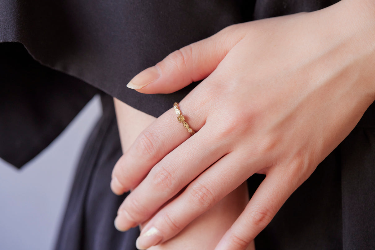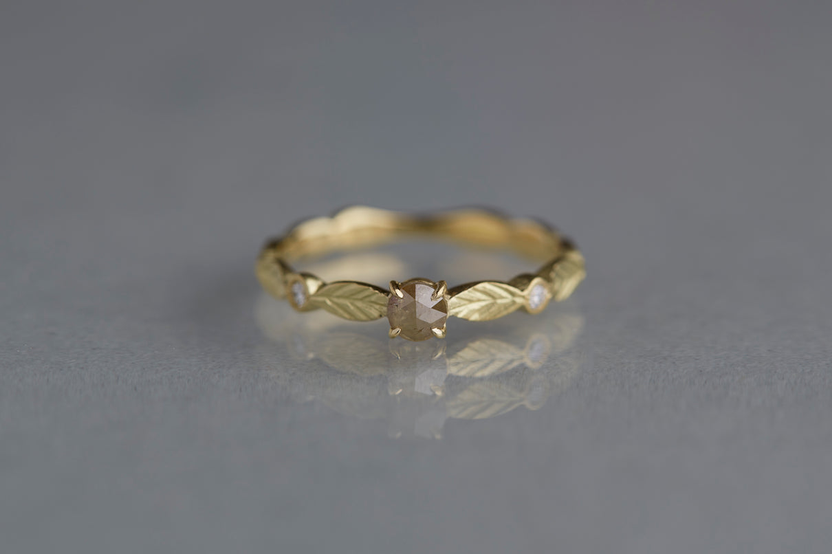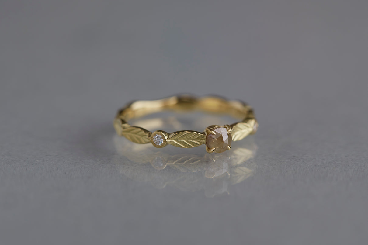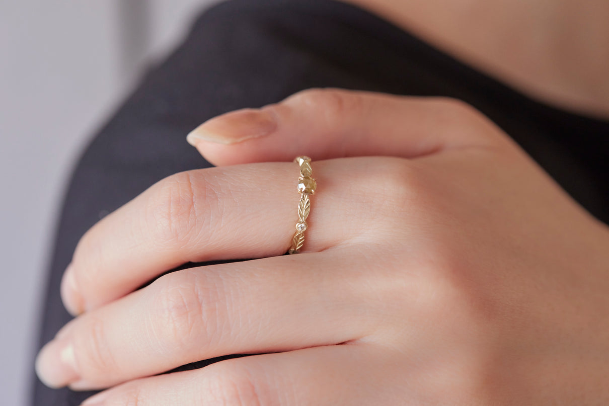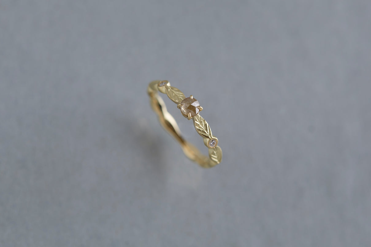 開花の季節を待つ小さな蕾をモチーフにした " Bloom " リング。中央に光を受け円やかに煌めくイエローカラーのローズカットのダイヤモンドを留めました。淡い黄色の中に漂うようなオレンジ色のインクルージョンを持つ、印象的な色彩を見せるダイヤモンドは、一点ものならではの喜びを感じられます。1枚1枚わずかに異なる表情の葉にはマットテクスチャーを施し、柔らかな印象に仕立てました。アーム左右の葉の間に留めた、小さな蕾に見立てた2石のメレダイヤモンドがさりげなくアクセントとなり、繊細なリング手元を華やかに彩ります。