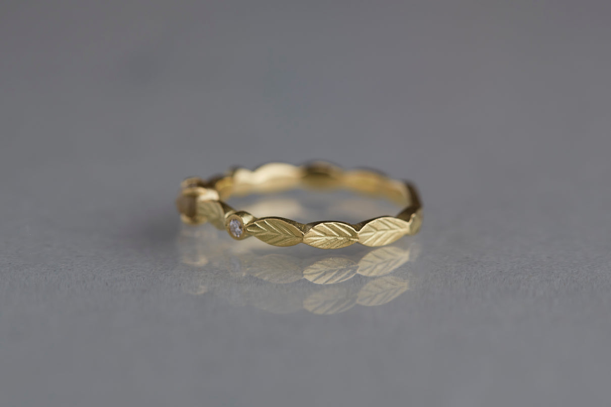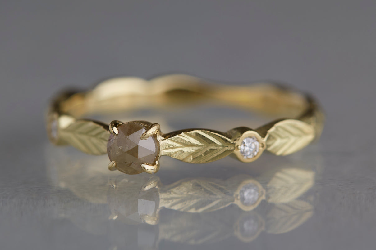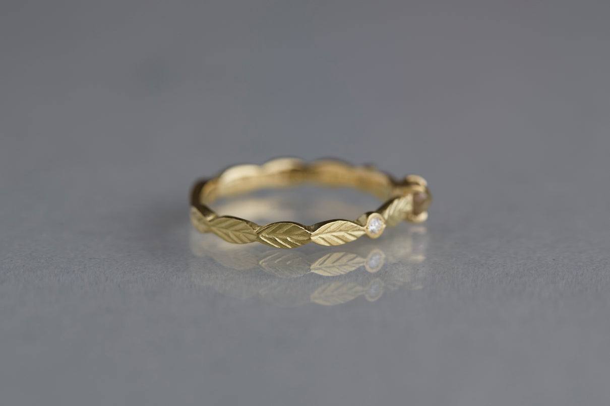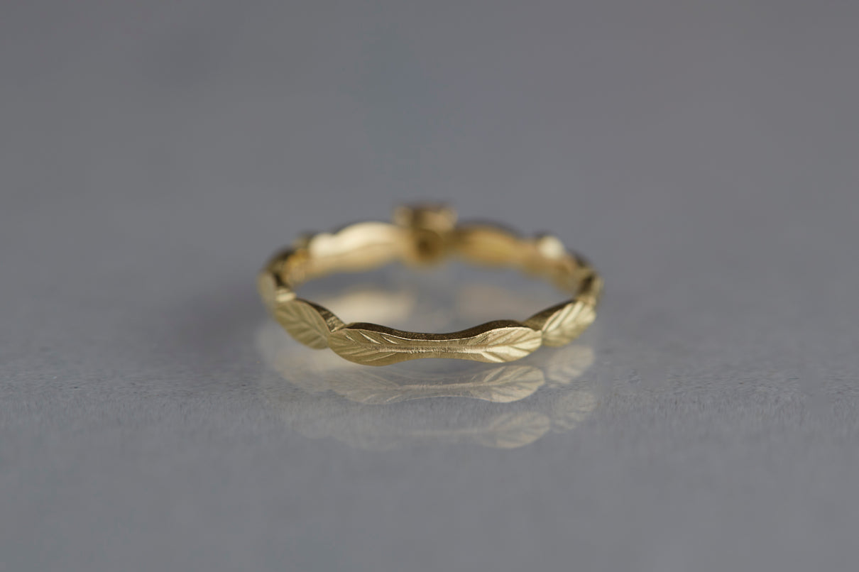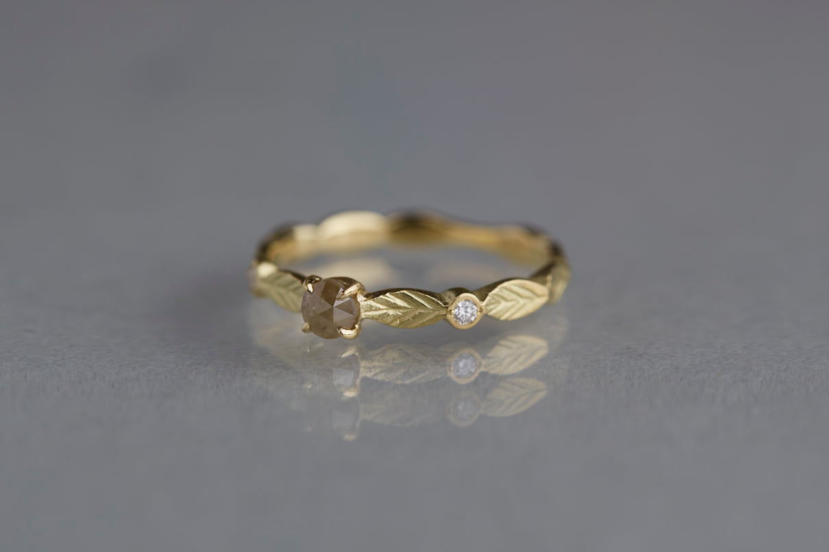 開花の季節を待つ小さな蕾をモチーフにした " Bloom " リング。中央に光を受け円やかに煌めくイエローカラーのローズカットのダイヤモンドを留めました。淡い黄色の中に漂うようなオレンジ色のインクルージョンを持つ、印象的な色彩を見せるダイヤモンドは、一点ものならではの喜びを感じられます。1枚1枚わずかに異なる表情の葉にはマットテクスチャーを施し、柔らかな印象に仕立てました。アーム左右の葉の間に留めた、小さな蕾に見立てた2石のメレダイヤモンドがさりげなくアクセントとなり、繊細なリング手元を華やかに彩ります。
