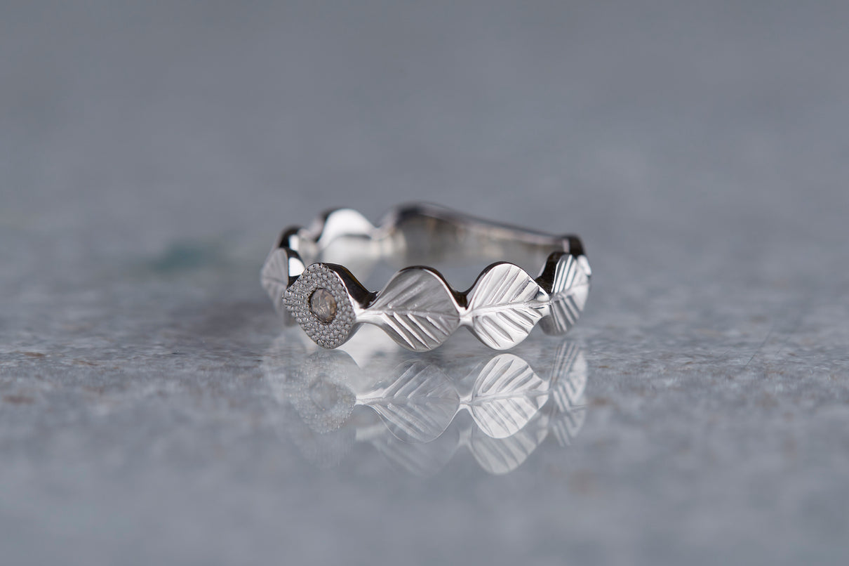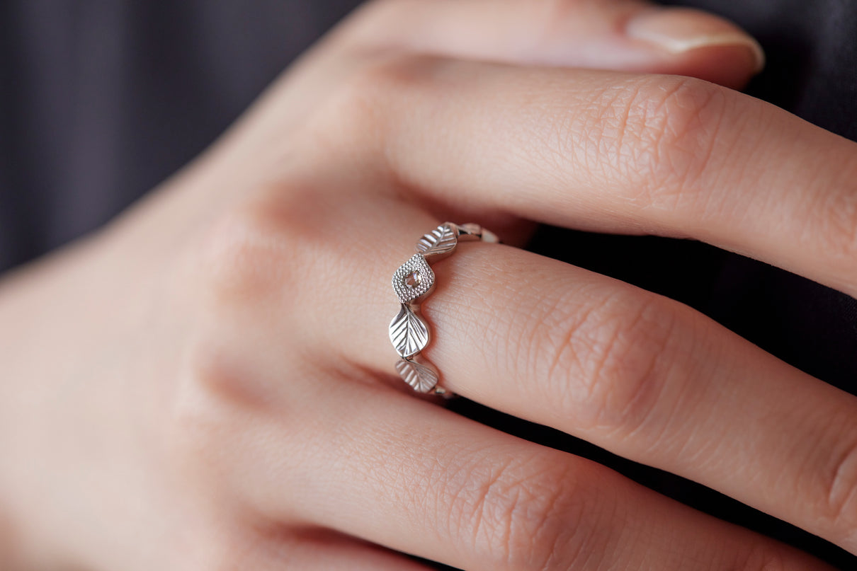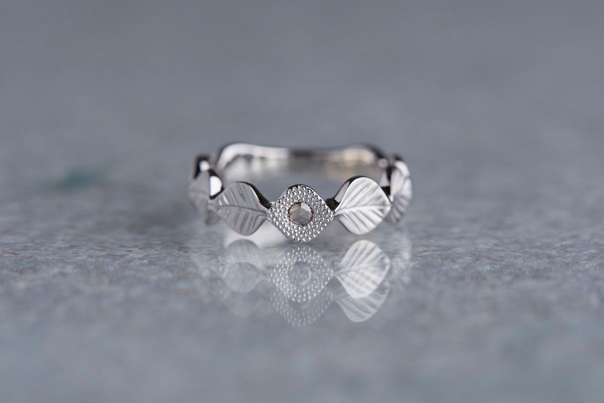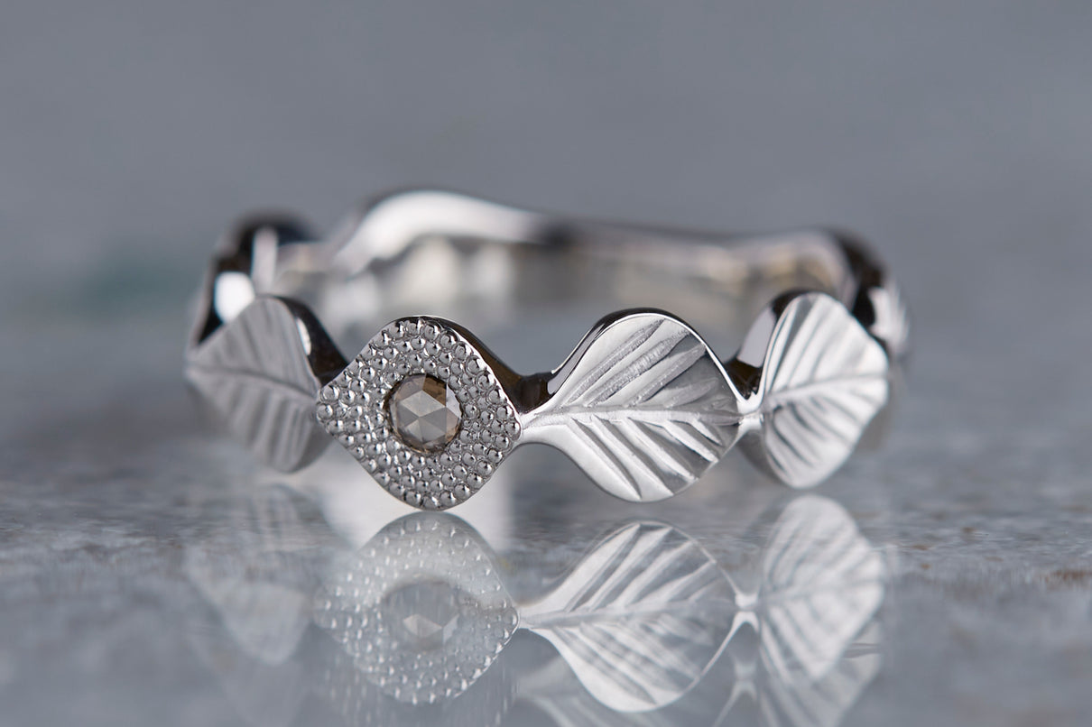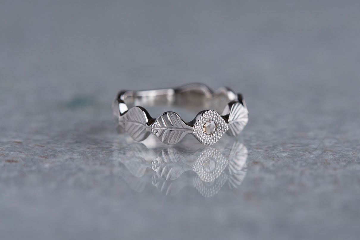 いくつも連なる葉っぱをモチーフに、1枚1枚わずかに異なる表情に遊び心を込めた " Leaf " コレクション。高い透明度を持ち、光を受けささやかに煌めくライトブラウンのローズカットダイヤモンドを、細かな手仕事のミル打ちで贅沢に縁取った一点もののリングです。ダイヤモンドの台座もさりげなく葉っぱをイメージさせるシェイプに仕立て、全体に滑らかなリズムを与えました。有機的なデザインに上品な静けさを添えるプラチナのリングアーム。装いの主役として日常的に身に着けていただくのはもちろん、特別な贈りものにも最適なアイテムです。