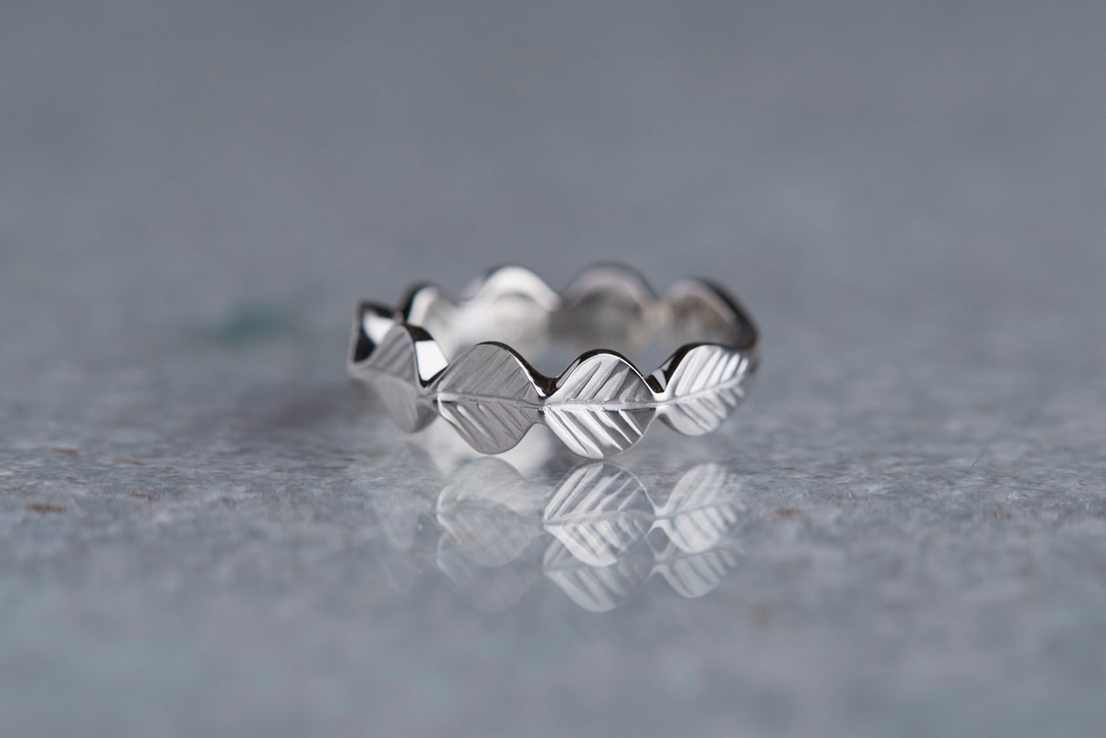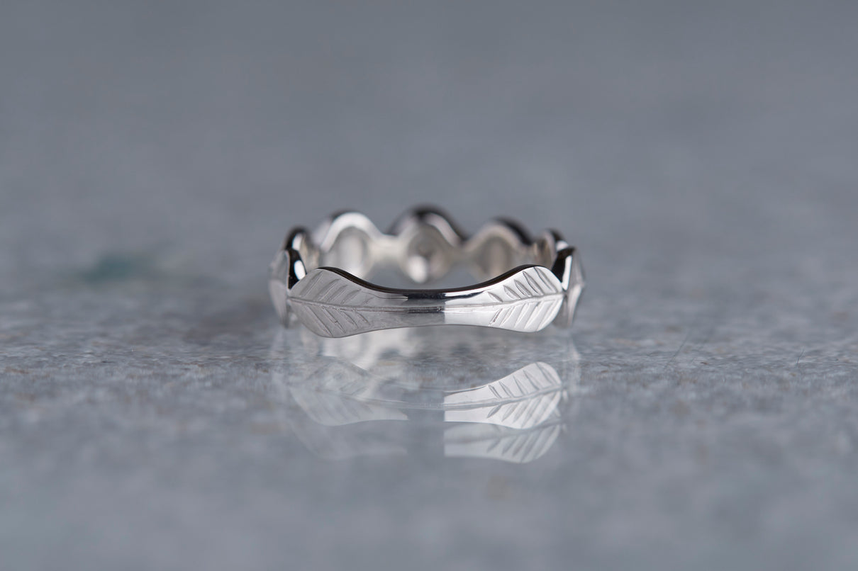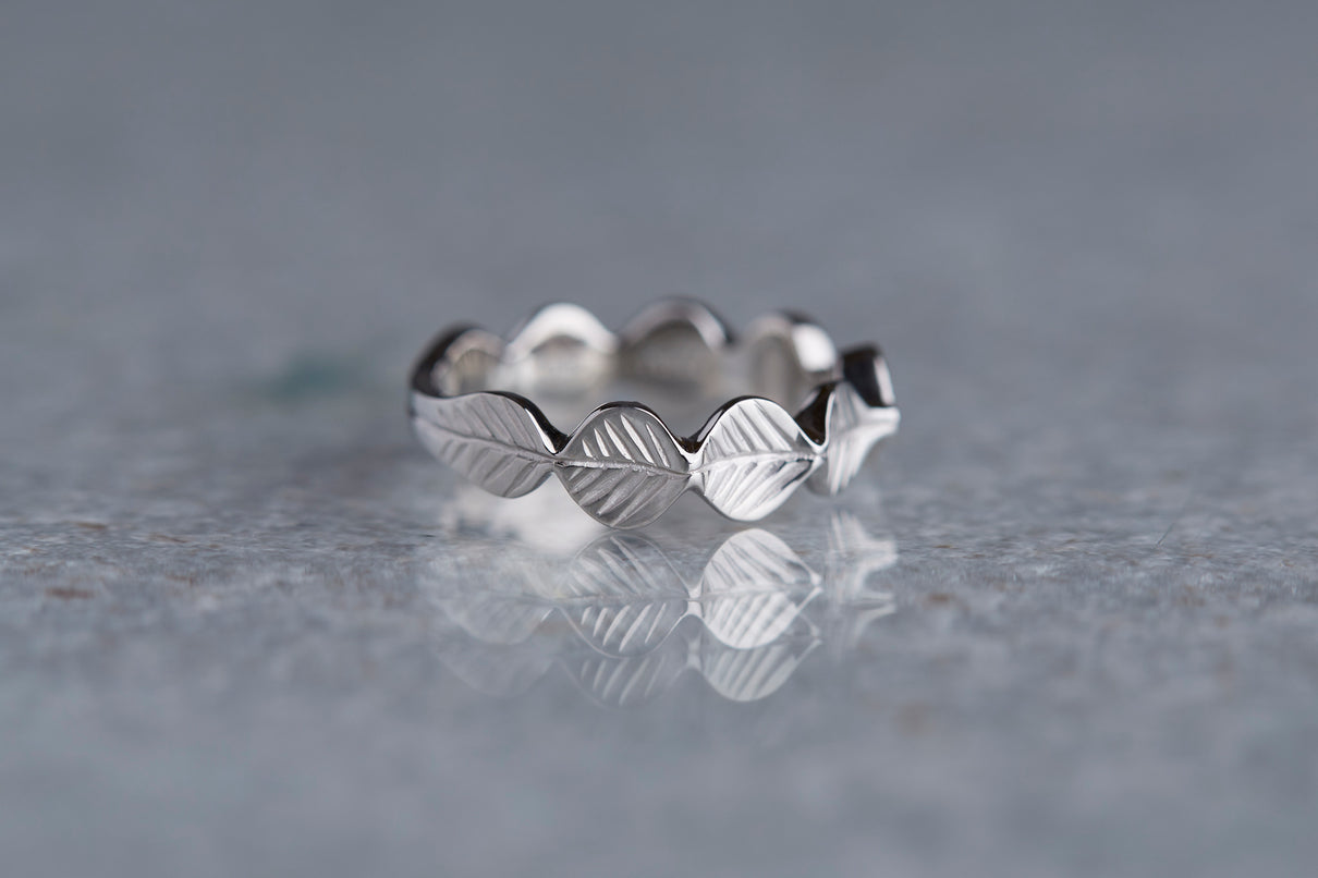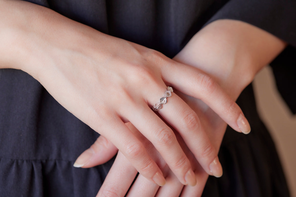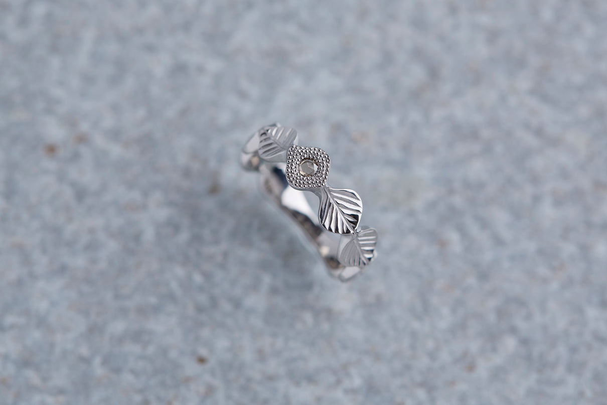 いくつも連なる葉っぱをモチーフに、1枚1枚わずかに異なる表情に遊び心を込めた " Leaf " コレクション。高い透明度を持ち、光を受けささやかに煌めくライトブラウンのローズカットダイヤモンドを、細かな手仕事のミル打ちで贅沢に縁取った一点もののリングです。ダイヤモンドの台座もさりげなく葉っぱをイメージさせるシェイプに仕立て、全体に滑らかなリズムを与えました。有機的なデザインに上品な静けさを添えるプラチナのリングアーム。装いの主役として日常的に身に着けていただくのはもちろん、特別な贈りものにも最適なアイテムです。