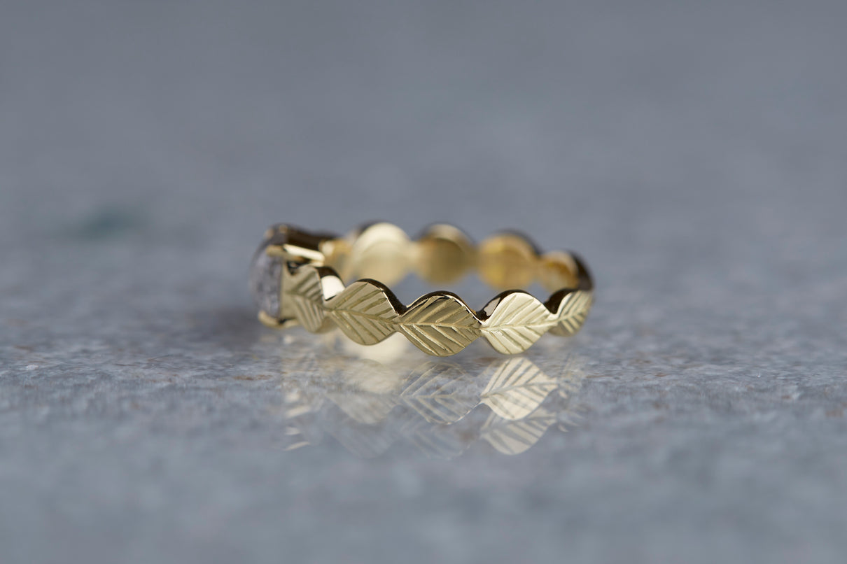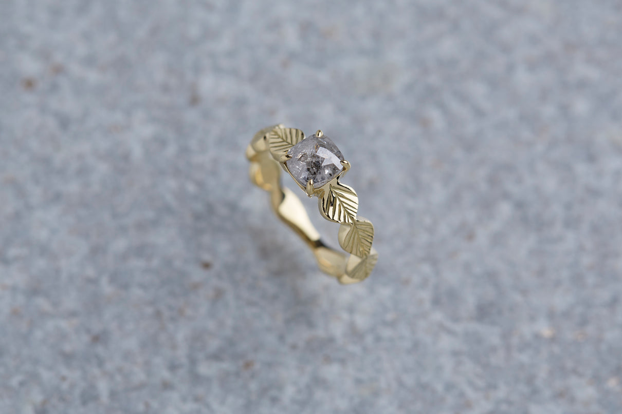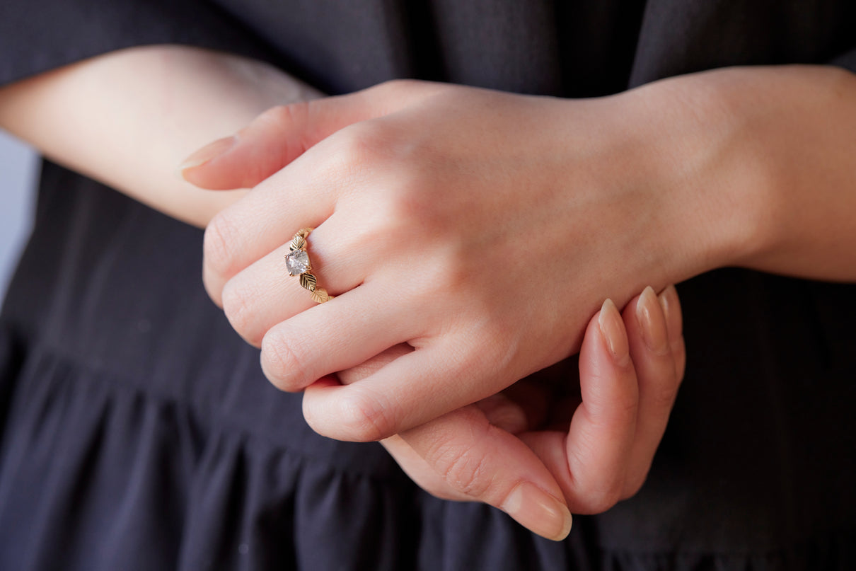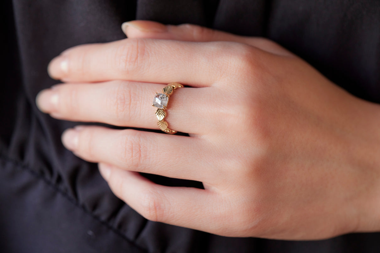 いくつも連なる葉っぱをモチーフに、1枚1枚わずかに異なる表情に遊び心を込めた " Leaf " コレクション。透明と不透明が美しく混ざり合う奥深いインクルージョンを持ち、壮大なスケール感を感じさせるギャラクシーダイヤモンドは、その名の通り宇宙の銀河を連想させる佇まいが魅力です。約0.86ctの圧倒的な存在感を放つこのギャラクシーダイヤモンドを最大限に引き立てるよう、繊細な4本爪で留めた一点もののリング。ひとつで十分な華やぎを湛えるデザインは日常の装いにも馴染み、特別なシーンや装いも一層心高鳴るものへと昇華させます。
