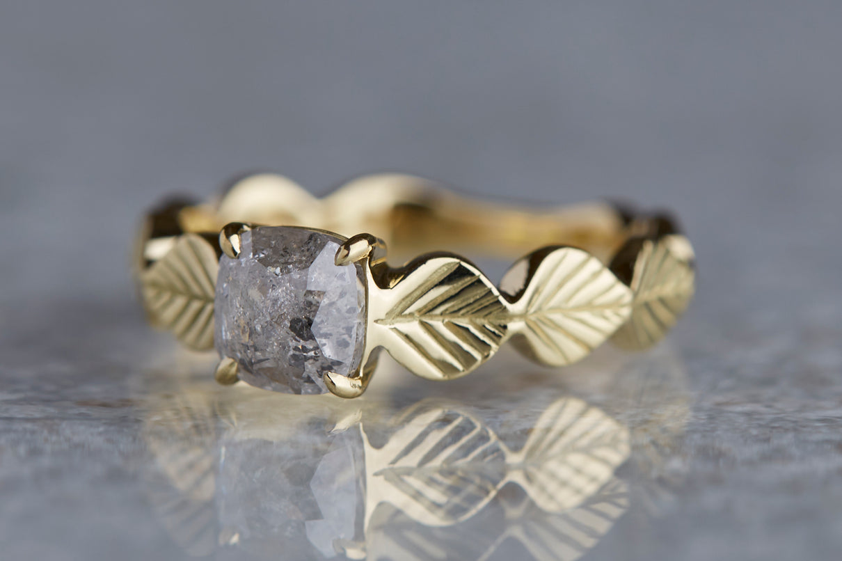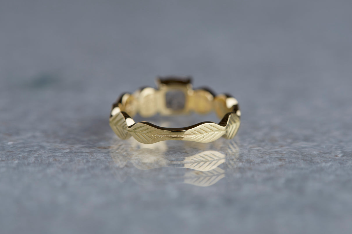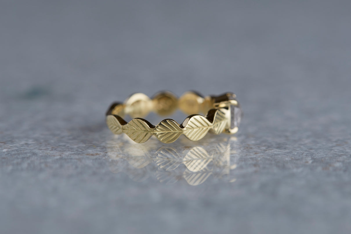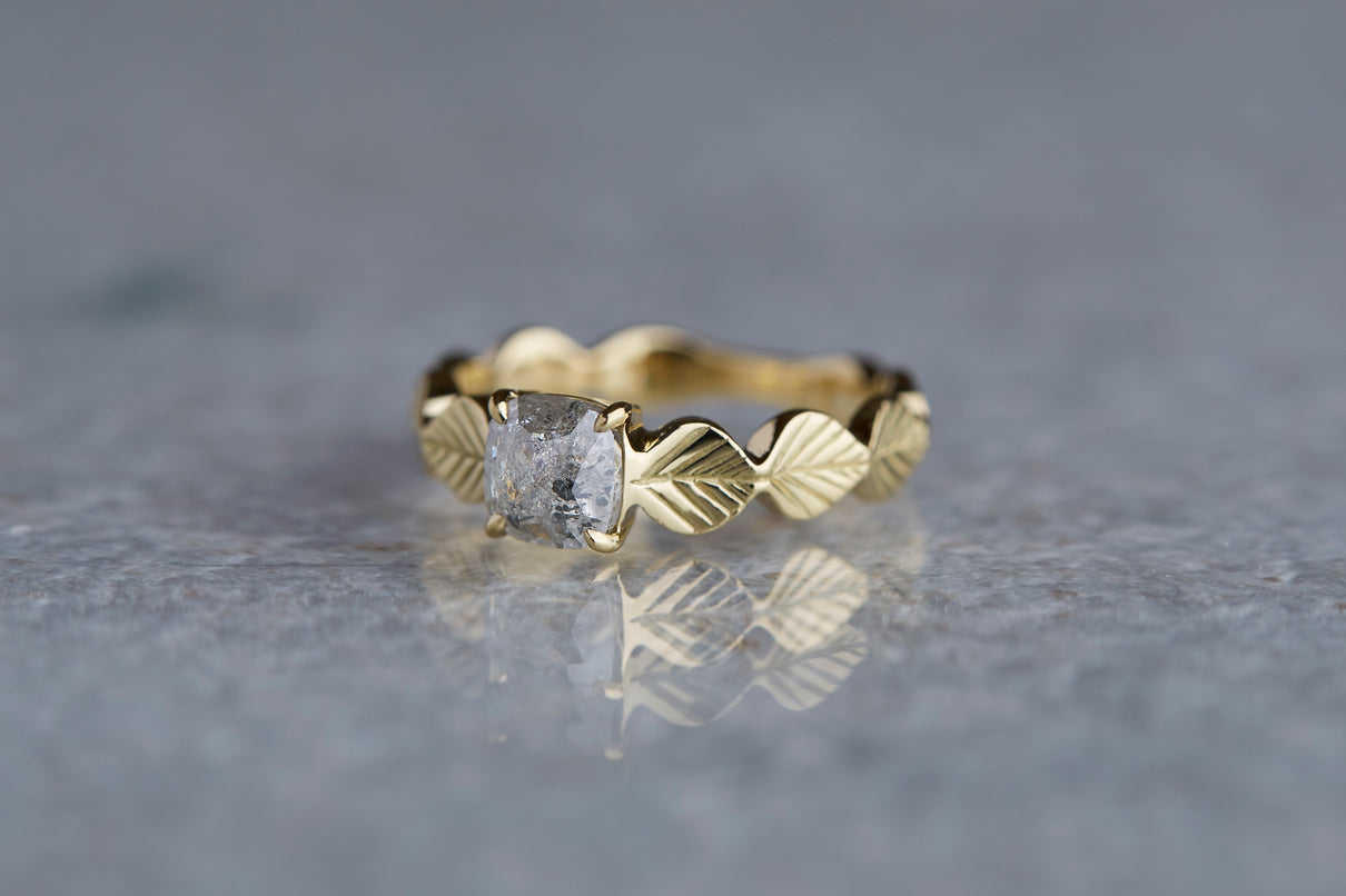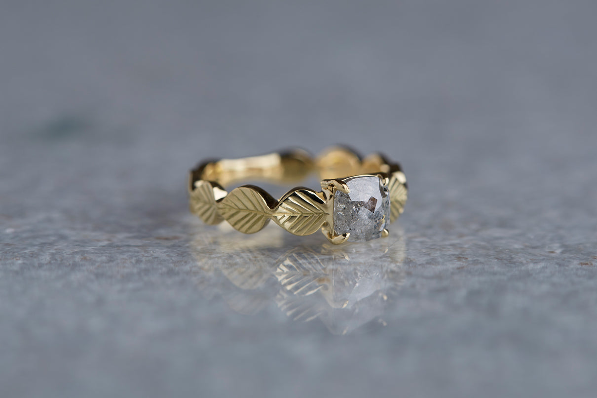いくつも連なる葉っぱをモチーフに、1枚1枚わずかに異なる表情に遊び心を込めた " Leaf " コレクション。透明と不透明が美しく混ざり合う奥深いインクルージョンを持ち、壮大なスケール感を感じさせるギャラクシーダイヤモンドは、その名の通り宇宙の銀河を連想させる佇まいが魅力です。約0.86ctの圧倒的な存在感を放つこのギャラクシーダイヤモンドを最大限に引き立てるよう、繊細な4本爪で留めた一点もののリング。ひとつで十分な華やぎを湛えるデザインは日常の装いにも馴染み、特別なシーンや装いも一層心高鳴るものへと昇華させます。