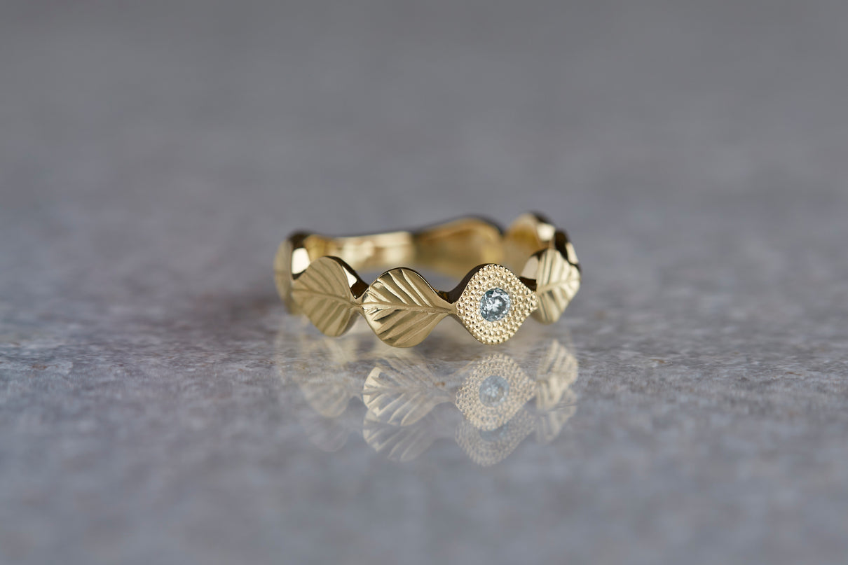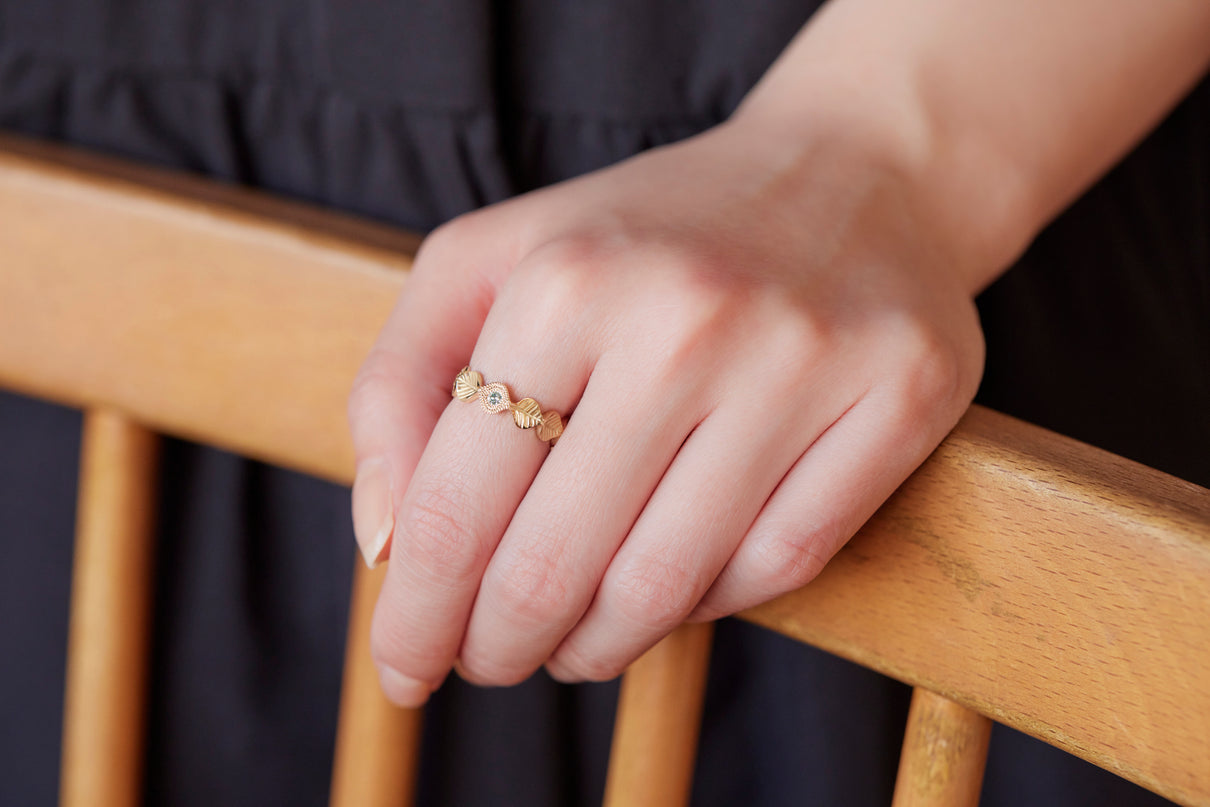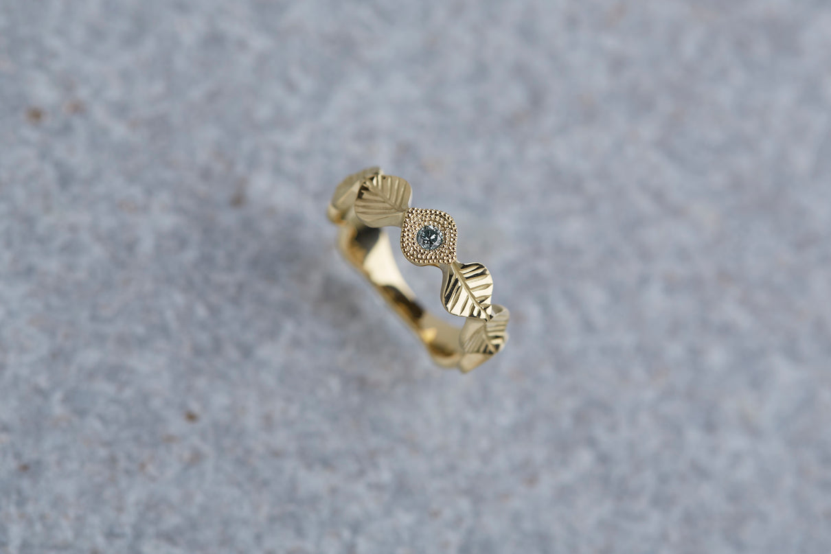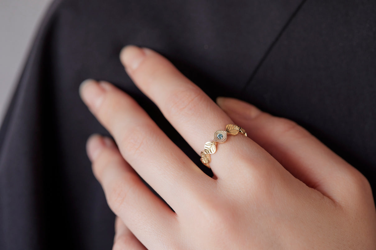 いくつも連なる葉っぱをモチーフに、1枚1枚わずかに異なる表情に遊び心を込めた " Leaf " コレクション。海の遠浅に見られる鮮やかなシーグリーンのブリリアントカットのダイヤモンドを、細かな手仕事のミル打ちで贅沢に縁取った一点もののリングです。ダイヤモンドの台座もさりげなく葉っぱをイメージさせるシェイプに仕立て、全体に滑らかなリズムを与えました。シーグリーンとイエローゴールドのコントラストが華やかに映え、その対比によりゴールドに施された細やかな手仕事をより際やかに感じていただけます。装いの主役として日常的に身に着けていただくのはもちろん、特別な贈りものにも最適なアイテムです。