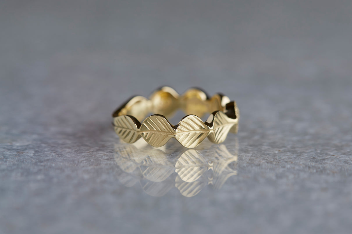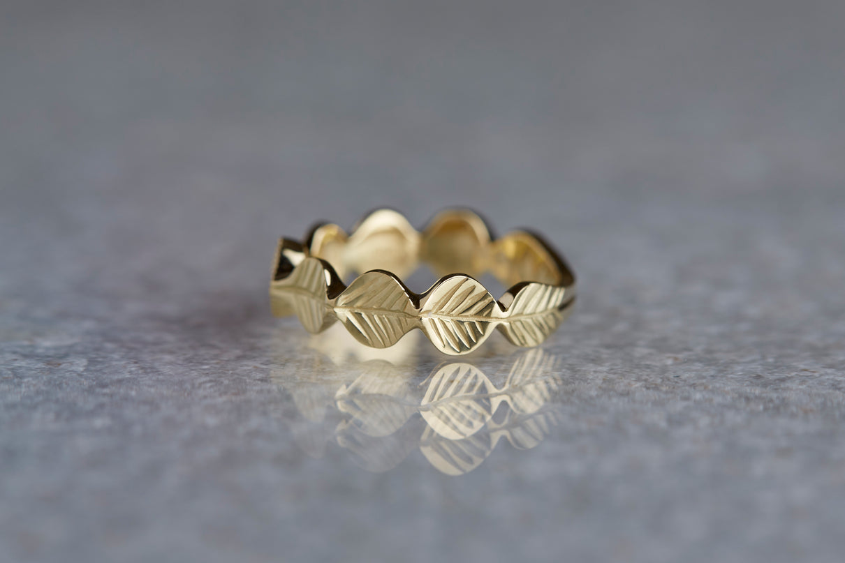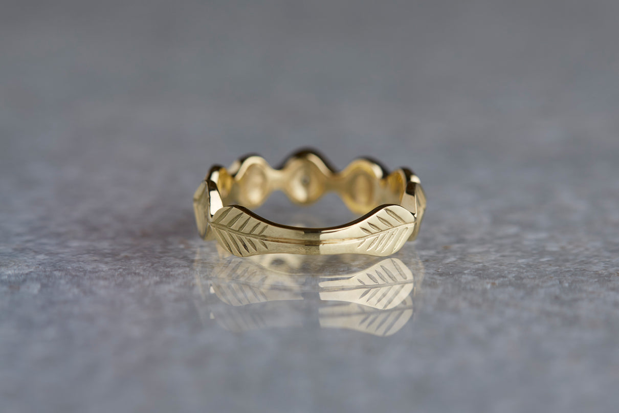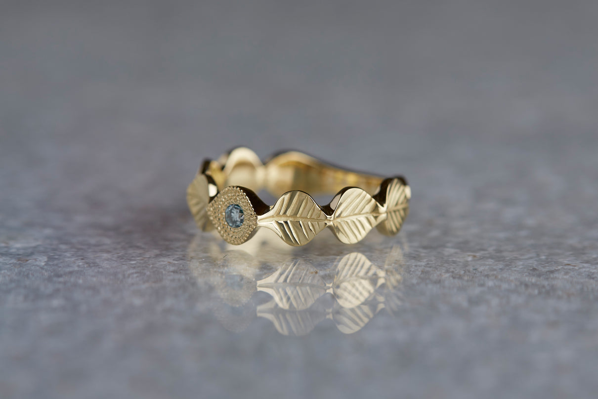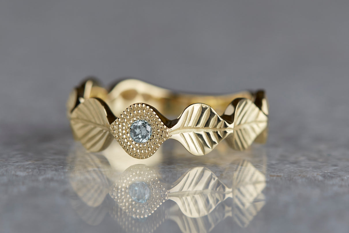 いくつも連なる葉っぱをモチーフに、1枚1枚わずかに異なる表情に遊び心を込めた " Leaf " コレクション。海の遠浅に見られる鮮やかなシーグリーンのブリリアントカットのダイヤモンドを、細かな手仕事のミル打ちで贅沢に縁取った一点もののリングです。ダイヤモンドの台座もさりげなく葉っぱをイメージさせるシェイプに仕立て、全体に滑らかなリズムを与えました。シーグリーンとイエローゴールドのコントラストが華やかに映え、その対比によりゴールドに施された細やかな手仕事をより際やかに感じていただけます。装いの主役として日常的に身に着けていただくのはもちろん、特別な贈りものにも最適なアイテムです。