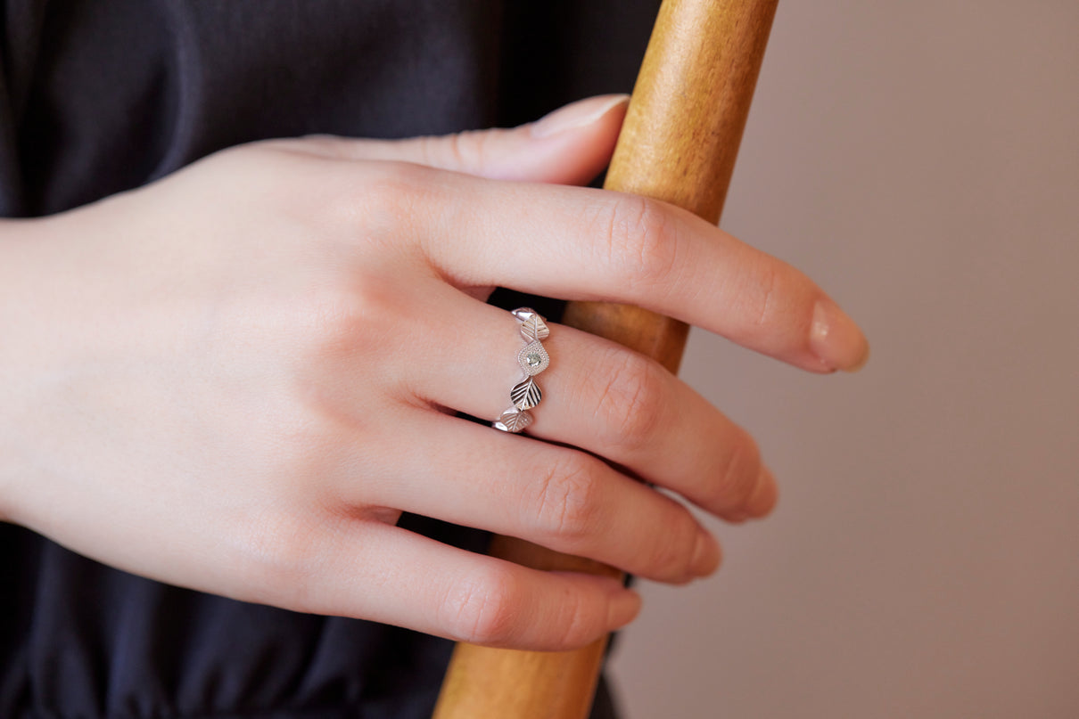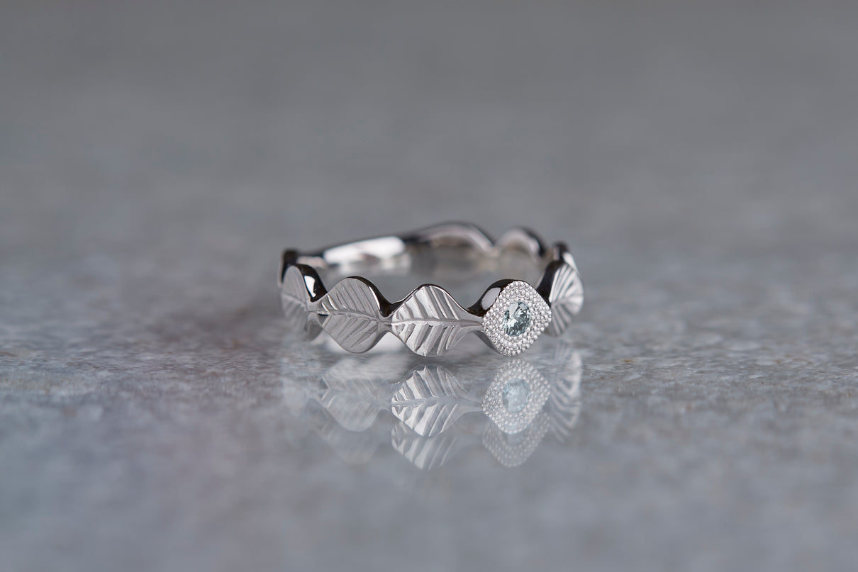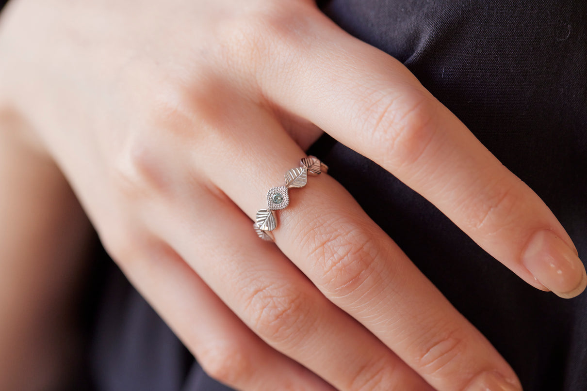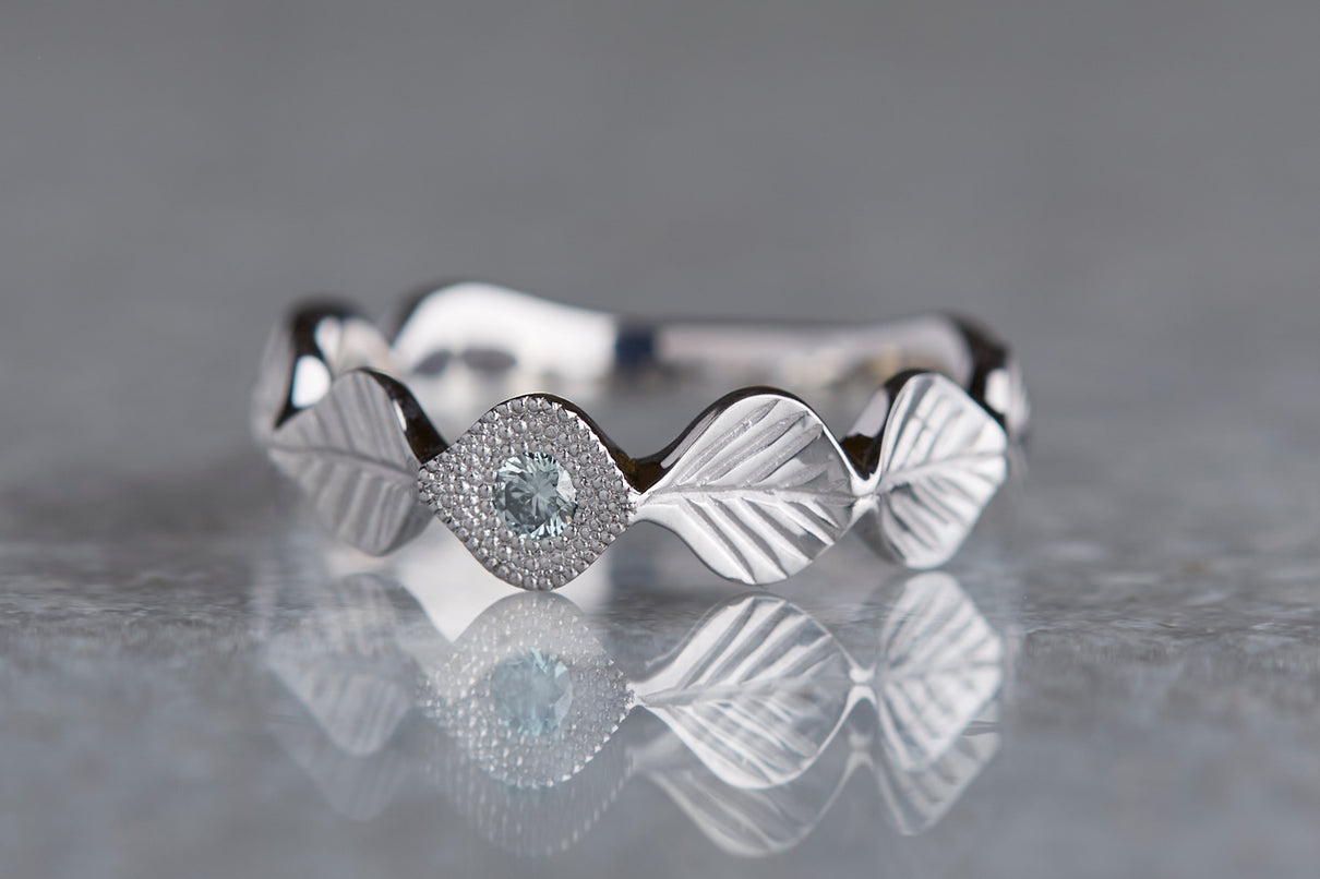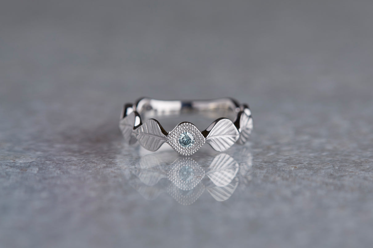 いくつも連なる葉っぱをモチーフに、1枚1枚わずかに異なる表情に遊び心を込めた" Leaf " コレクション。海の遠浅に見られる鮮やかなシーグリーンのブリリアントカットのダイヤモンドを、細かな手仕事のミル打ちで贅沢に縁取った一点もののリングです。ダイヤモンドの台座もさりげなく葉っぱをイメージさせるシェイプに仕立て、全体に滑らかなリズムを与えました。有機的なデザインに上品な静けさを添えるプラチナのリングアーム。装いの主役として日常的に身に着けていただくのはもちろん、特別な贈りものにも最適なアイテムです。