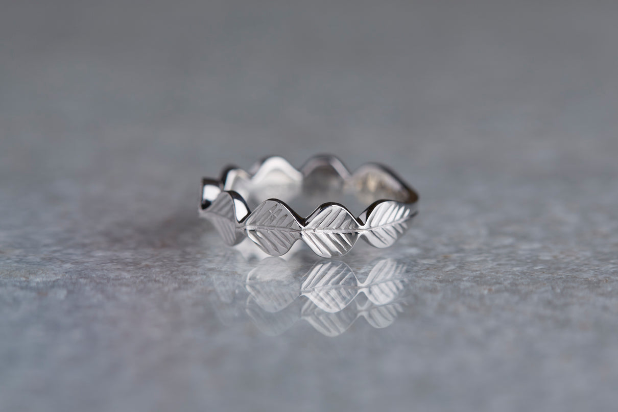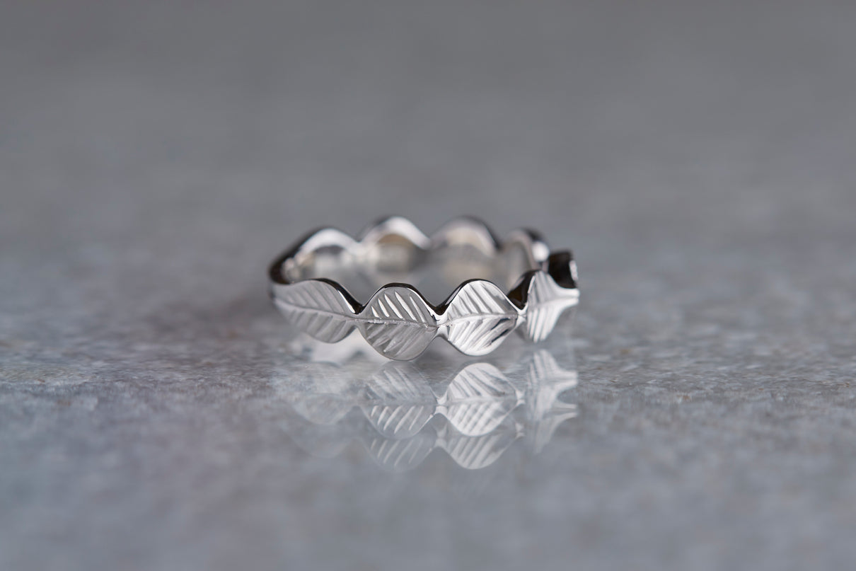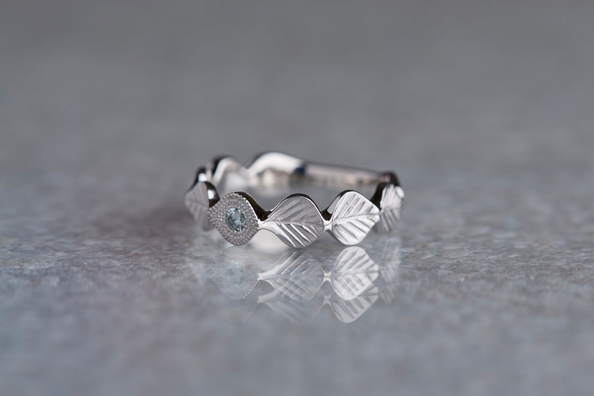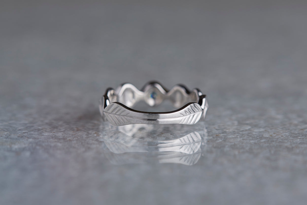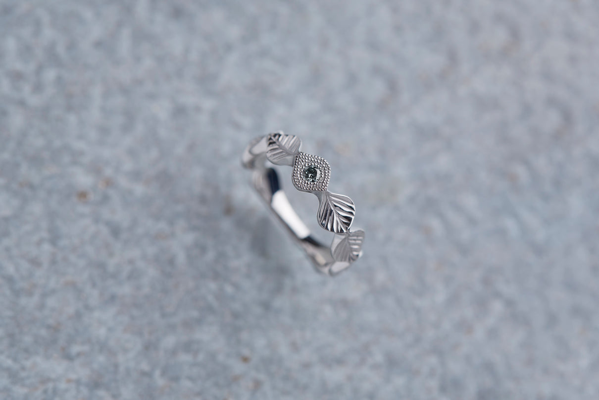 いくつも連なる葉っぱをモチーフに、1枚1枚わずかに異なる表情に遊び心を込めた" Leaf " コレクション。海の遠浅に見られる鮮やかなシーグリーンのブリリアントカットのダイヤモンドを、細かな手仕事のミル打ちで贅沢に縁取った一点もののリングです。ダイヤモンドの台座もさりげなく葉っぱをイメージさせるシェイプに仕立て、全体に滑らかなリズムを与えました。有機的なデザインに上品な静けさを添えるプラチナのリングアーム。装いの主役として日常的に身に着けていただくのはもちろん、特別な贈りものにも最適なアイテムです。