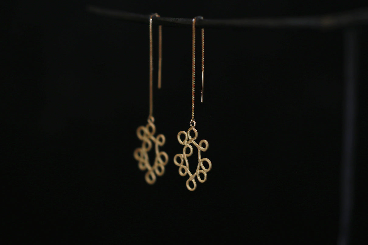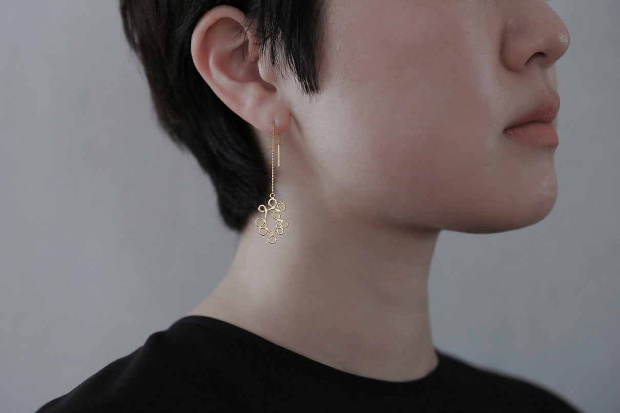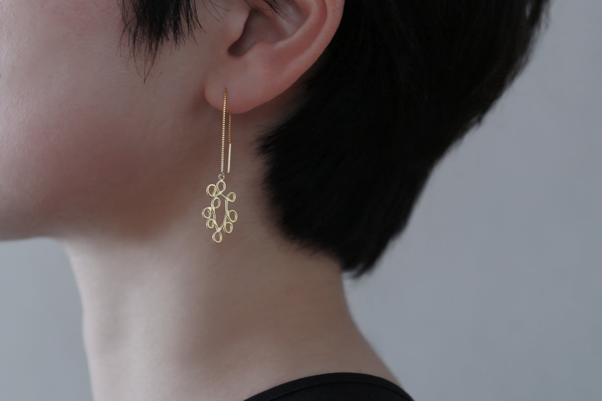 2014年のアーカイブコレクション " Maboroshi " のピアス。目の前の現実が、まるで夢であるかのように靄がかかり揺らめくイメージをコンセプトに、形に起こしたデザインです。マットに仕立てた上下左右非対称のモチーフが柔らかなアクセントとして耳元で揺れ、装いに印象的な存在感を纏わせます。シリコン製のキャッチが付属するため、チェーンはお好みの長さで身につけていただけます。