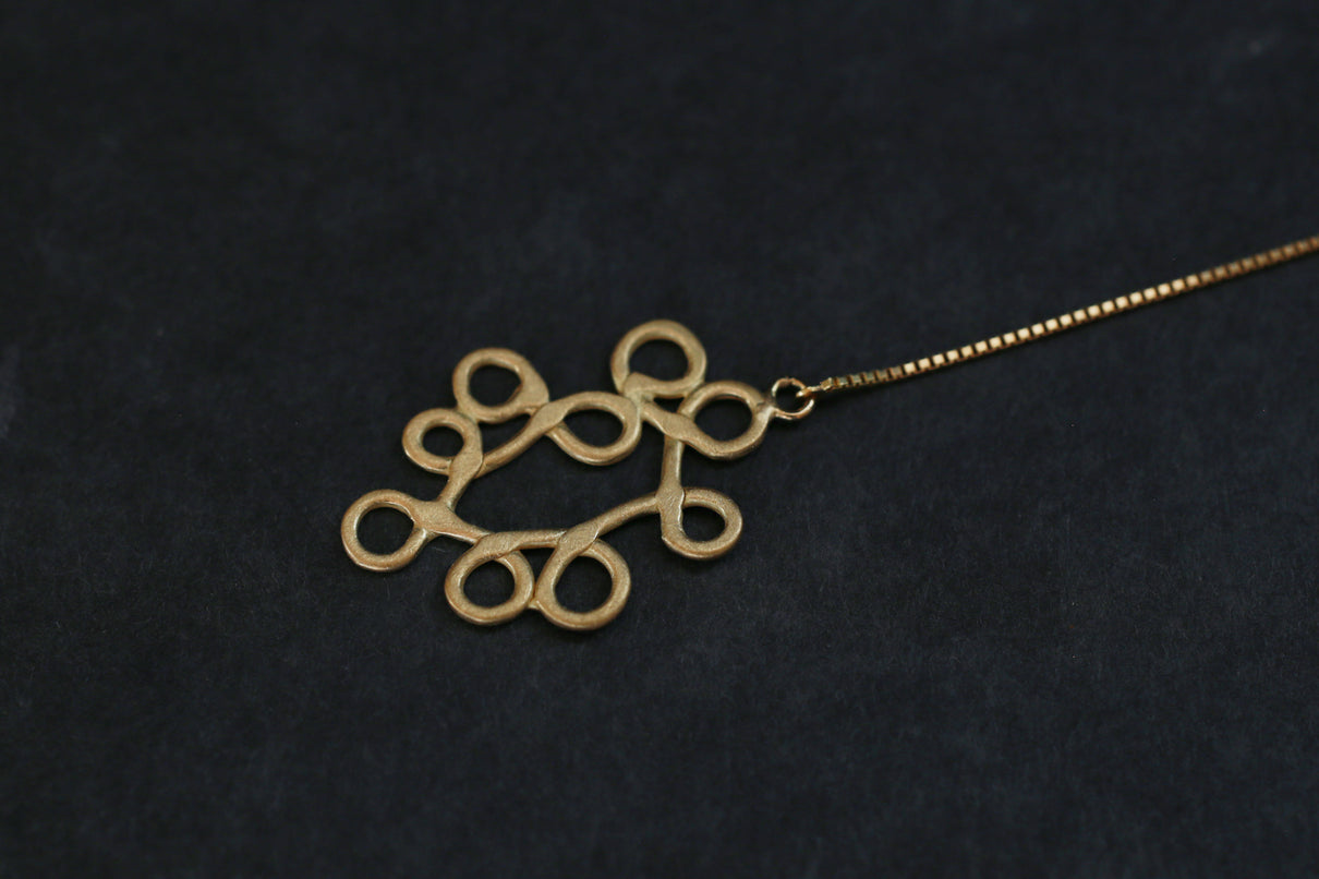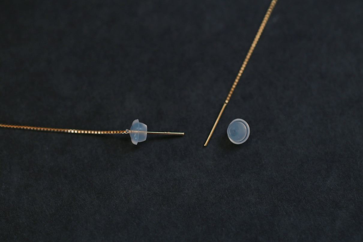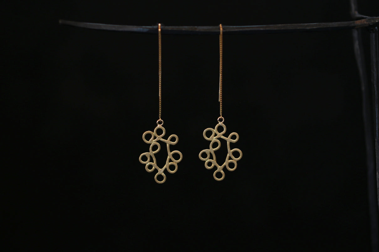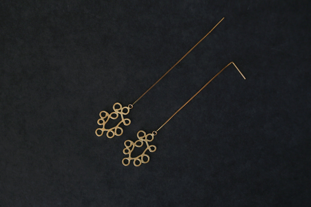 2014年のアーカイブコレクション " Maboroshi " のピアス。目の前の現実が、まるで夢であるかのように靄がかかり揺らめくイメージをコンセプトに、形に起こしたデザインです。マットに仕立てた上下左右非対称のモチーフが柔らかなアクセントとして耳元で揺れ、装いに印象的な存在感を纏わせます。シリコン製のキャッチが付属するため、チェーンはお好みの長さで身につけていただけます。