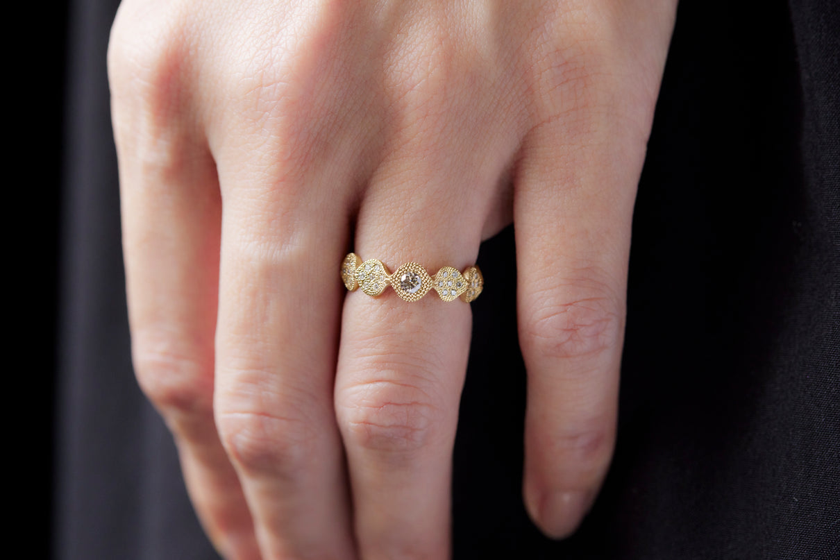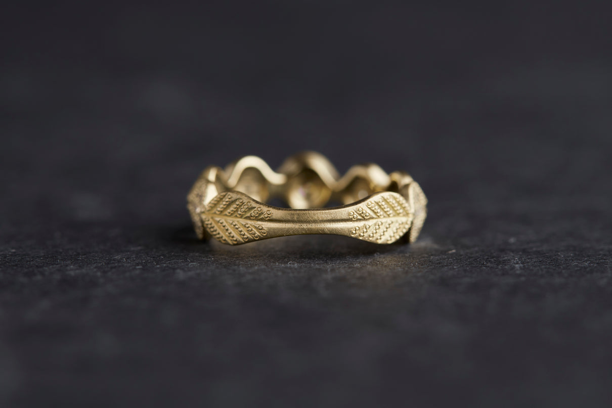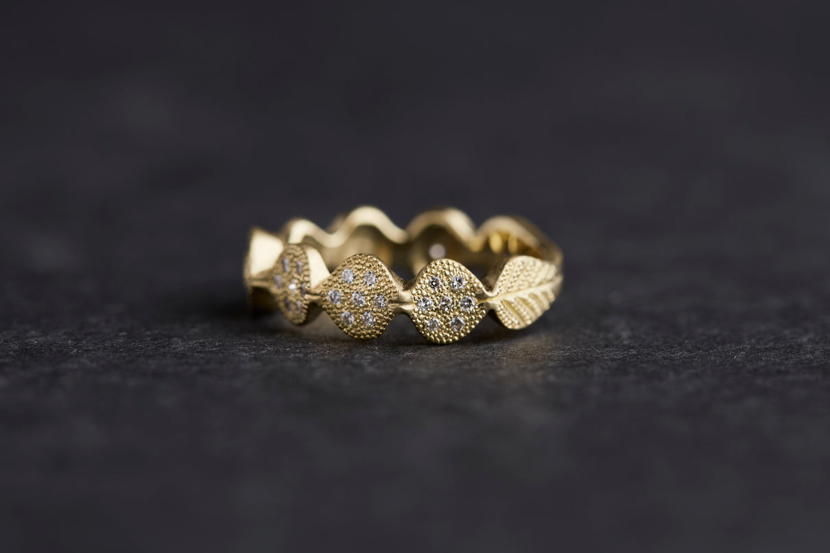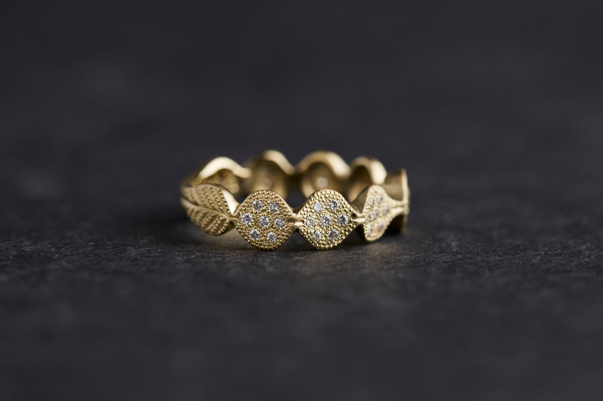 いくつも連なる葉っぱをモチーフに、1枚1枚わずかに異なる表情に遊び心を込めた " Leaf " コレクションの一点もののリング。中央の葉には存在感のある0.10ctの輝きが美しいダイヤモンドを、そこから続く葉には極小のメレダイヤモンドを配し、それぞれ細かなミル打ちがその煌めきを湛えるように寄り添います。密度のある手仕事で仕上げた有機的なデザインの中に、微かに漂うアンティークな佇まい。装いの主役として日常的に身に着けていただくのはもちろん、特別な贈りものにも最適なアイテムです。