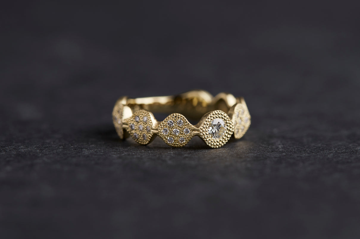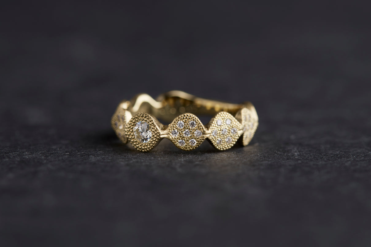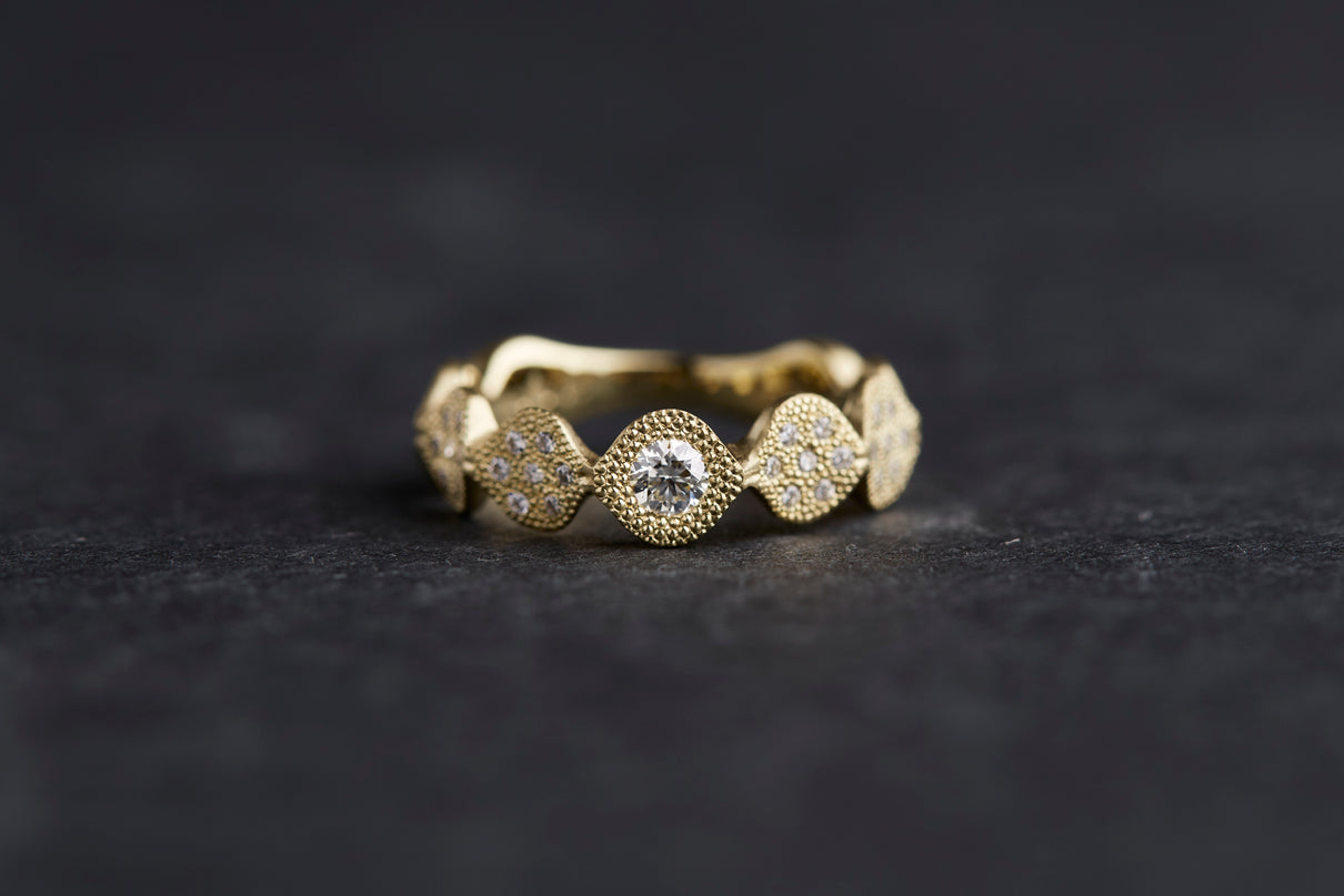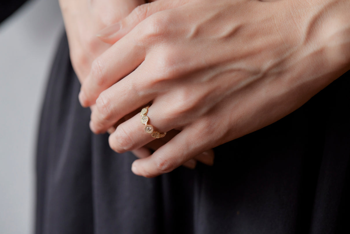 いくつも連なる葉っぱをモチーフに、1枚1枚わずかに異なる表情に遊び心を込めた " Leaf " コレクションの一点もののリング。中央の葉には存在感のある0.10ctの輝きが美しいダイヤモンドを、そこから続く葉には極小のメレダイヤモンドを配し、それぞれ細かなミル打ちがその煌めきを湛えるように寄り添います。密度のある手仕事で仕上げた有機的なデザインの中に、微かに漂うアンティークな佇まい。装いの主役として日常的に身に着けていただくのはもちろん、特別な贈りものにも最適なアイテムです。