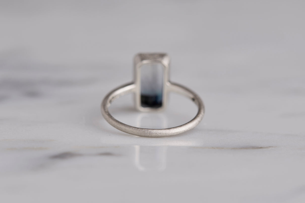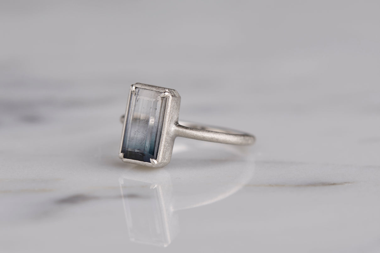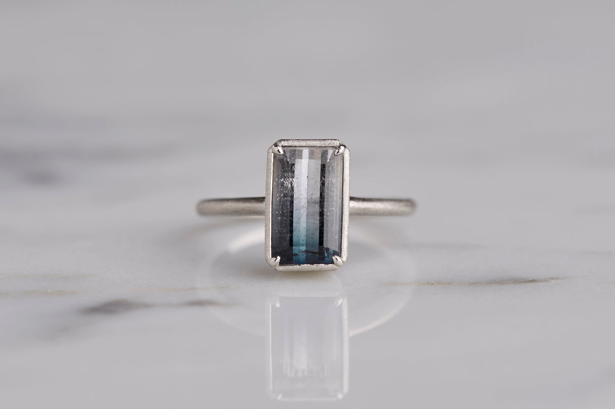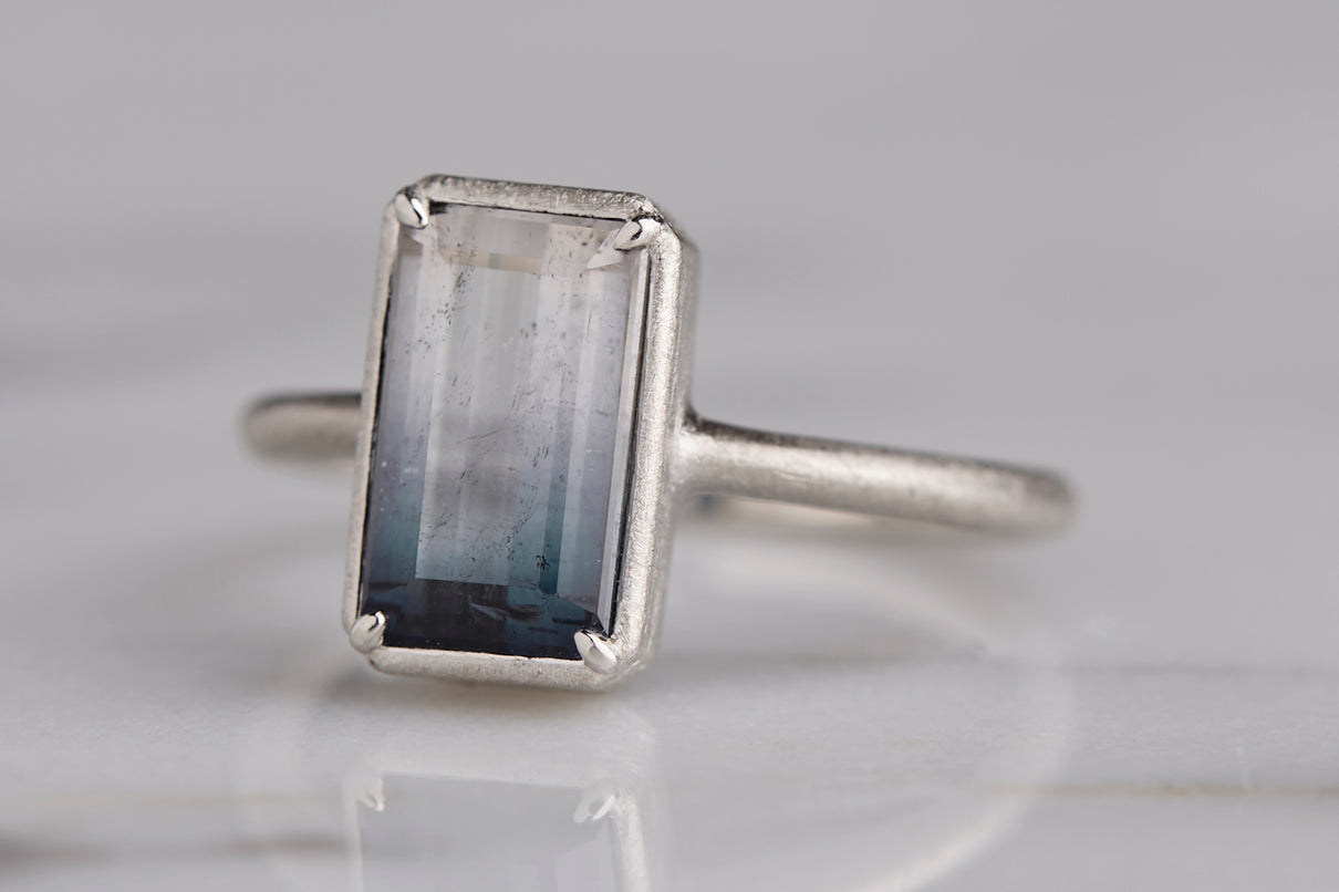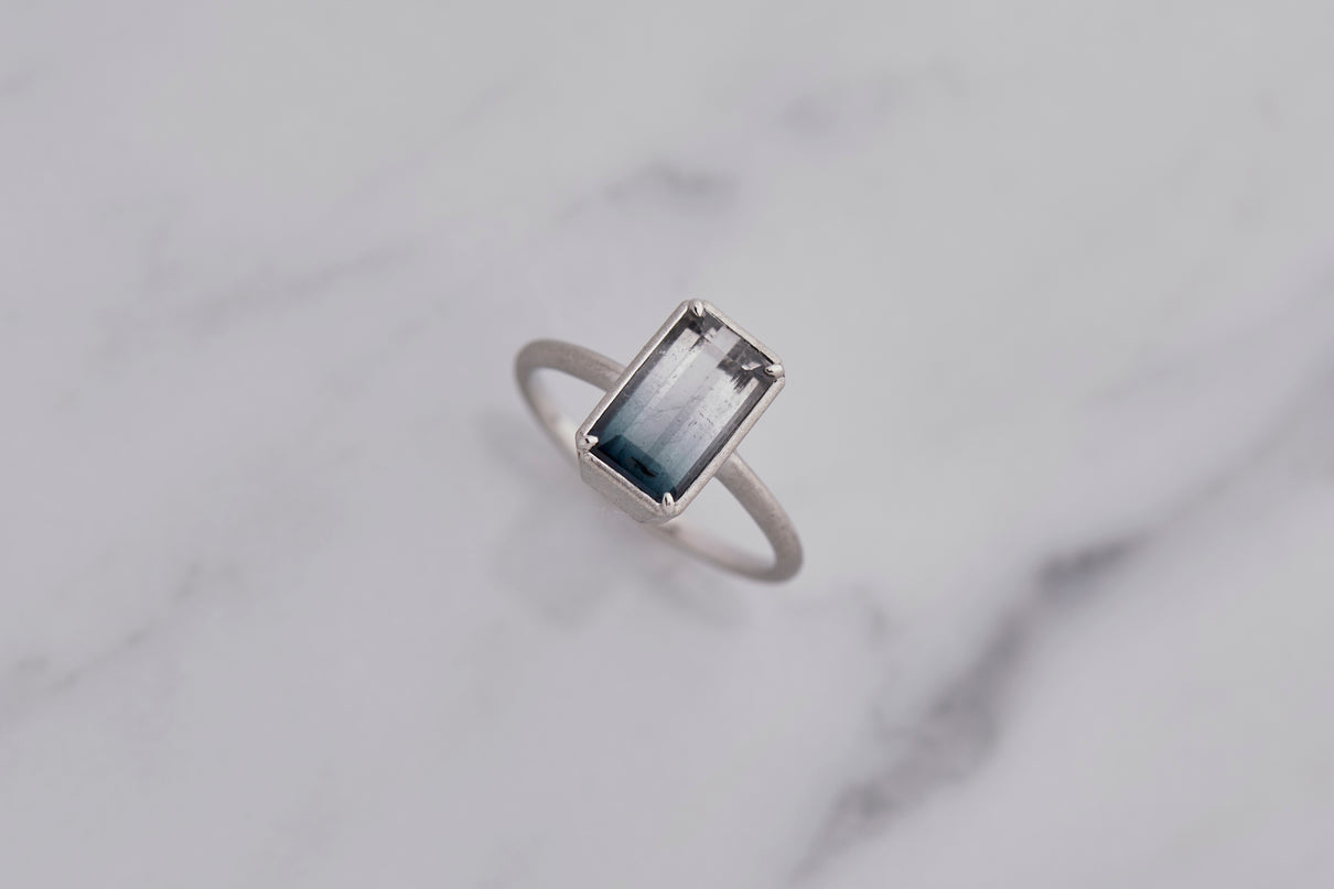 透明度の高い上質なバイカラートルマリンを留めた一点もののリング。朧げに滲む涼やかな色彩のグラデーションは、インクが染み込んでいくようなじんわりとした濃淡を表し、落ち着きのある存在感を放ちます。すっきりとした縦長フォルムが目を惹くスクエアカットのトルマリンを、取り囲むフレームと4本の爪でシンプルに留め、マットに仕立てたストレートラインのプラチナのアームが寄り添います。凛とした佇まいが装いに上品な華を添えるリング。10月の誕生石としても親しまれているトルマリンは、10月生まれの方の特別なお守りとしてもお勧めです。
