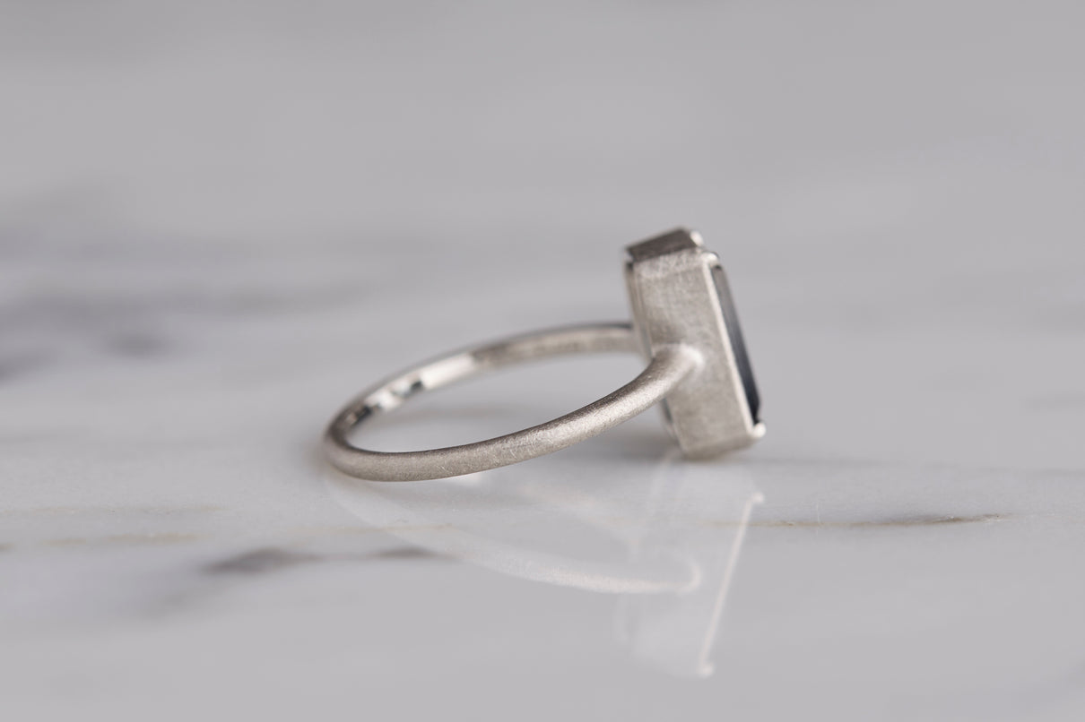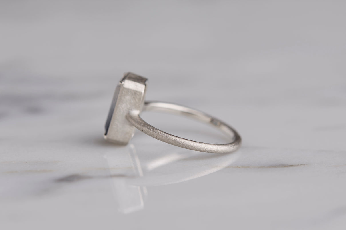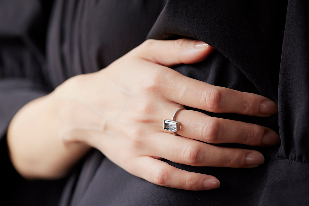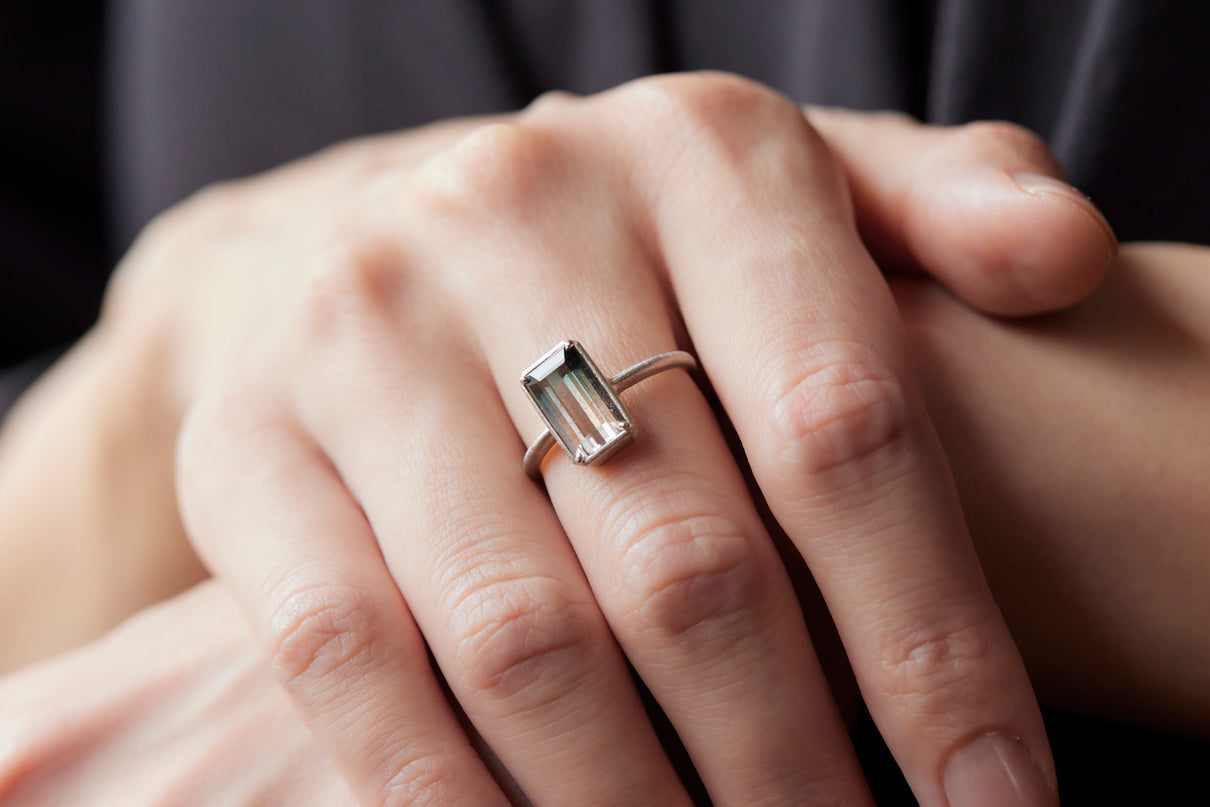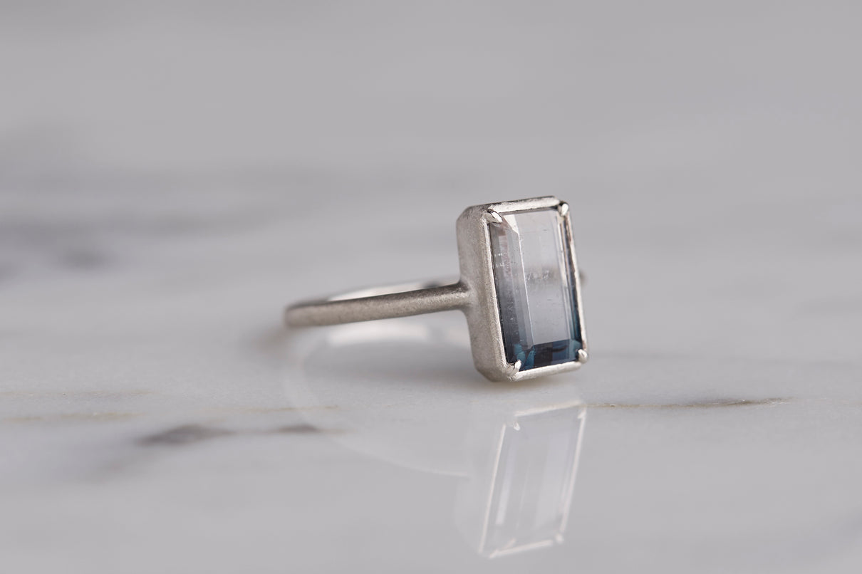 透明度の高い上質なバイカラートルマリンを留めた一点もののリング。朧げに滲む涼やかな色彩のグラデーションは、インクが染み込んでいくようなじんわりとした濃淡を表し、落ち着きのある存在感を放ちます。すっきりとした縦長フォルムが目を惹くスクエアカットのトルマリンを、取り囲むフレームと4本の爪でシンプルに留め、マットに仕立てたストレートラインのプラチナのアームが寄り添います。凛とした佇まいが装いに上品な華を添えるリング。10月の誕生石としても親しまれているトルマリンは、10月生まれの方の特別なお守りとしてもお勧めです。
