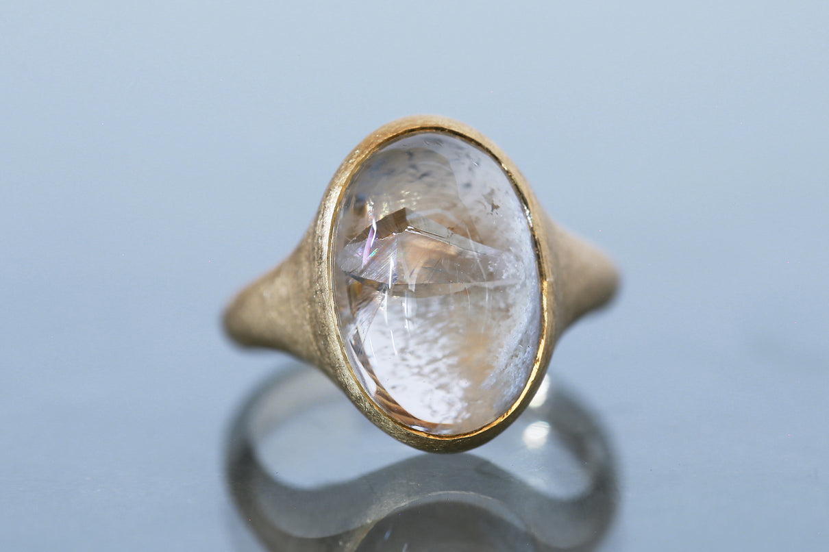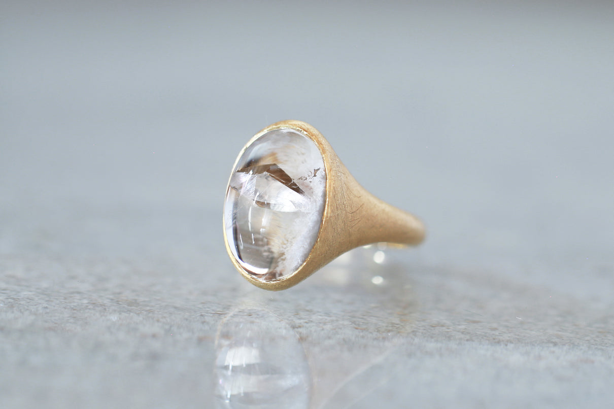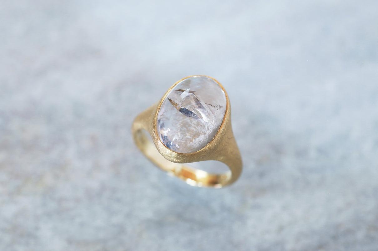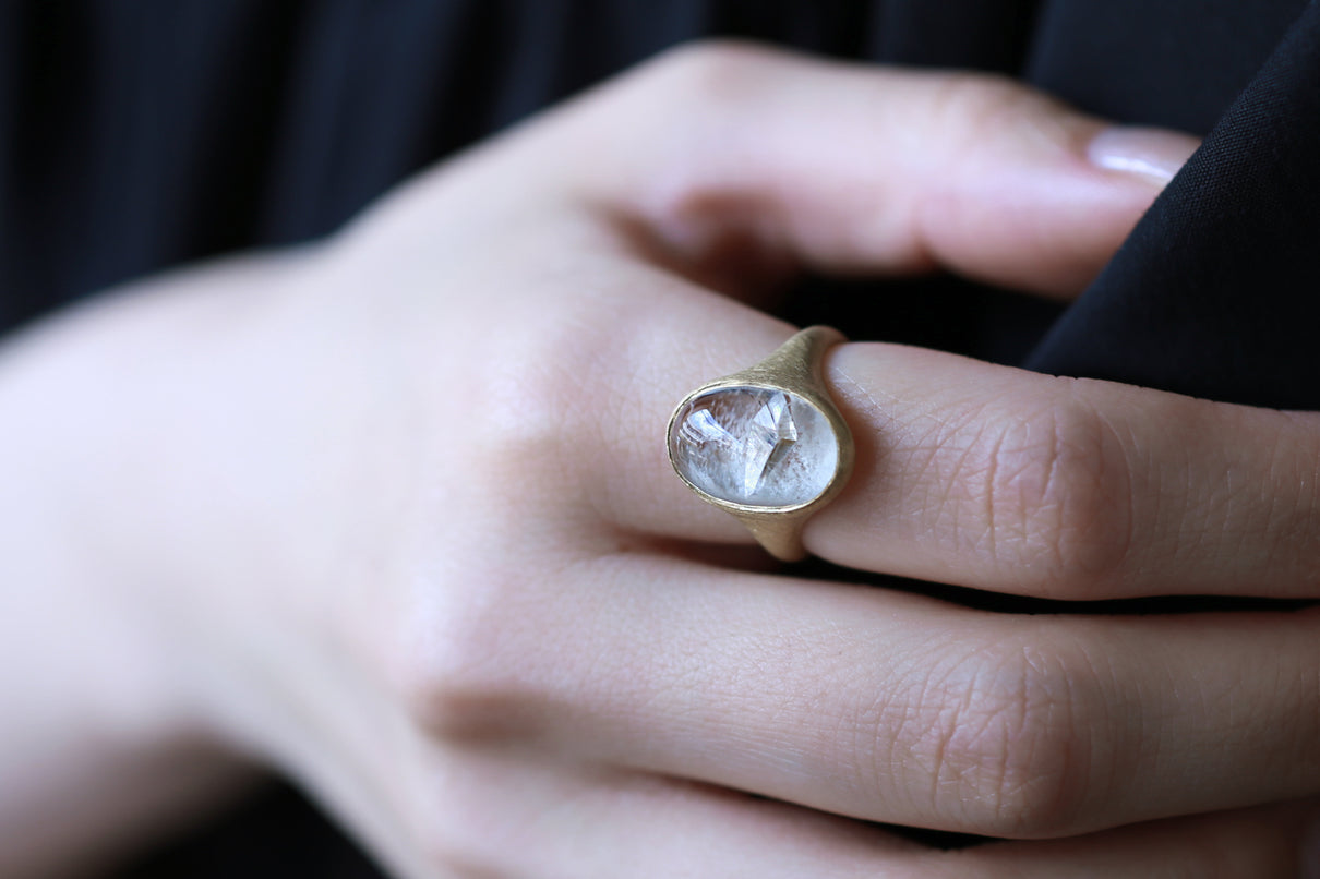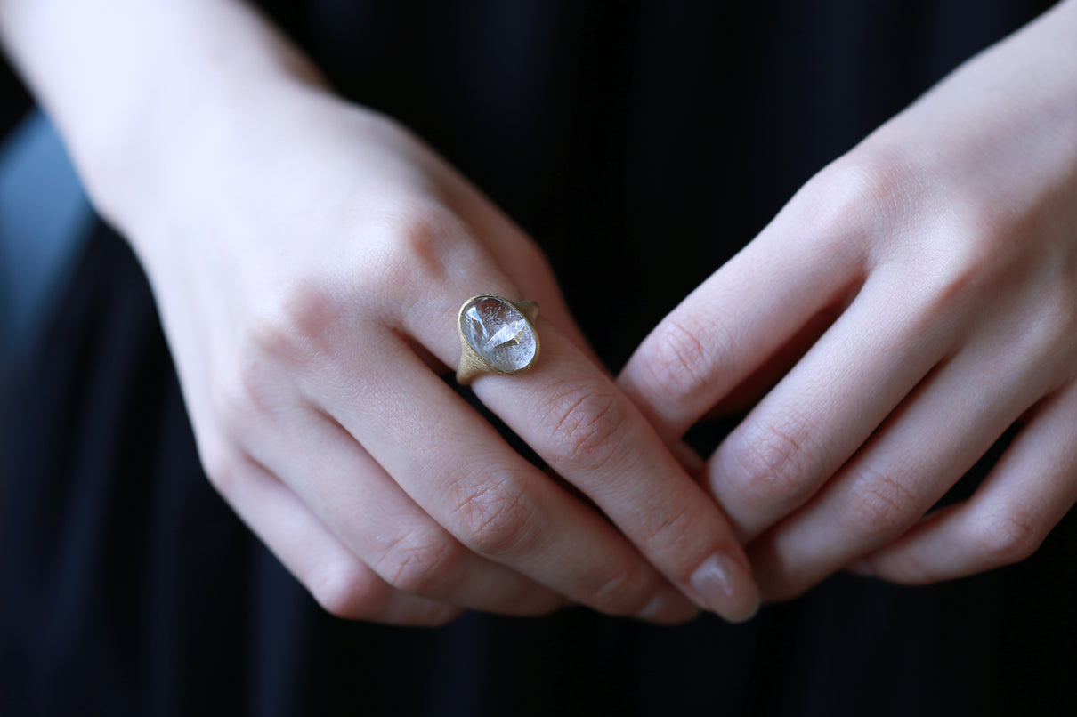 水晶の結晶を別の水晶が包み込むようにして成長した珍しい宝石、クォーツインクォーツを留めた一点もののリングです。和名では「貫入水晶」とも呼ばれるクォーツインクォーツ。自然が偶然につくり出した時の重なりをそっと閉じ込めたかのように結晶の姿をそのまま残した、神秘的な表情を魅せます。また内包されたクォーツの奥に、木や草花などの自然の風景を彷彿とさせるインクルージョンをもつホワイトガーデンクォーツの要素も見ることが出来る、隠れた魅力を秘めた希少なピースです。マットに仕立てたボリュームのあるリングアームが寄り添い、個性溢れる表情が指元を華やかに彩ます。