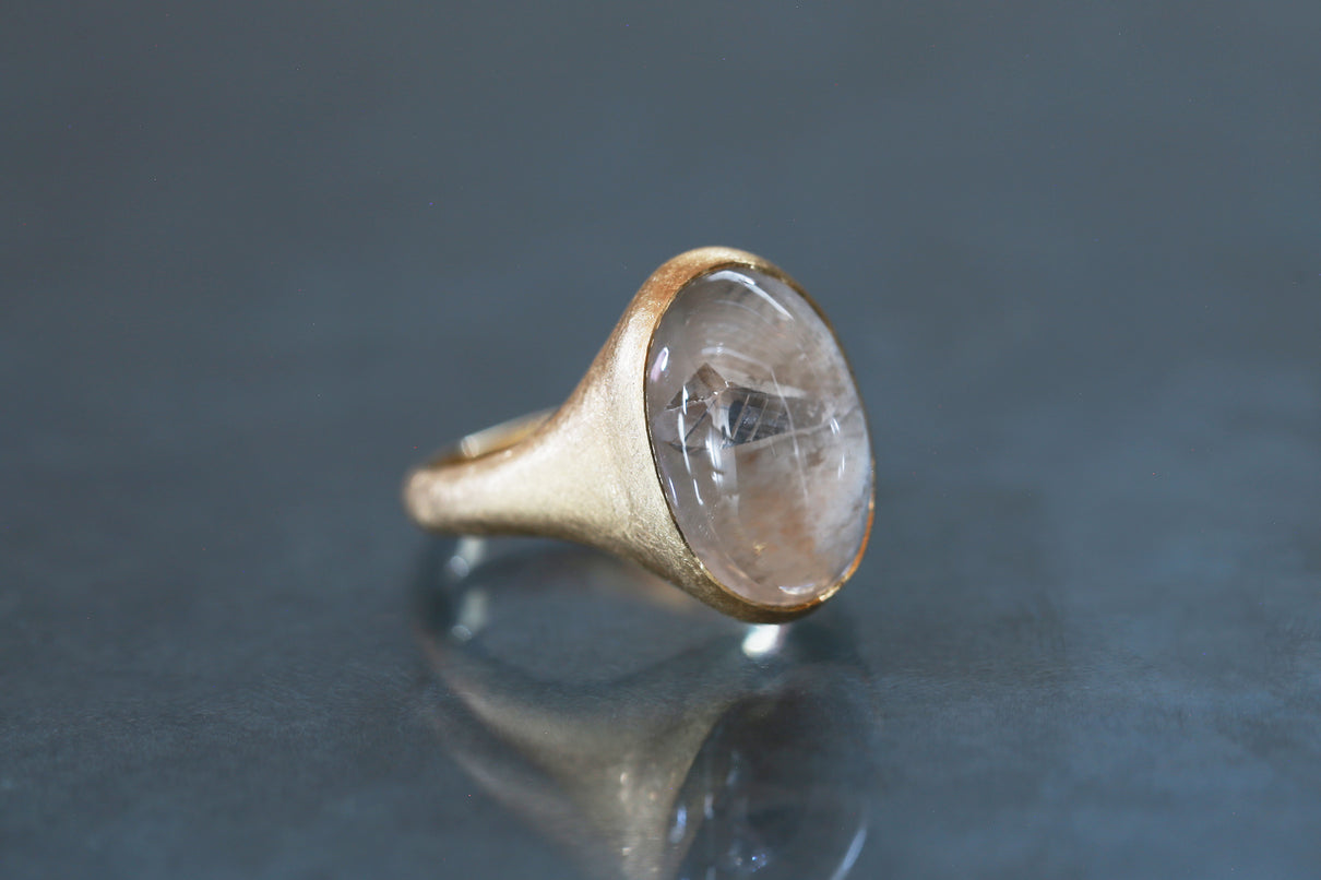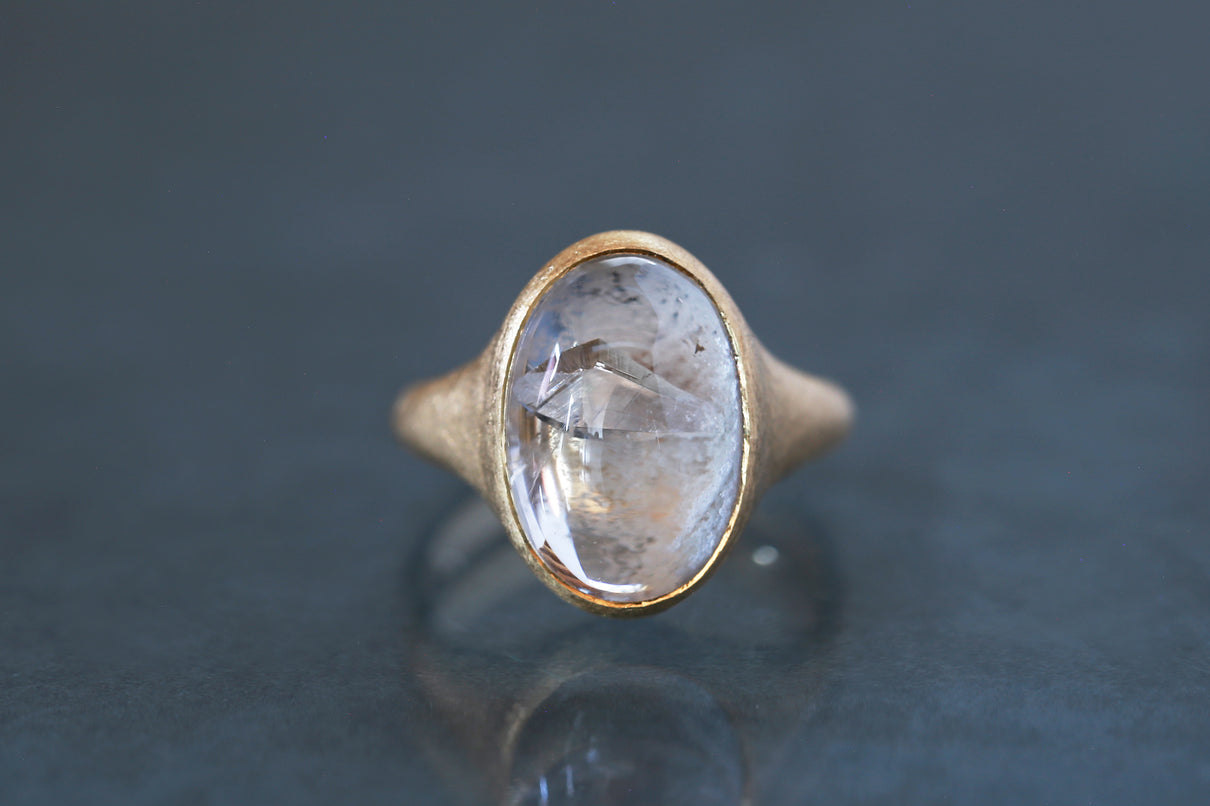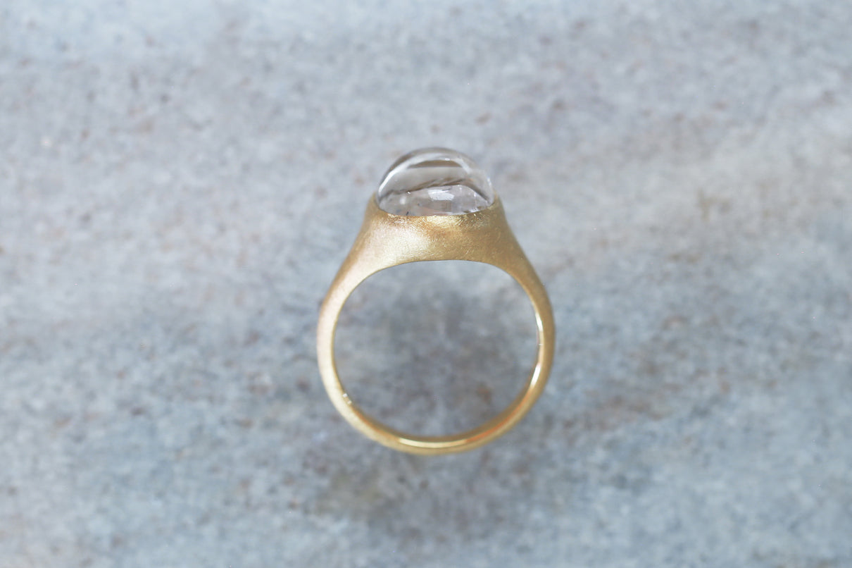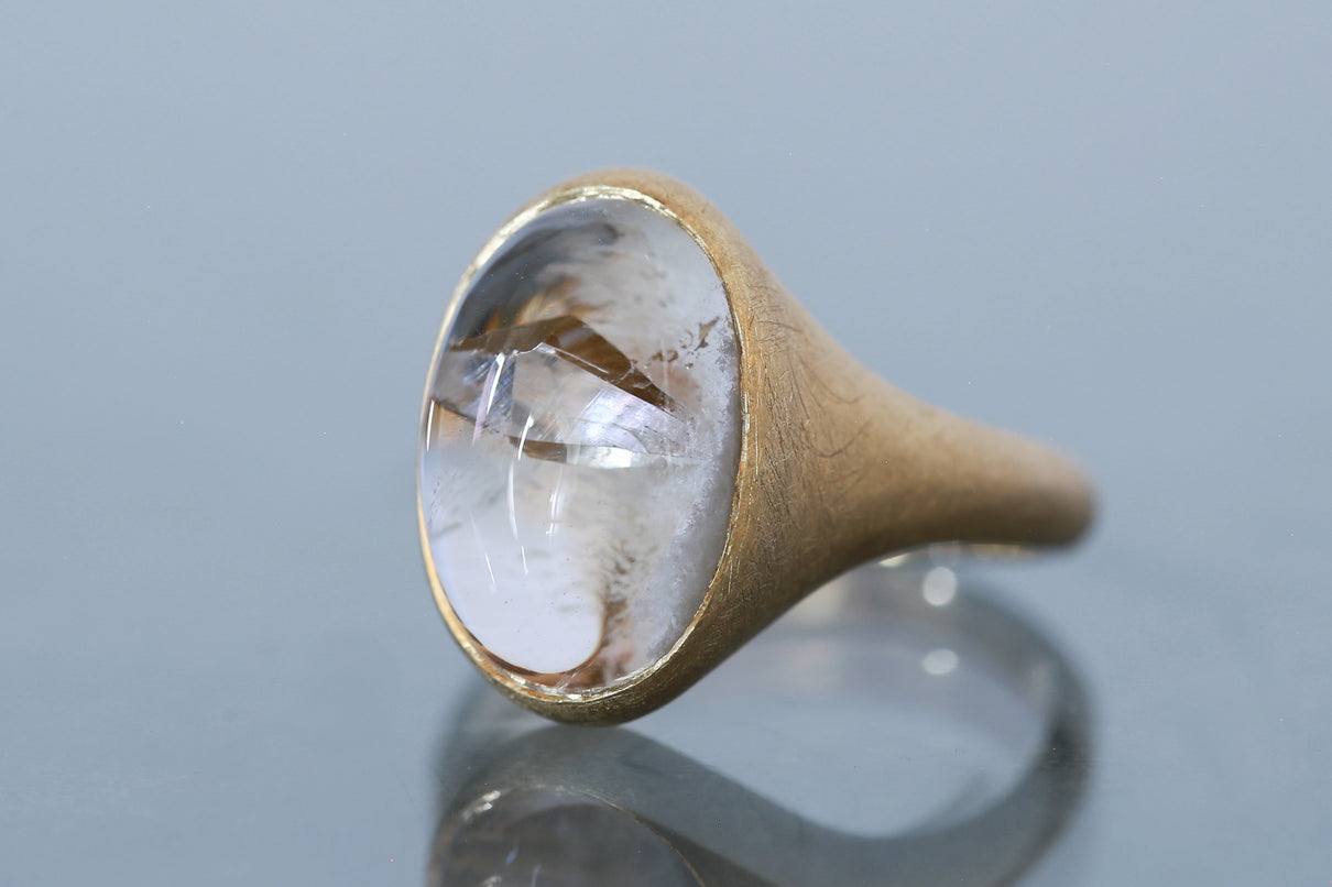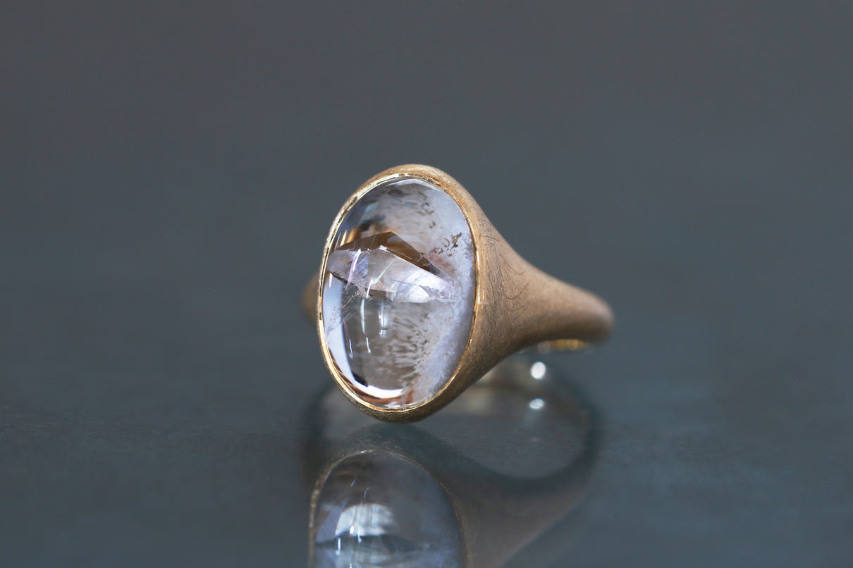 水晶の結晶を別の水晶が包み込むようにして成長した珍しい宝石、クォーツインクォーツを留めた一点もののリングです。和名では「貫入水晶」とも呼ばれるクォーツインクォーツ。自然が偶然につくり出した時の重なりをそっと閉じ込めたかのように結晶の姿をそのまま残した、神秘的な表情を魅せます。また内包されたクォーツの奥に、木や草花などの自然の風景を彷彿とさせるインクルージョンをもつホワイトガーデンクォーツの要素も見ることが出来る、隠れた魅力を秘めた希少なピースです。マットに仕立てたボリュームのあるリングアームが寄り添い、個性溢れる表情が指元を華やかに彩ます。