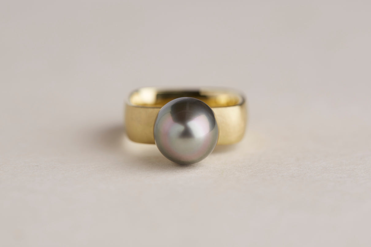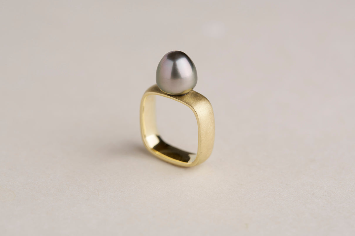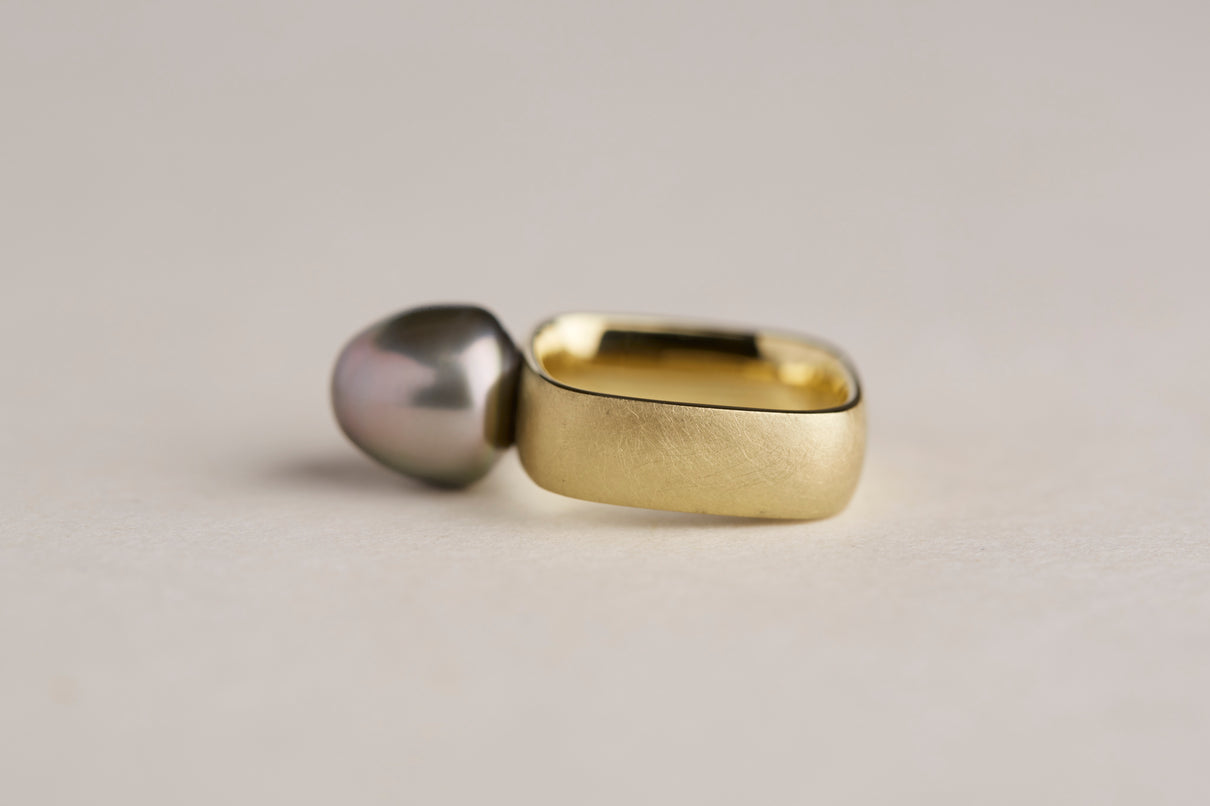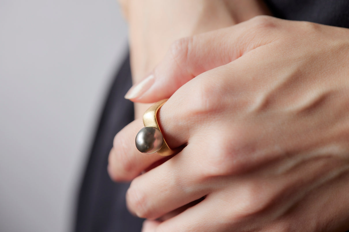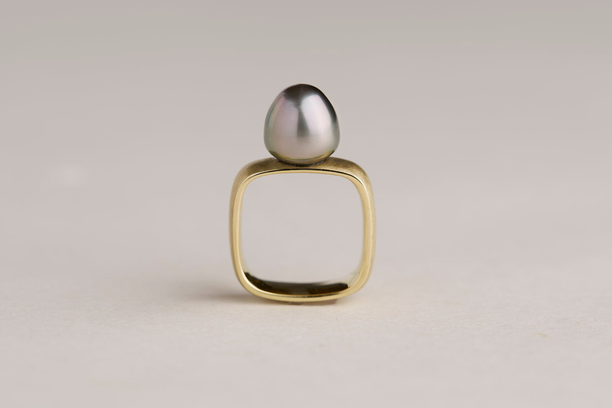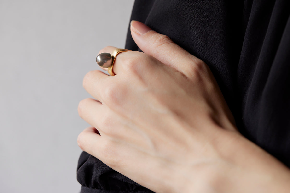 「三味線」の胴体の形から着想を得たSyamiシリーズ。古来より伝わる伝統楽器に潜む美しく柔らかな四角形が、実はまん丸ではない指の断面にフィットする最も自然なフォルムなのではと考えました。丸く滑らかに仕上げた内側はその厚みや角度にまでこだわり、四角い見た目からは想像がつかないほど心地よい着け心地です。トップには南洋の海で採取されるタヒチパールを使用。何色とも言い難い複雑で奥深い色彩と、豊かな自然が生みだすたおやかなフォルムは、シンプルなスクエア型のリングとのコントラストが引き立ちます。淑やかで洗練された個性があり、装いの主役となる一点もののアイテムです。
