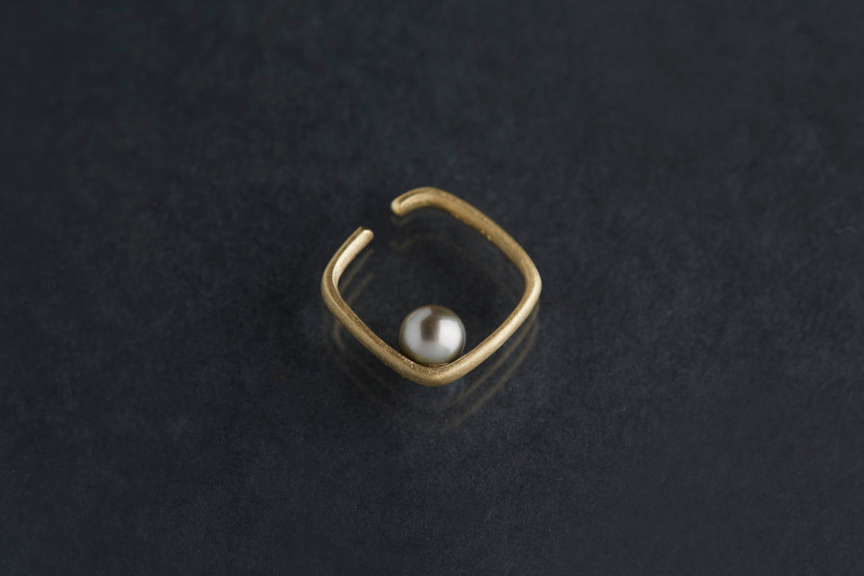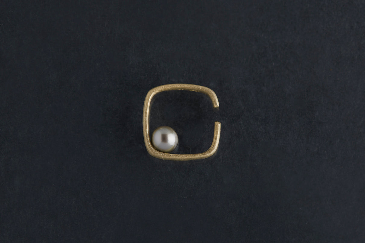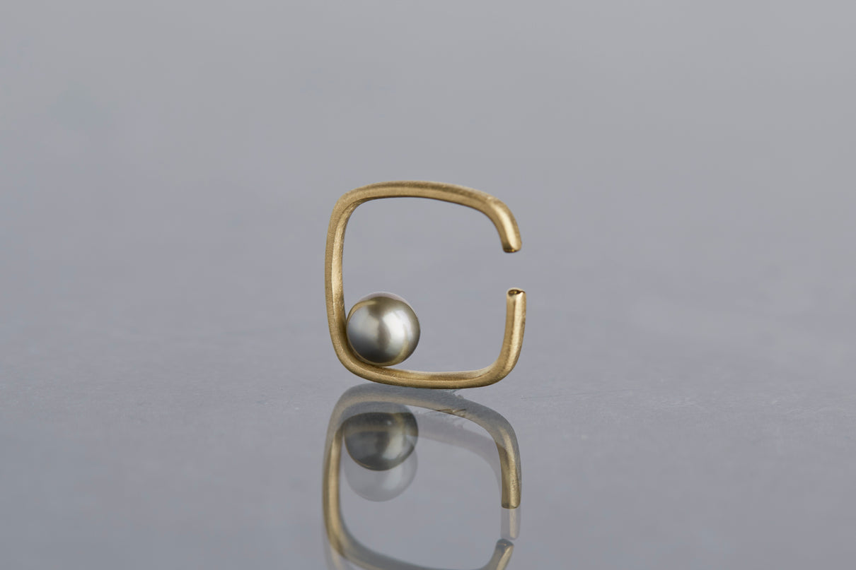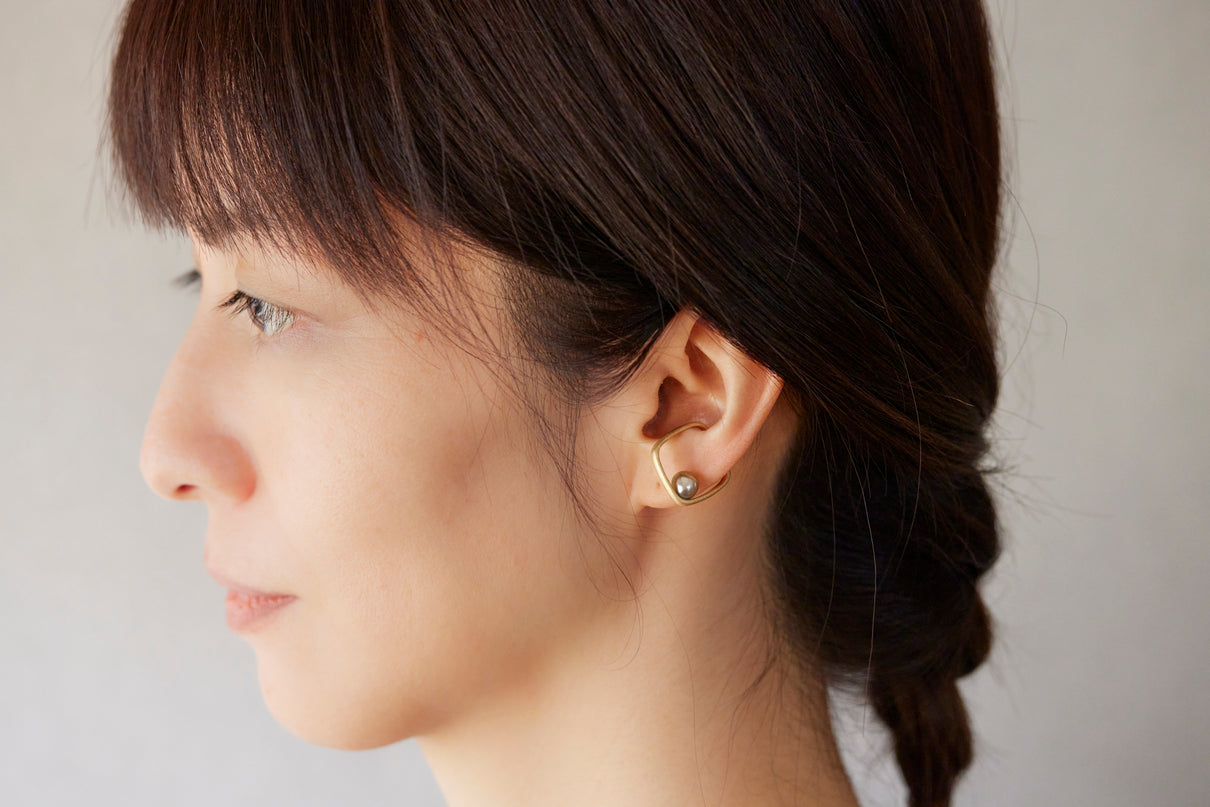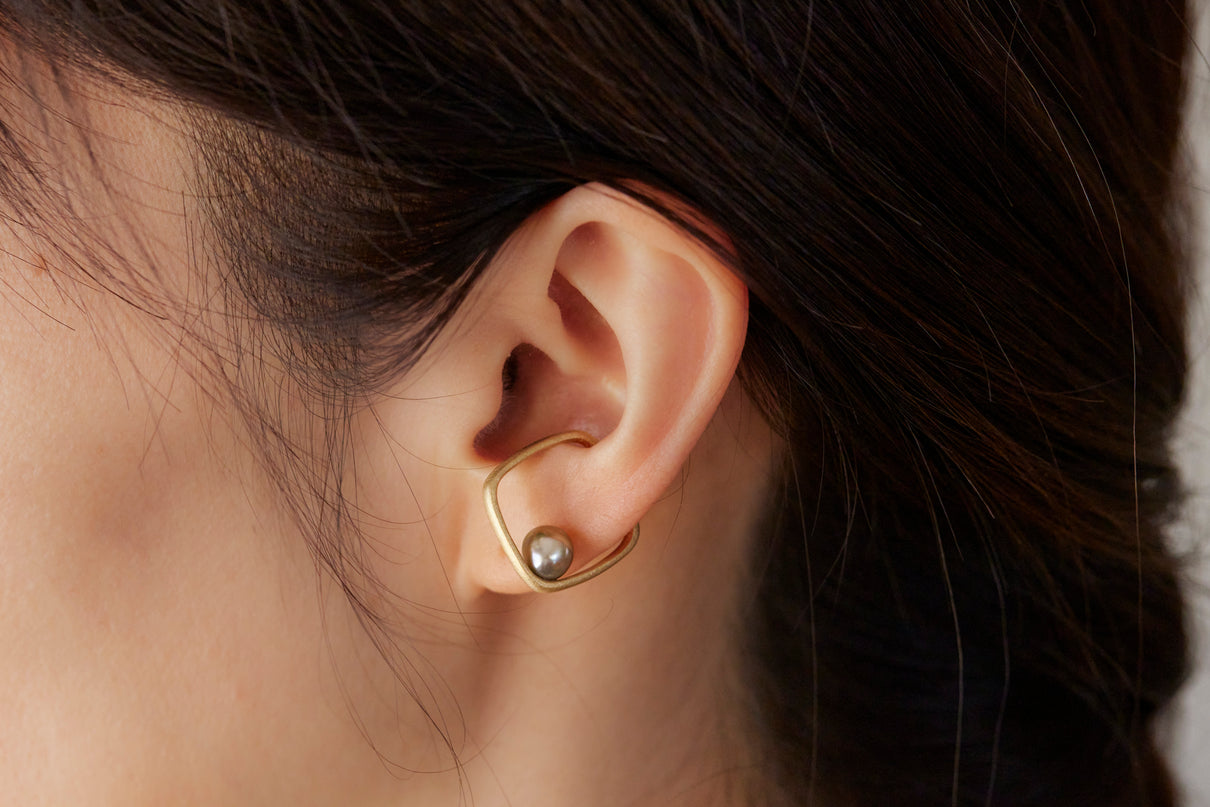 三味線の形から着想を得て作られたSyamiシリーズのイヤーカフです。南洋の海で採取されるタヒチパール。光によって、何色もの色が混ざりグラデーションを描くように見える奥深い色彩が美しく、一般的なパールの整った形とは異なるたおやかなケシパールの有機的な形は、緩やかなカーブを描く、シンプルなスクエア型のイヤーカフとのコントラストが引き立ちます。装いに加えるだけで、 シックで洗練された個性を放つアイテムです。