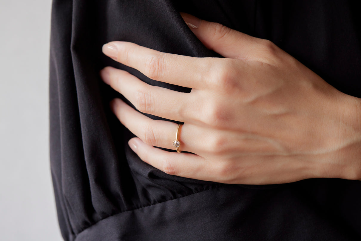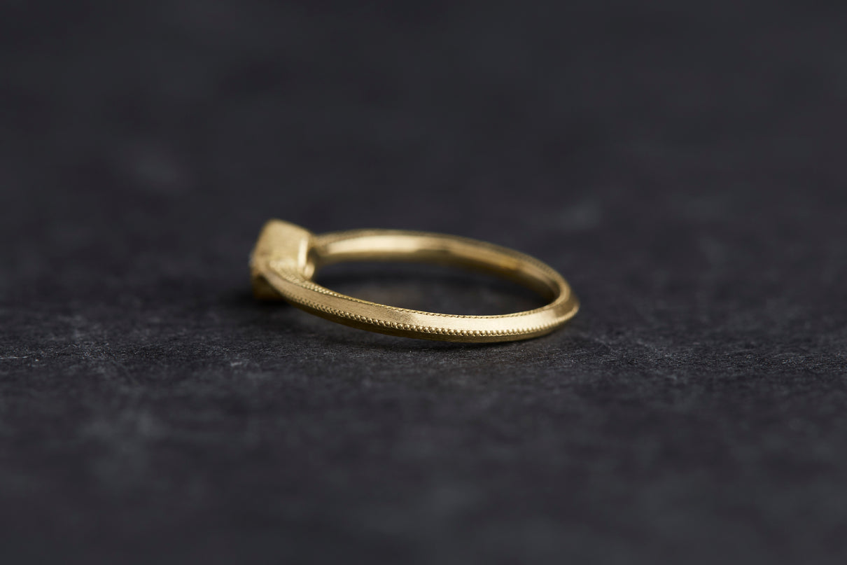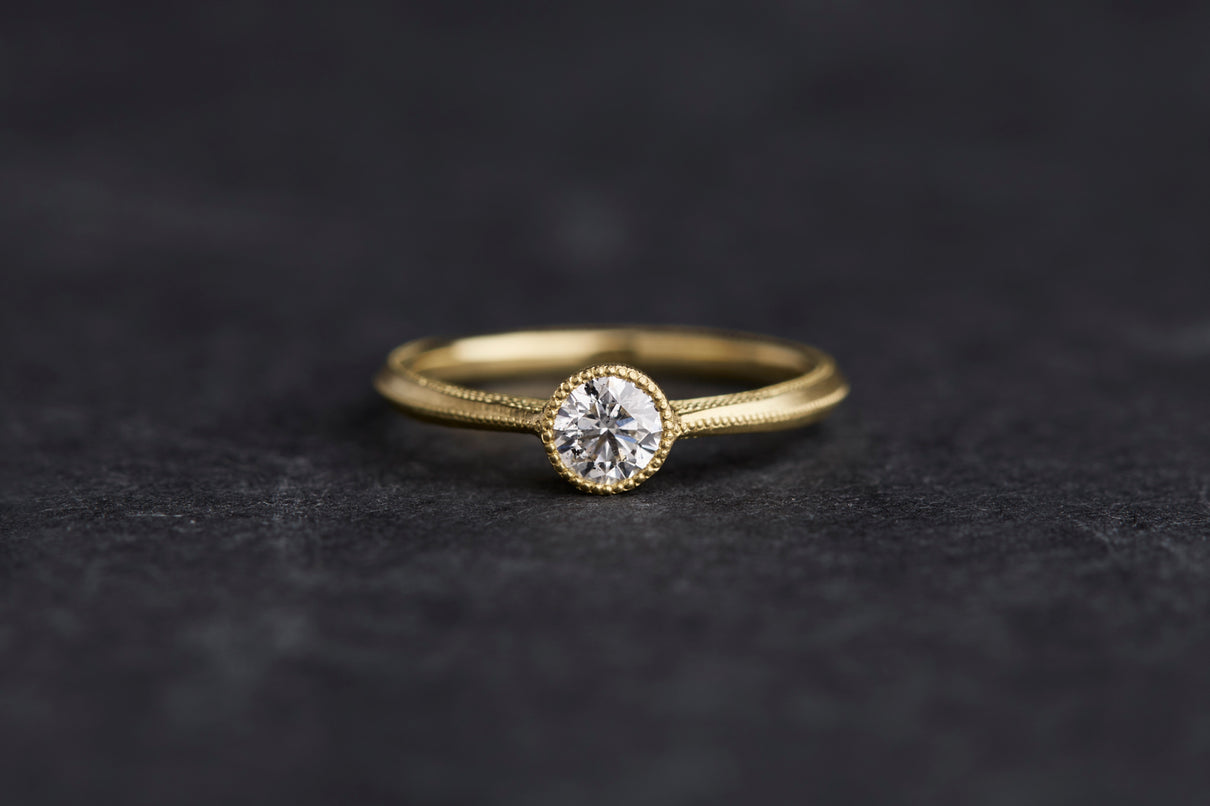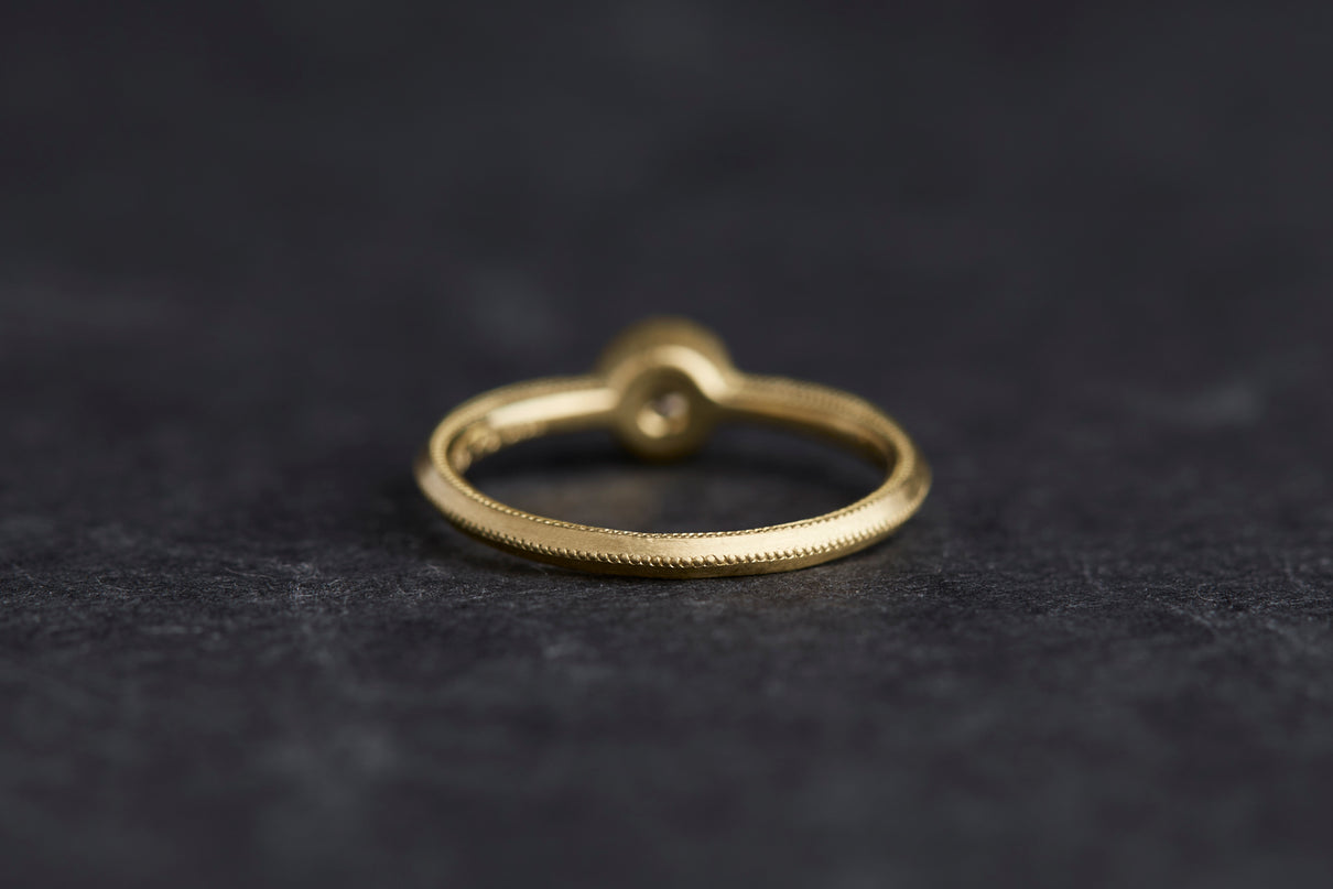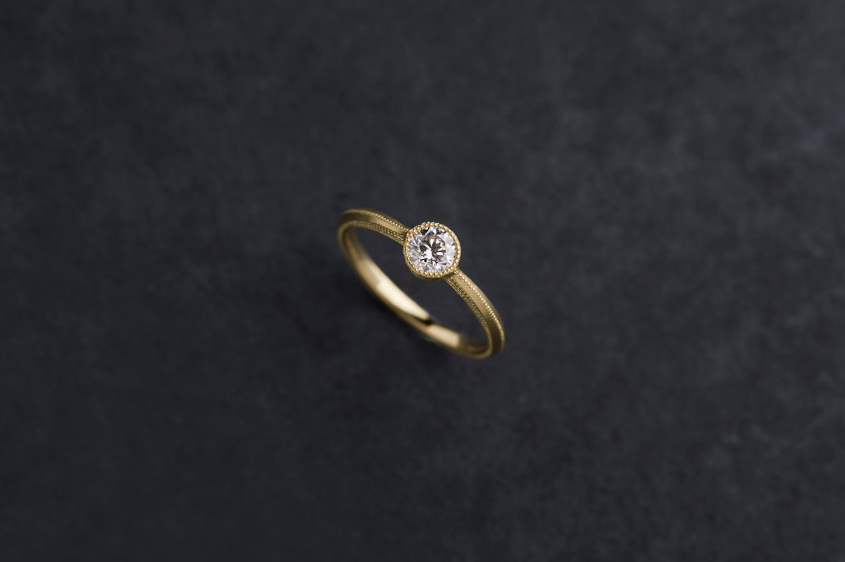 これまでに歩んできた軌跡を無数の点で表現した " Locus "の一点もののリング。ミルグレインという手法を用い丁寧に刻んだ幾つもの点は、ラテン語で " 千の粒 "という意味を持ちます。上質なブリリアントカットのダイヤモンドが指元で眩い煌めきを放つデザイン。幸せな時間がこれから先も刻まれ続けていきますように、と願いを込めたリングは、日常の装いに華を添える だけでなく、特別な贈り物としてもお勧めです。