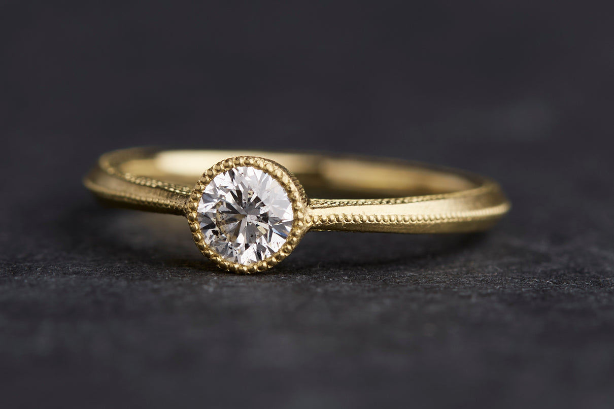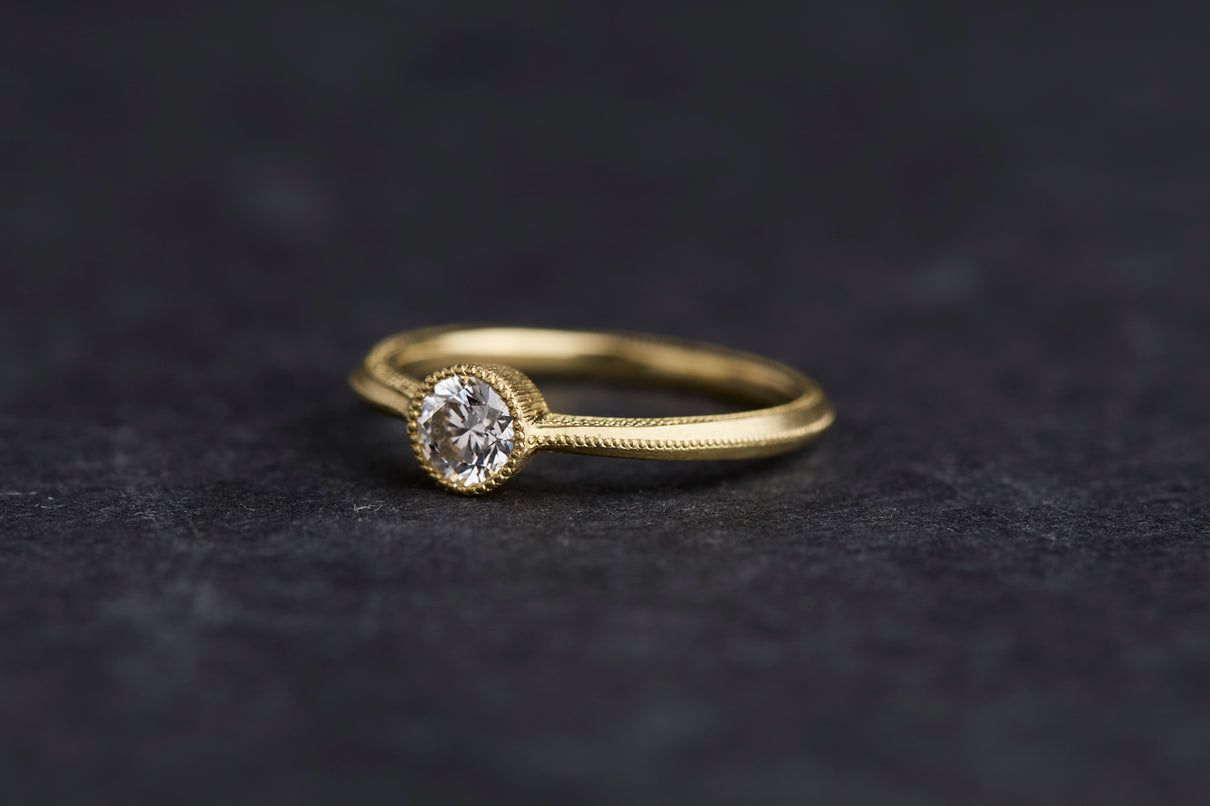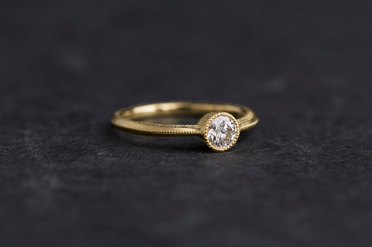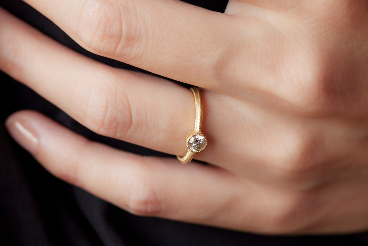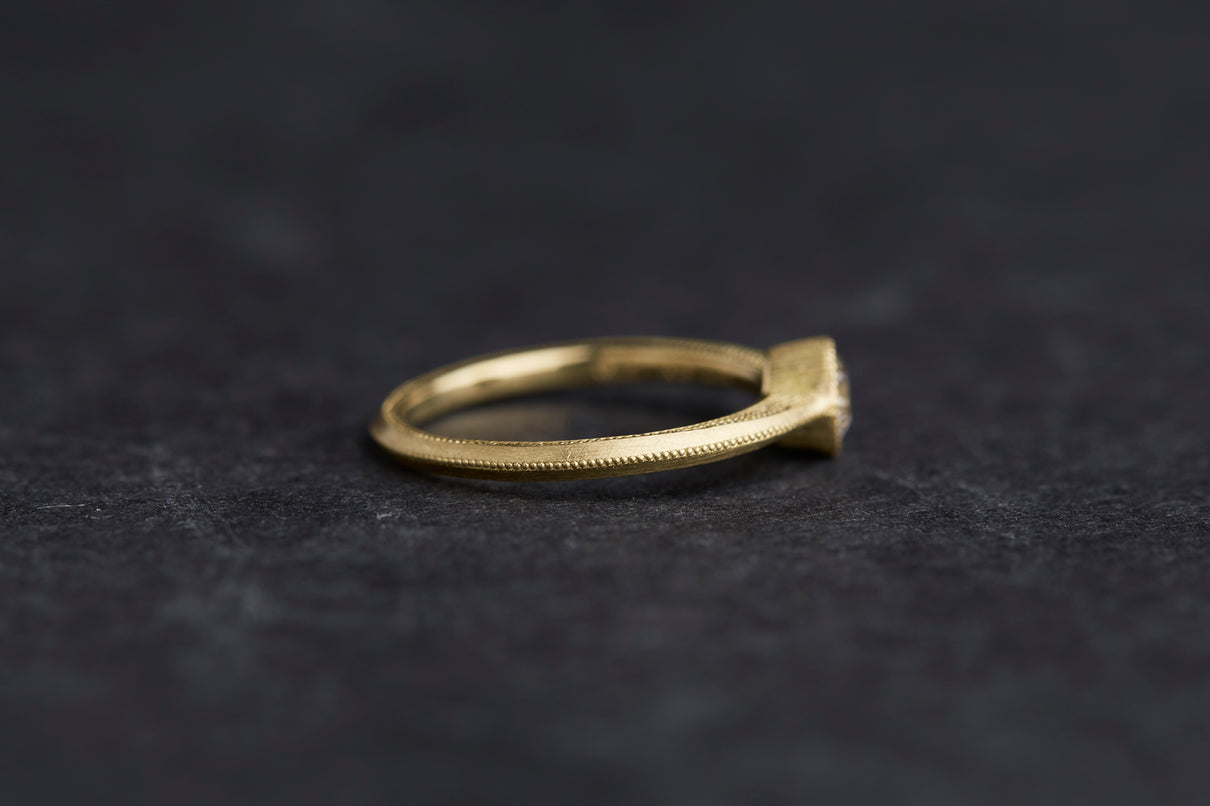 これまでに歩んできた軌跡を無数の点で表現した " Locus "の一点もののリング。ミルグレインという手法を用い丁寧に刻んだ幾つもの点は、ラテン語で " 千の粒 "という意味を持ちます。上質なブリリアントカットのダイヤモンドが指元で眩い煌めきを放つデザイン。幸せな時間がこれから先も刻まれ続けていきますように、と願いを込めたリングは、日常の装いに華を添える だけでなく、特別な贈り物としてもお勧めです。