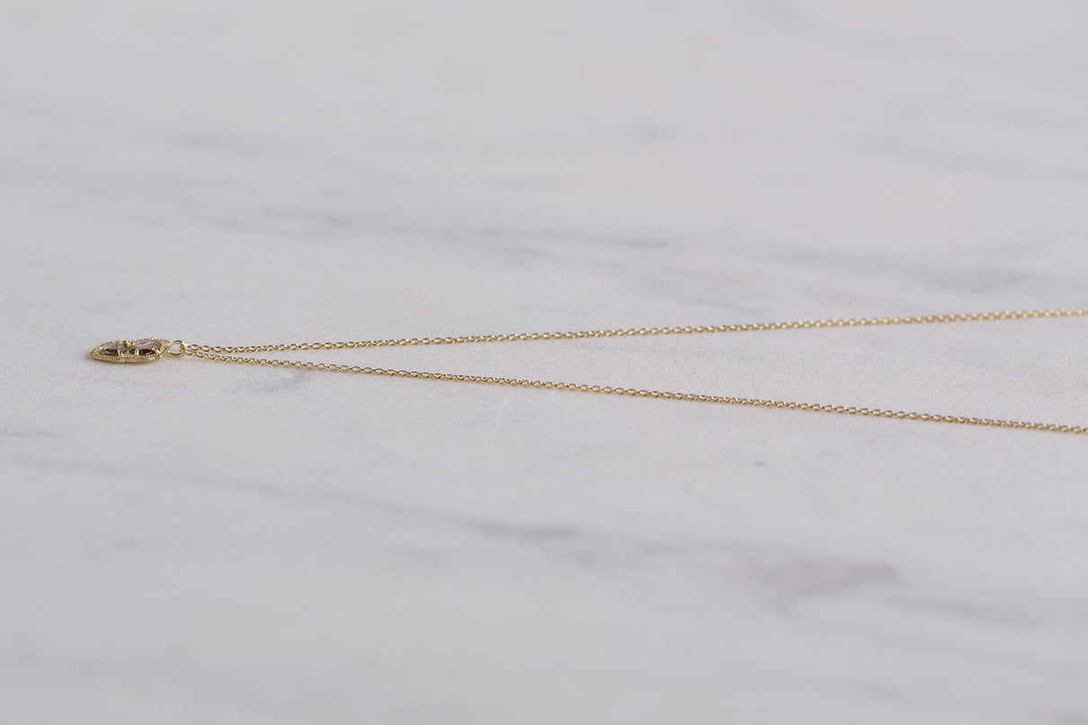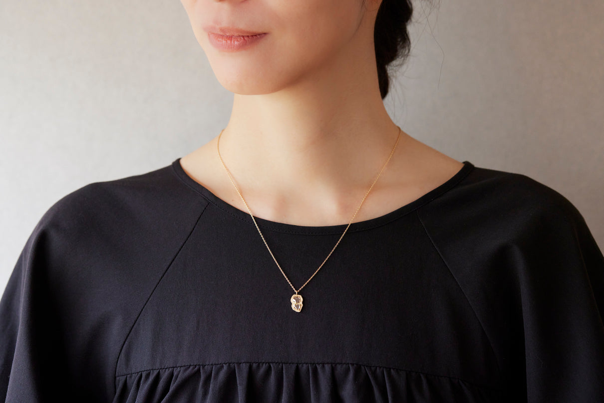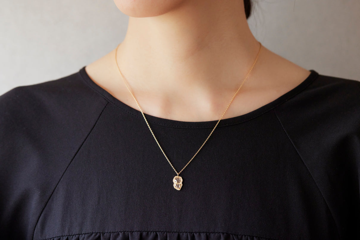 約100年程前にカッティングされたと言われる、有機的な姿が魅力のアンティークダイヤモンドを使用した一点もののネックレス。そのプリミティブなダイヤモンドのフォルムを生かしデザインしたフレームは落ち着きのあるマット仕上げで、それを縁取るように刻んだミルグレインの小さな粒の装飾が、有機的な2石を引き立てます。一つ一つが僅かに違う色味を持つローズカットのダイヤモンドが放つ潤みを帯びた煌めきが、胸元で優しく華やぐデザインです。