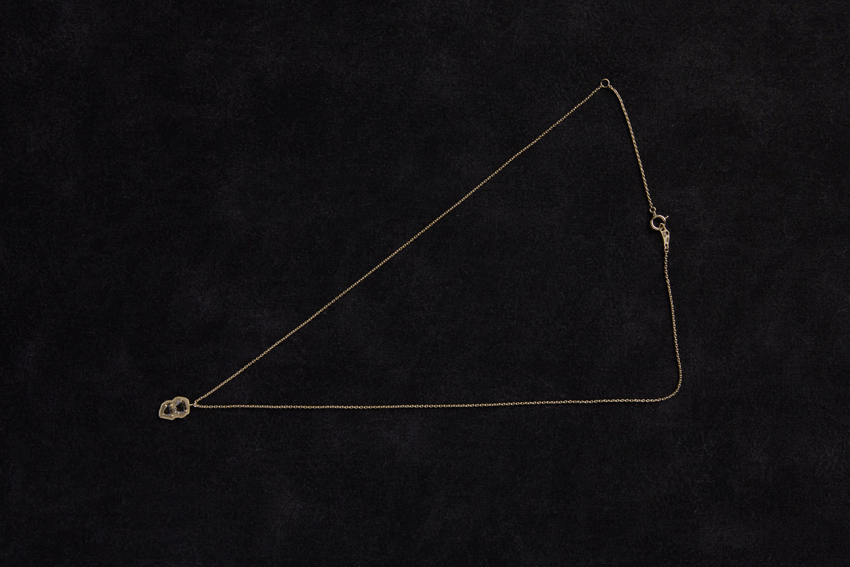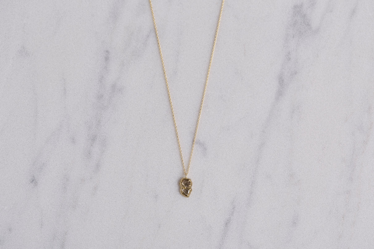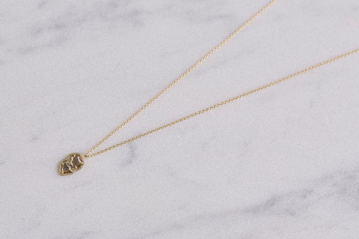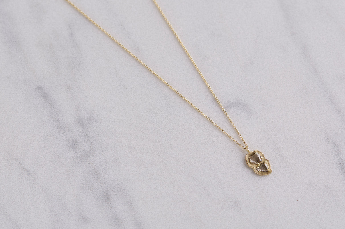 約100年程前にカッティングされたと言われる、有機的な姿が魅力のアンティークダイヤモンドを使用した一点もののネックレス。そのプリミティブなダイヤモンドのフォルムを生かしデザインしたフレームは落ち着きのあるマット仕上げで、それを縁取るように刻んだミルグレインの小さな粒の装飾が、有機的な2石を引き立てます。一つ一つが僅かに違う色味を持つローズカットのダイヤモンドが放つ潤みを帯びた煌めきが、胸元で優しく華やぐデザインです。