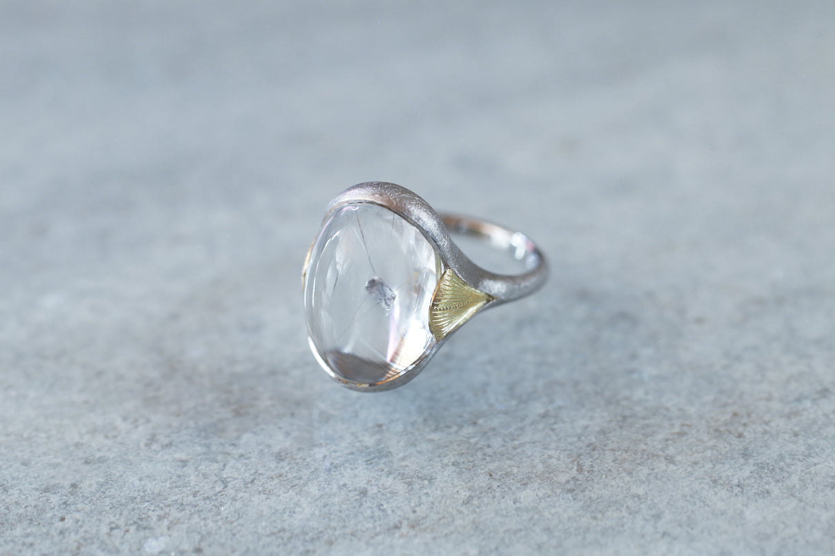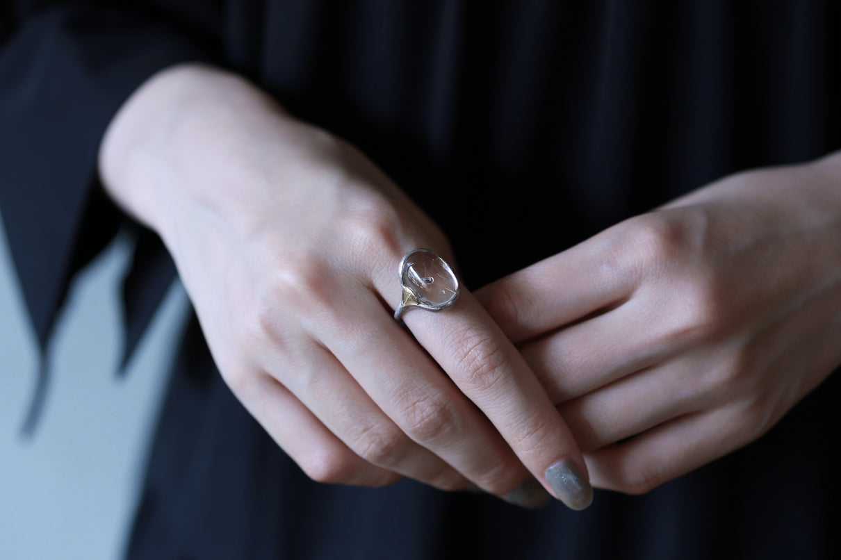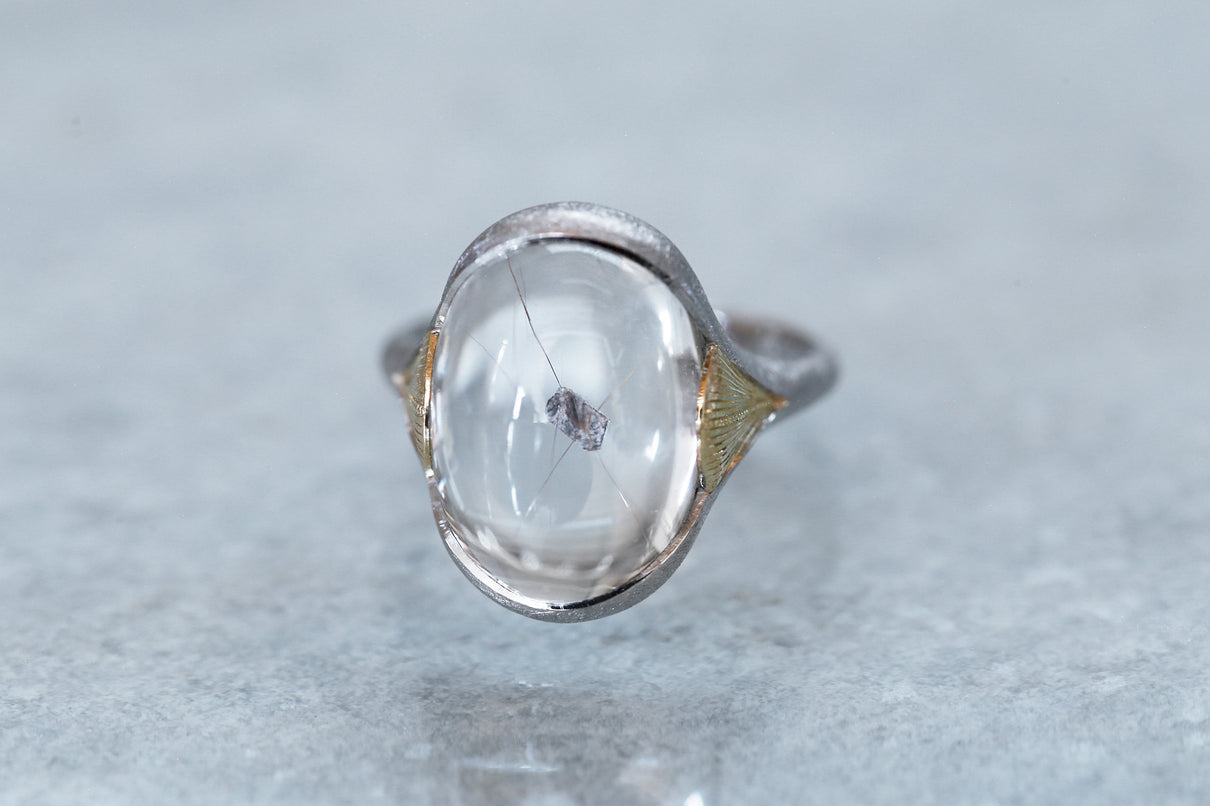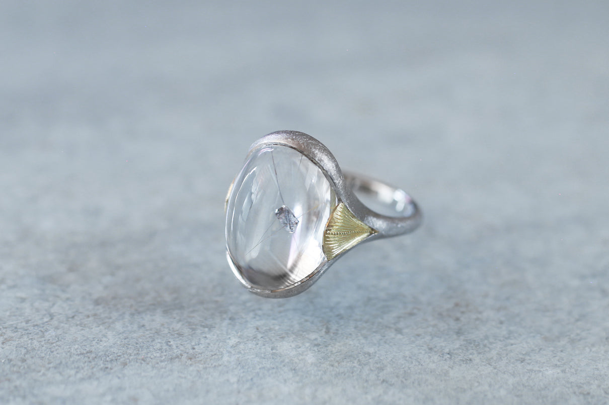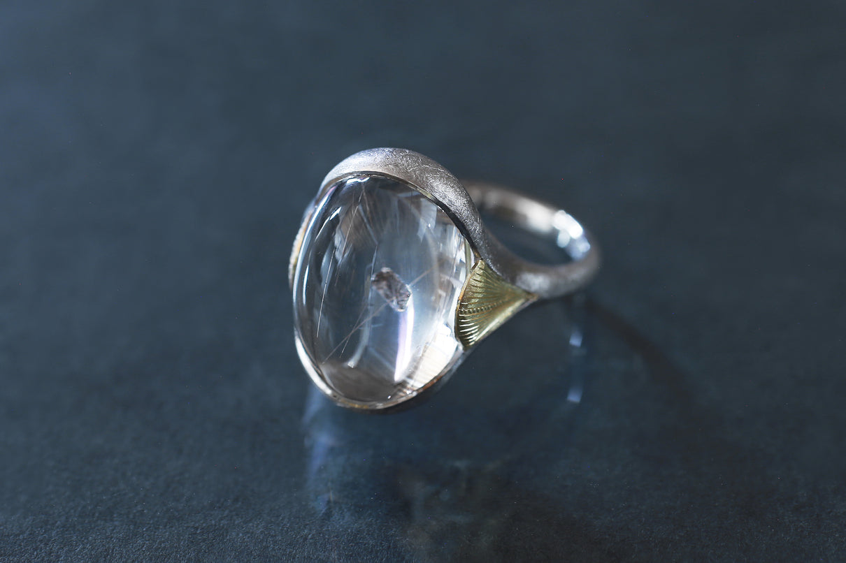 溢れんばかりの潤みを帯びた、カボションカットのカルサイトインクォーツを留めた一点もののリング。ラテン語の「Calcite(石灰)」が名前の由来と言われる"カルサイト"を内包し、その周りでは肉眼でやっと確認出来るほどの大変繊細なルチルが、静寂を伴いながらゆったりと水中を漂うように浮遊しています。澱みなく透き通り、瑞々しさが溢れ出んばかりのふっくらとしたクォーツを優しく包む石座は、まるで朝露を湛えた芍薬の膨らんだ蕾を彷彿とさせる滑らかな曲面を描きます。またプラチナの石座の左右に切り込んだ谷間に嵌め込んだイエローゴールドのパーツには、細やかに刻んだ幾多の光の筋と、極小のミルグレインの繊細な手仕事を施しました。オーバル型のフォルムが指をすっきりと見せるこちらのルースは、瑞々しい佇まいにより涼やかな艶めきを放ちます。