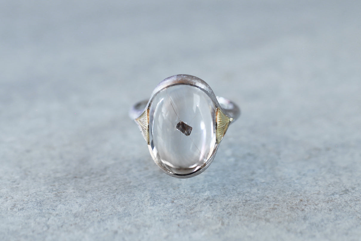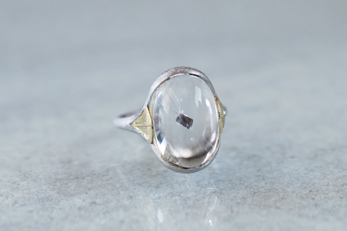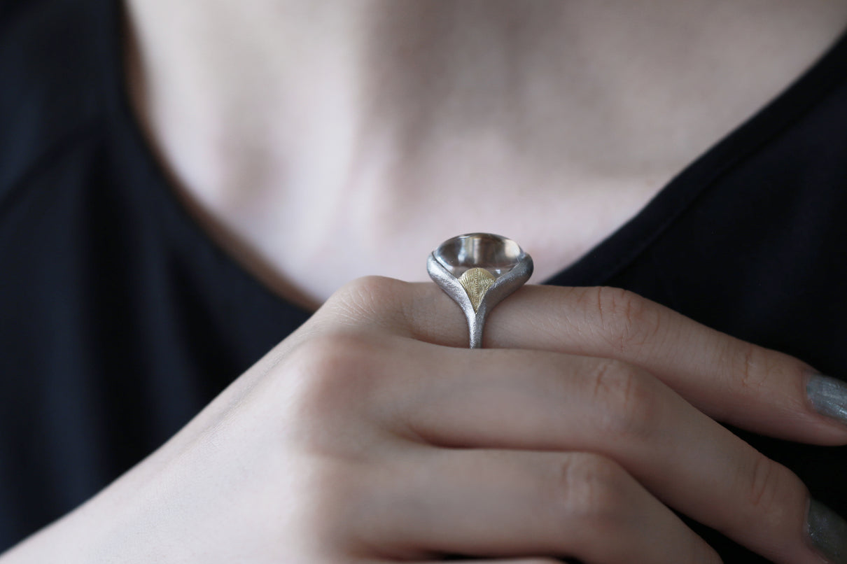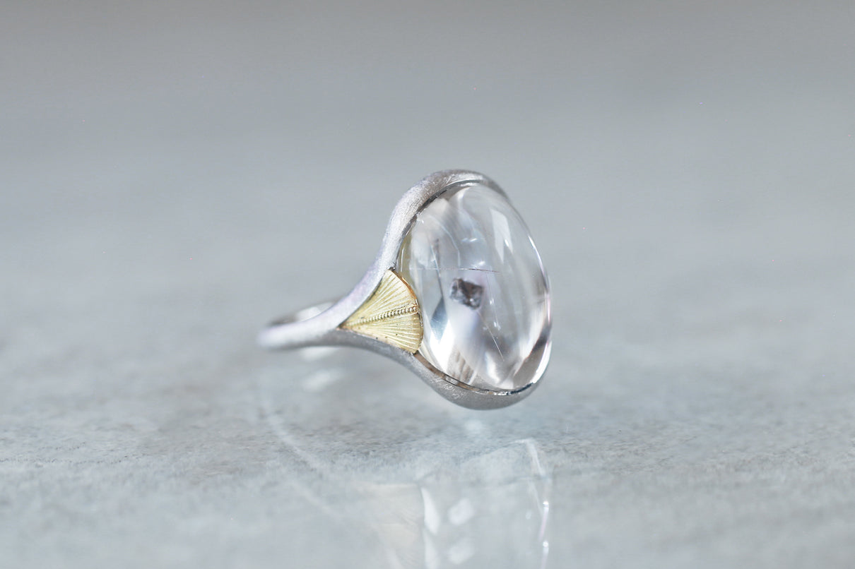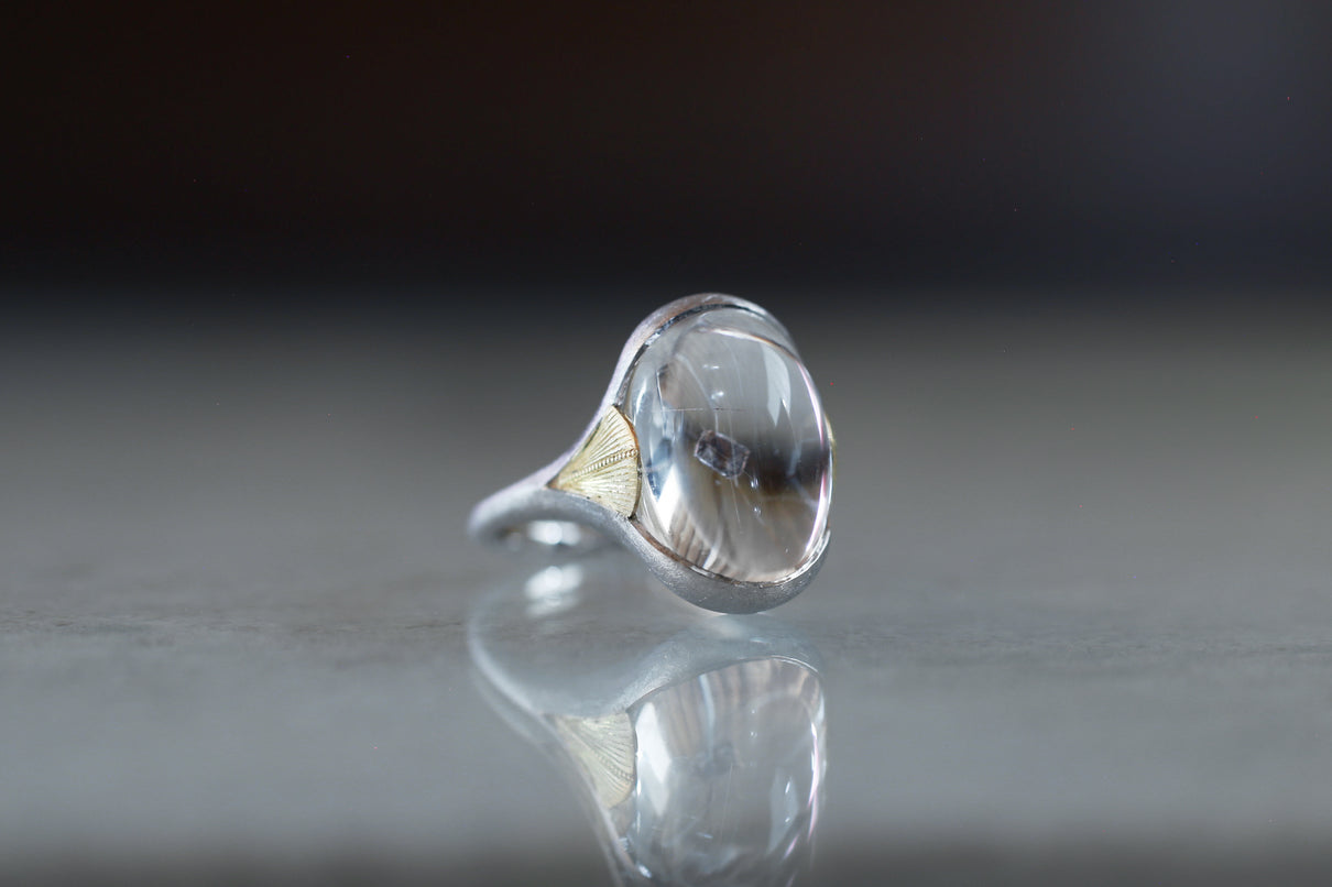 溢れんばかりの潤みを帯びた、カボションカットのカルサイトインクォーツを留めた一点もののリング。ラテン語の「Calcite(石灰)」が名前の由来と言われる"カルサイト"を内包し、その周りでは肉眼でやっと確認出来るほどの大変繊細なルチルが、静寂を伴いながらゆったりと水中を漂うように浮遊しています。澱みなく透き通り、瑞々しさが溢れ出んばかりのふっくらとしたクォーツを優しく包む石座は、まるで朝露を湛えた芍薬の膨らんだ蕾を彷彿とさせる滑らかな曲面を描きます。またプラチナの石座の左右に切り込んだ谷間に嵌め込んだイエローゴールドのパーツには、細やかに刻んだ幾多の光の筋と、極小のミルグレインの繊細な手仕事を施しました。オーバル型のフォルムが指をすっきりと見せるこちらのルースは、瑞々しい佇まいにより涼やかな艶めきを放ちます。