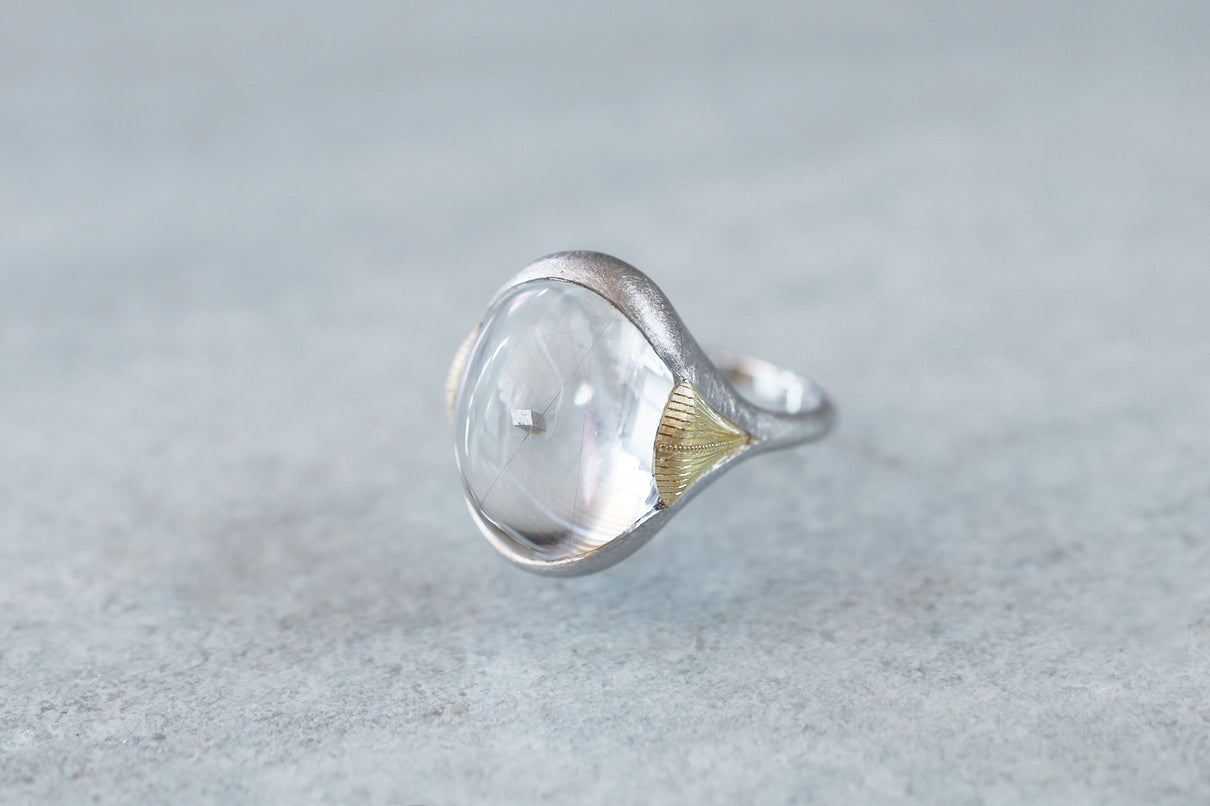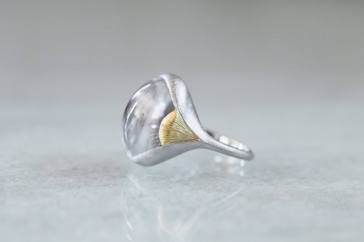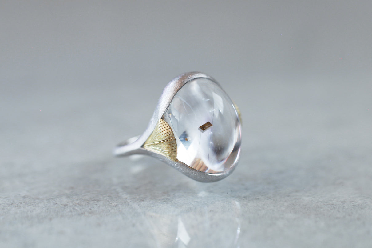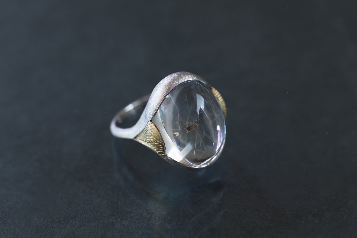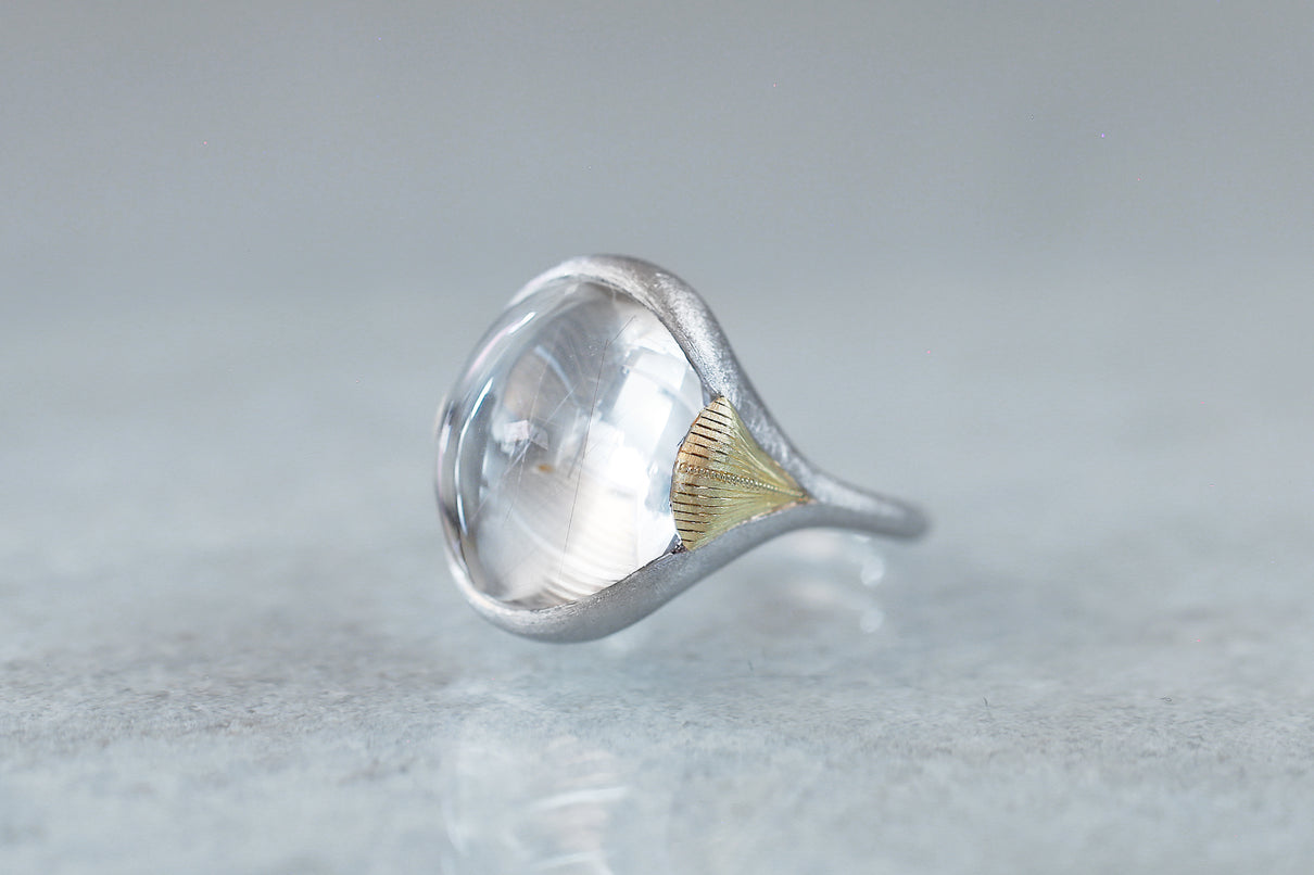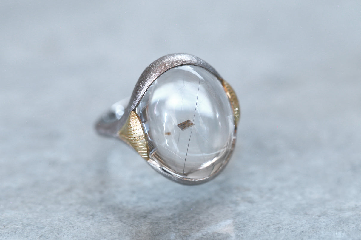 溢れんばかりの潤みを帯びた、カボションカットのカルサイトインクォーツを留めた一点もののリング。ラテン語の「Calcite(石灰)」が名前の由来と言われる"カルサイト"を内包し、その周りでは肉眼でやっと確認出来るほどの大変繊細なルチルが、静寂を伴いながらゆったりと水中を漂うように浮遊しています。澱みなく透き通り、瑞々しさが溢れ出んばかりのふっくらとしたクォーツを優しく包む石座は、まるで朝露を湛えた芍薬の膨らんだ蕾を彷彿とさせる滑らかな曲面を描きます。またプラチナの石座の左右に切り込んだ谷間に嵌め込んだイエローゴールドのパーツには、細やかに刻んだ幾多の光の筋と、極小のミルグレインの繊細な手仕事を施しました。最もボリュームのあるこちらのルースは指元で特別感のある艶めきを放ち、澱みなきクォーツの透明感を存分にお楽しみいただけます。