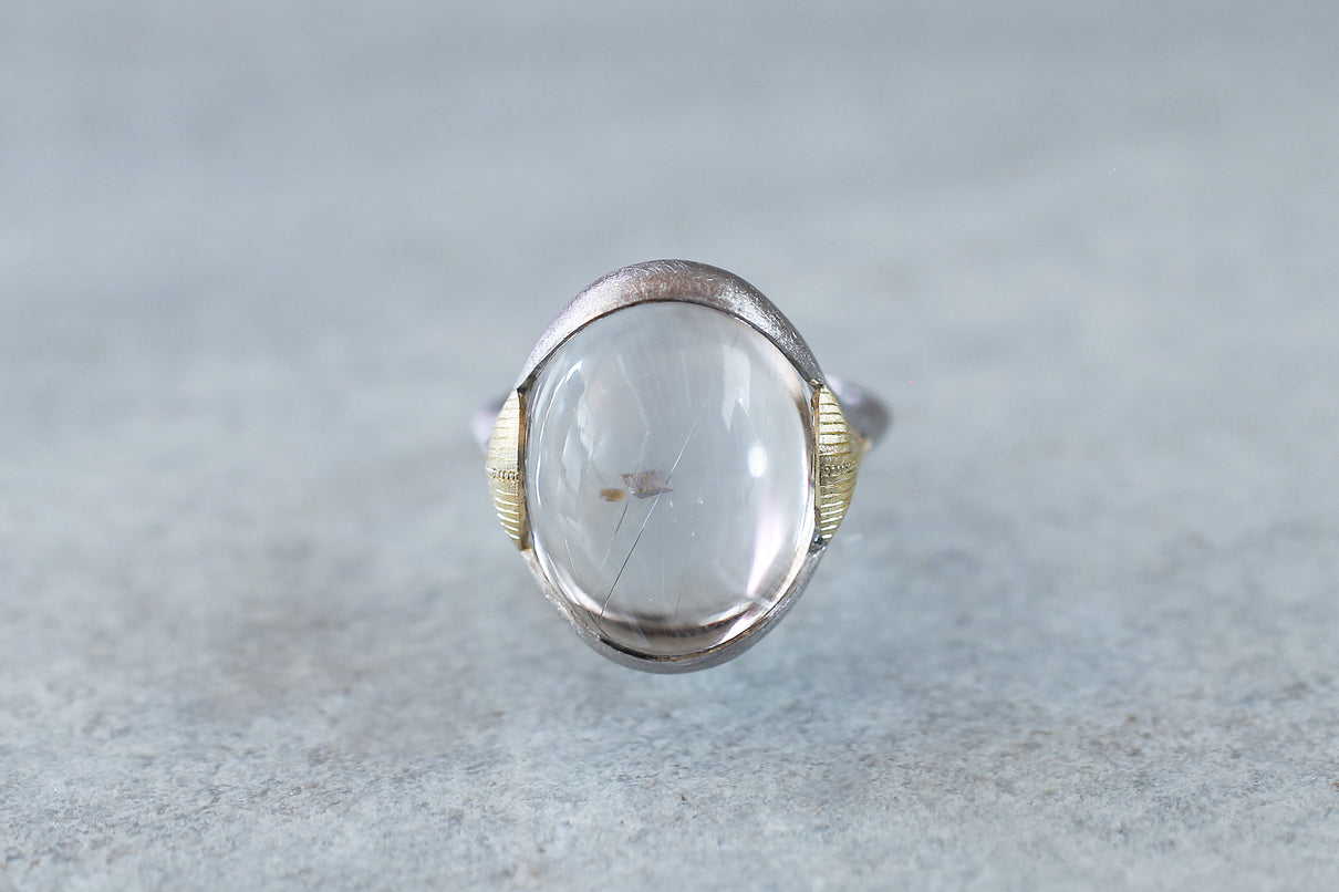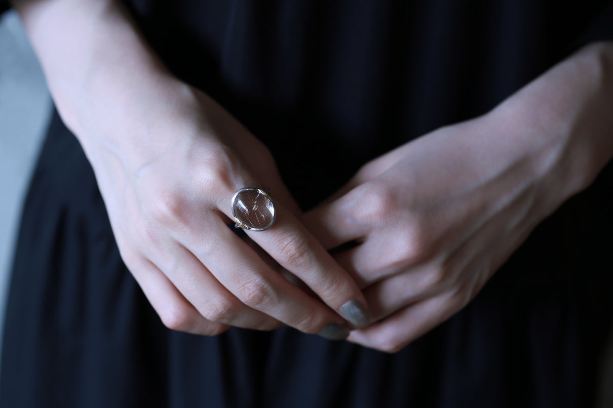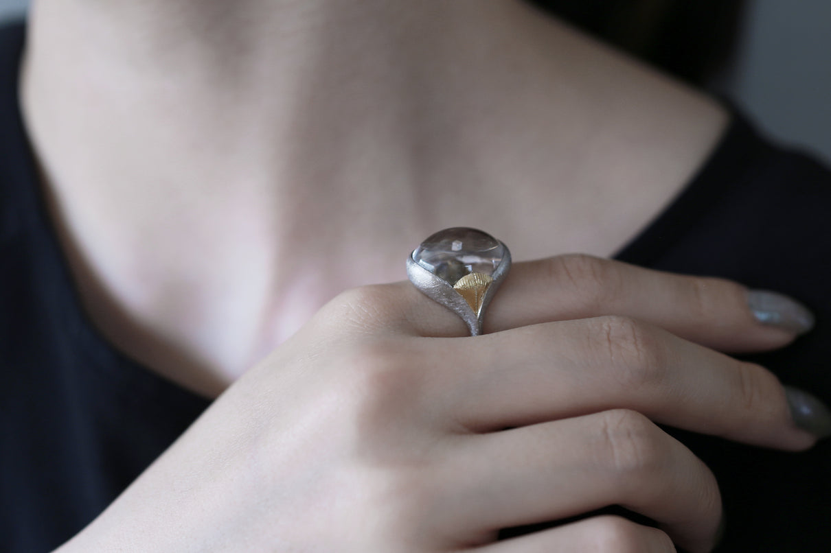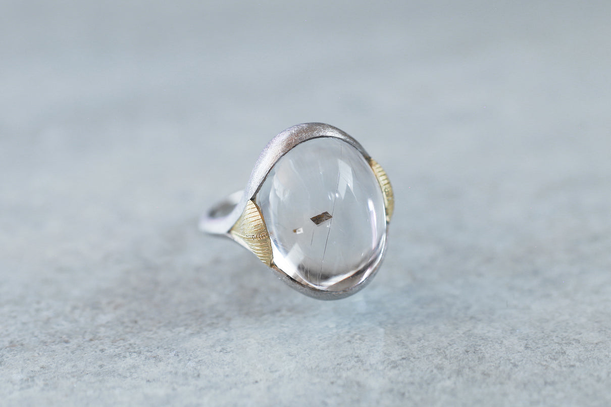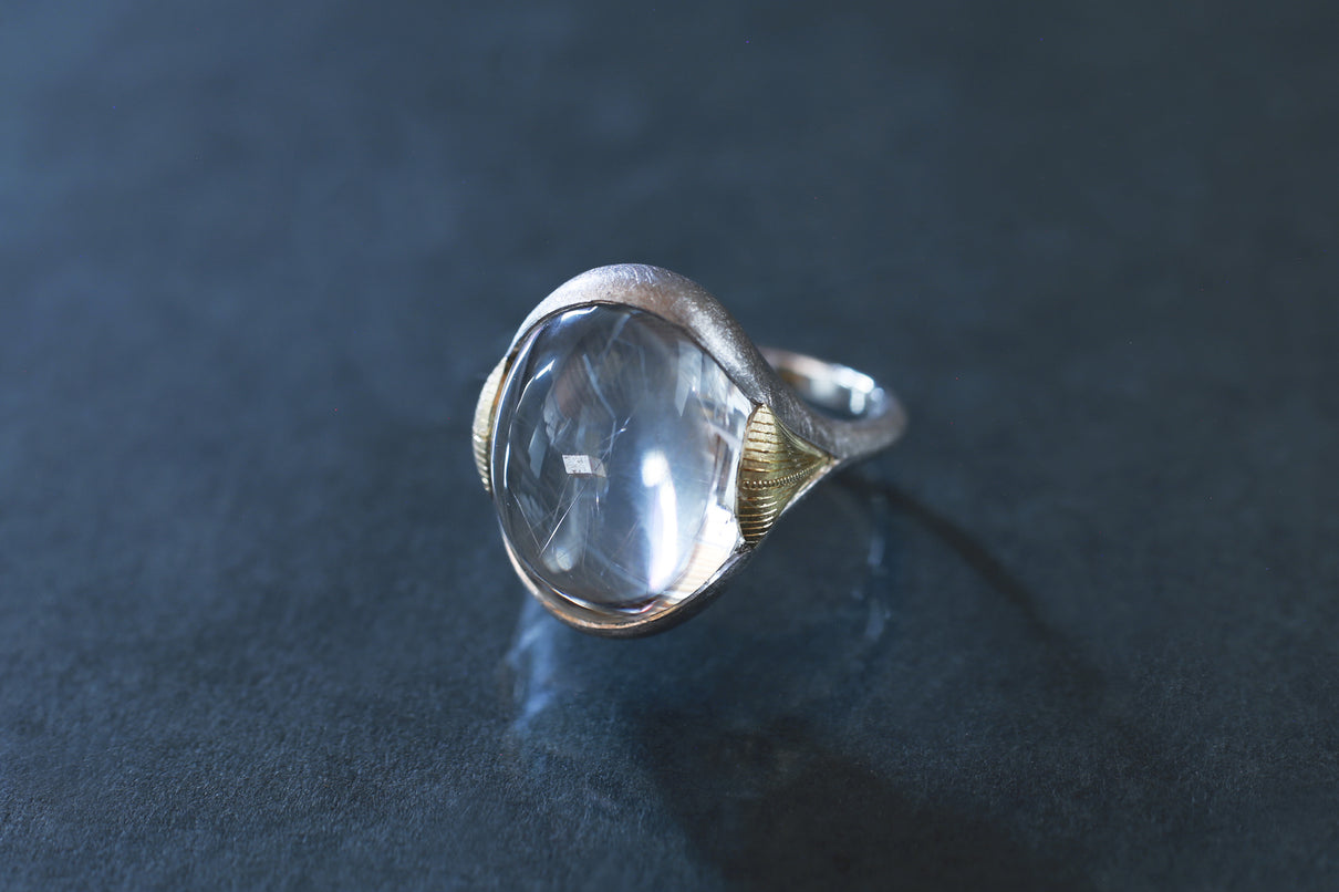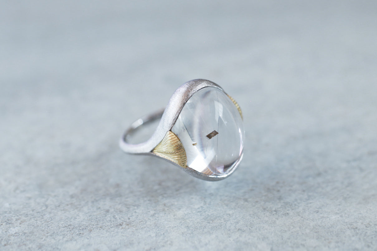溢れんばかりの潤みを帯びた、カボションカットのカルサイトインクォーツを留めた一点もののリング。ラテン語の「Calcite(石灰)」が名前の由来と言われる"カルサイト"を内包し、その周りでは肉眼でやっと確認出来るほどの大変繊細なルチルが、静寂を伴いながらゆったりと水中を漂うように浮遊しています。澱みなく透き通り、瑞々しさが溢れ出んばかりのふっくらとしたクォーツを優しく包む石座は、まるで朝露を湛えた芍薬の膨らんだ蕾を彷彿とさせる滑らかな曲面を描きます。またプラチナの石座の左右に切り込んだ谷間に嵌め込んだイエローゴールドのパーツには、細やかに刻んだ幾多の光の筋と、極小のミルグレインの繊細な手仕事を施しました。最もボリュームのあるこちらのルースは指元で特別感のある艶めきを放ち、澱みなきクォーツの透明感を存分にお楽しみいただけます。