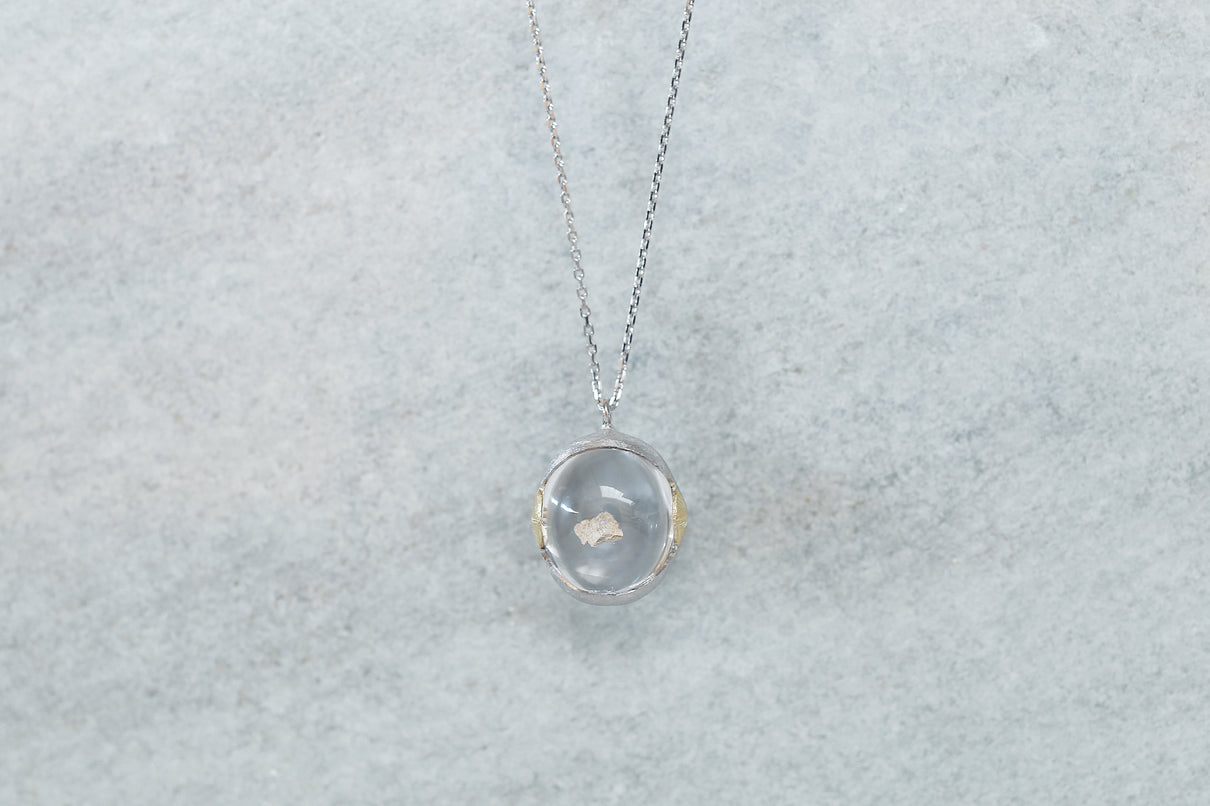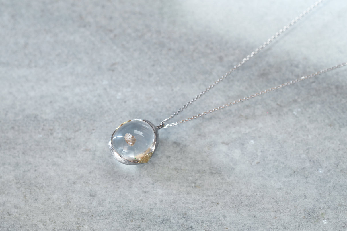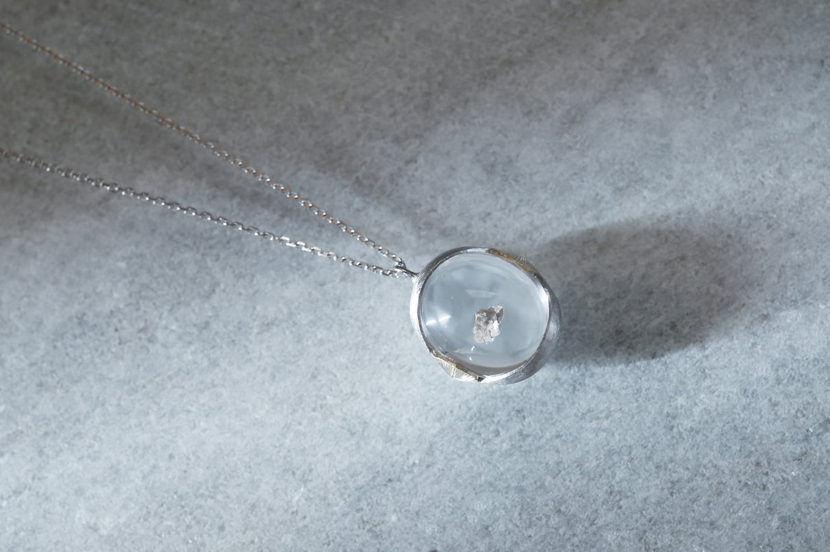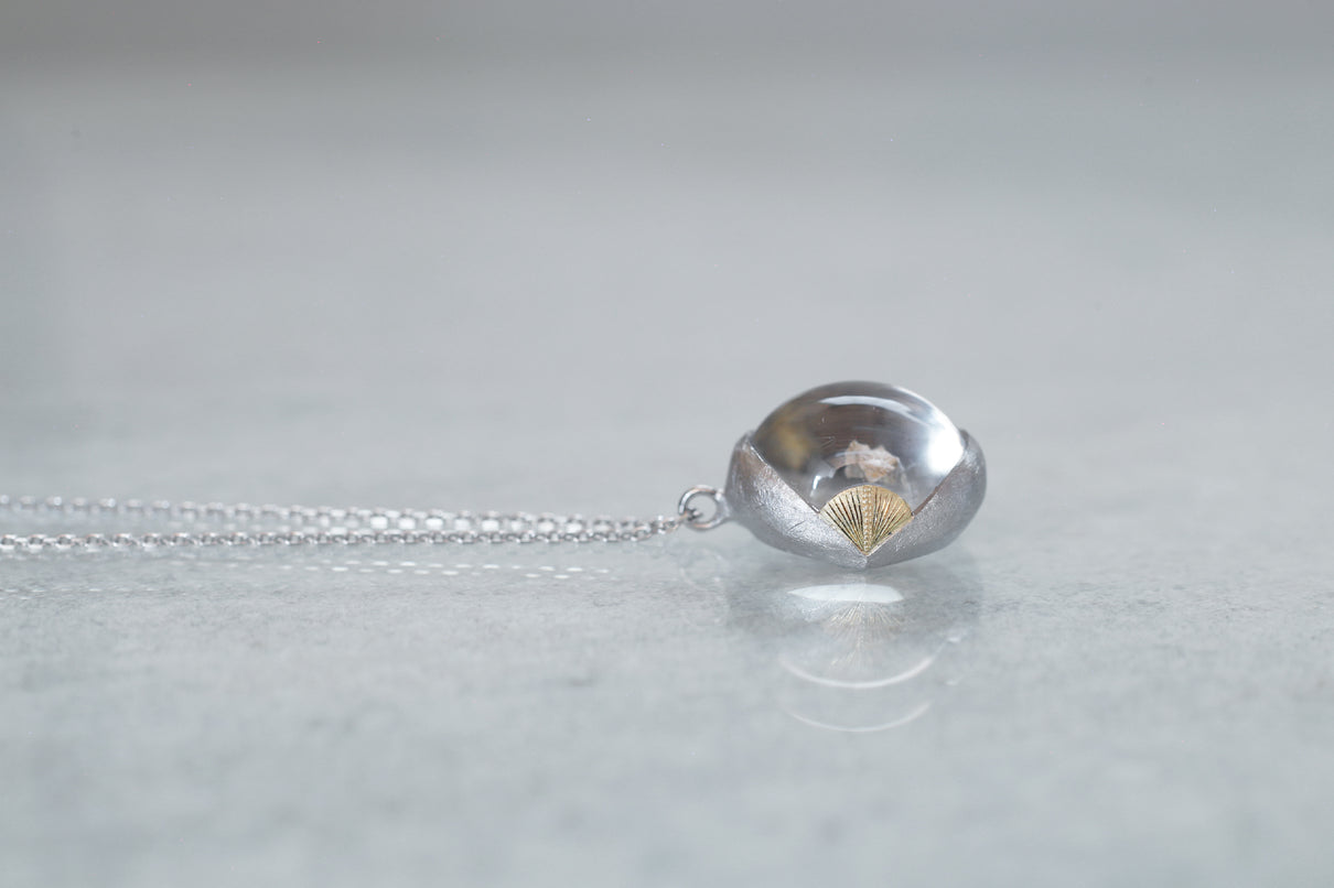 溢れんばかりの潤みを帯びた、カボションカットのカルサイトインクォーツを留めた一点もののネックレス。ラテン語の「Calcite(石灰)」が名前の由来と言われる"カルサイト"を内包し、静寂を伴いながらゆったりと水中を漂うように浮遊しています。澱みなく透き通り、瑞々しさが溢れ出んばかりのふっくらとしたクォーツを優しく包む石座は、まるで朝露を湛えた芍薬の膨らんだ蕾を彷彿とさせる滑らかな曲面を描きます。またプラチナの石座の左右に切り込んだ谷間に嵌め込んだイエローゴールドのパーツには、細やかに刻んだ幾多の光の筋と、極小のミルグレインの繊細な手仕事を施しました。ボリュームのあるトップに合わせた60cmのロングタイプのチェーン。ルース自体に色彩を伴わずとも存在感あるアクセントとして幅広い装いに寄り添い、お召し物の色味を問わずお楽しみいただけます。