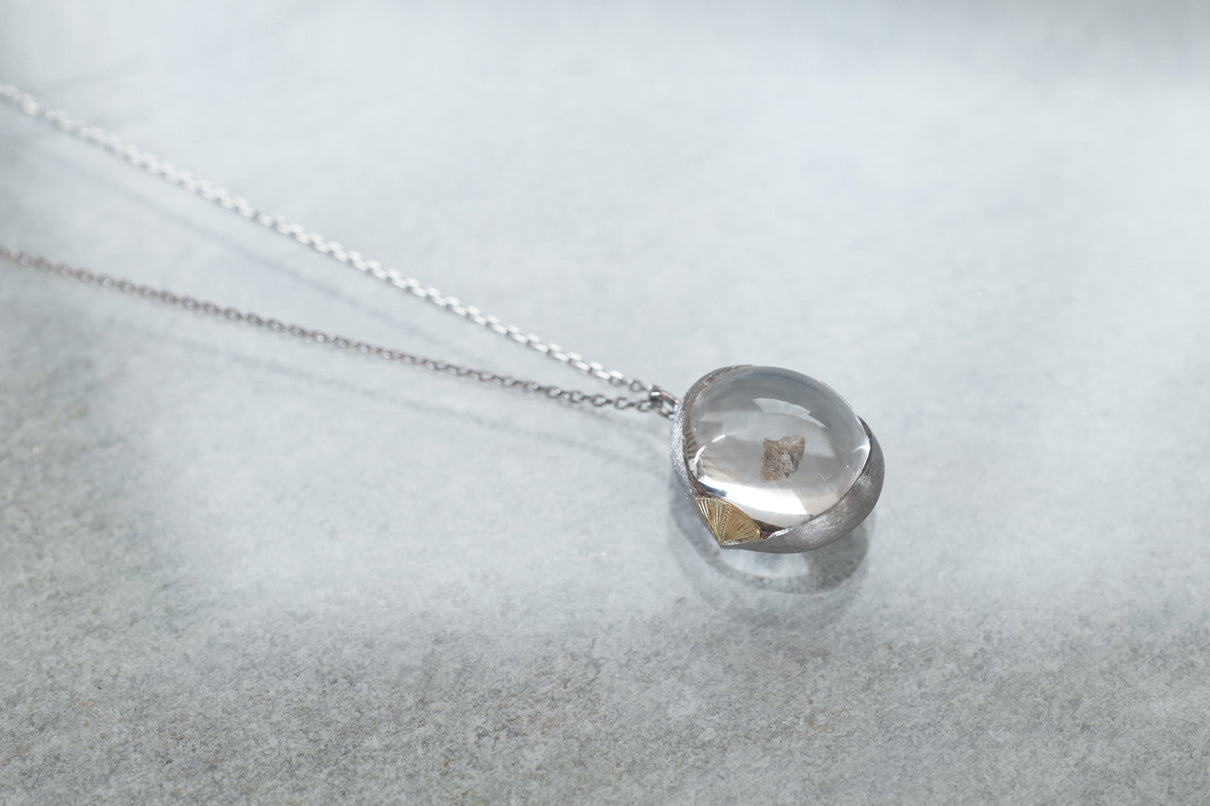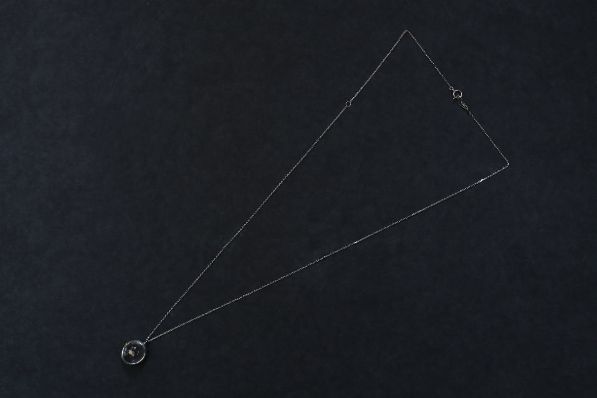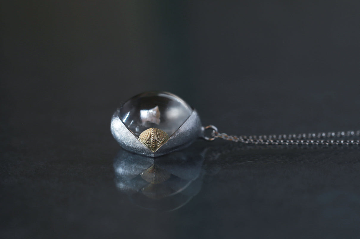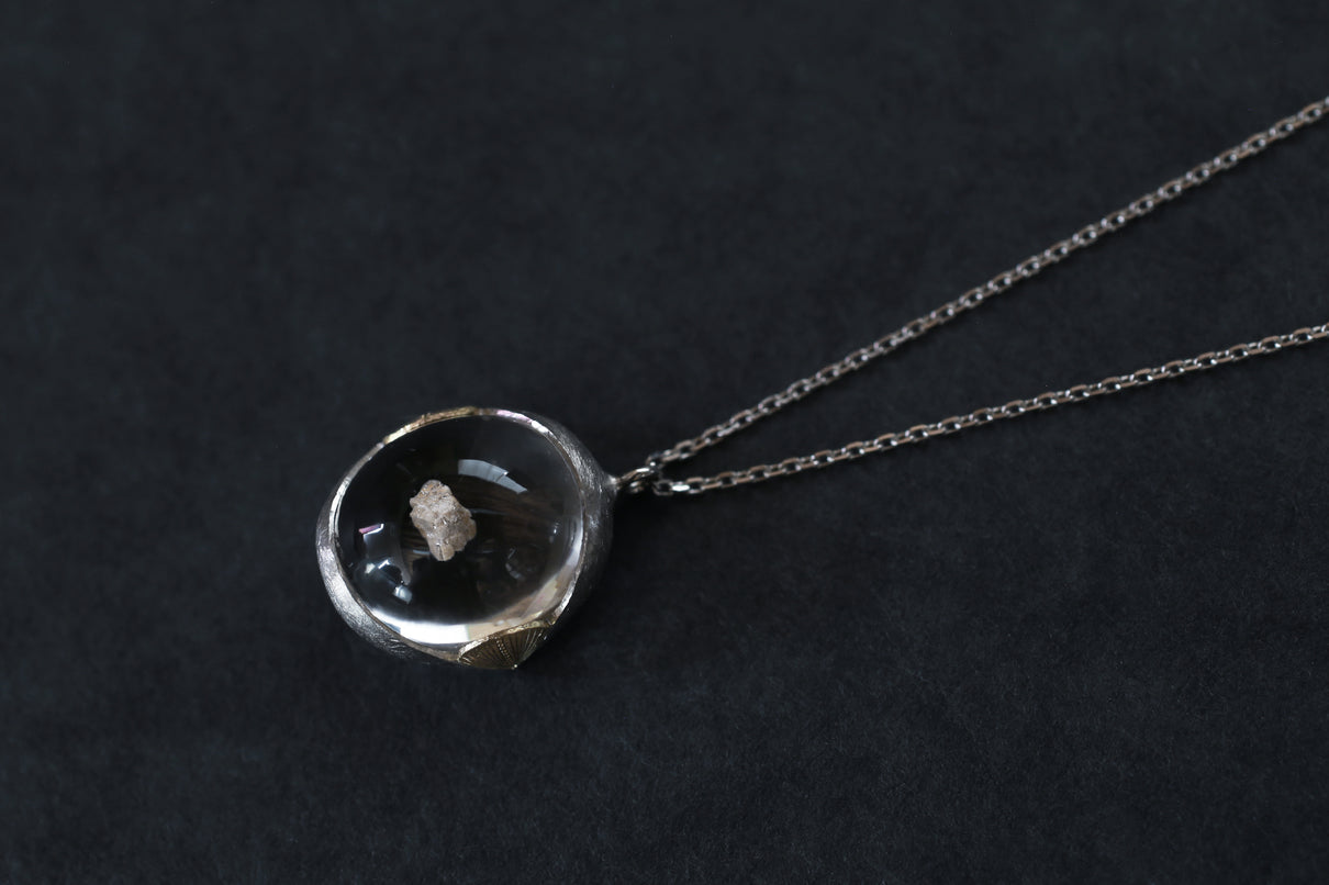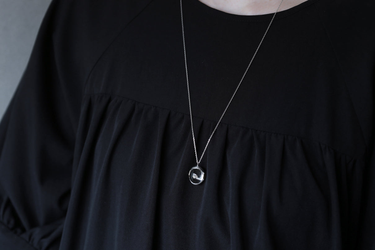 溢れんばかりの潤みを帯びた、カボションカットのカルサイトインクォーツを留めた一点もののネックレス。ラテン語の「Calcite(石灰)」が名前の由来と言われる"カルサイト"を内包し、静寂を伴いながらゆったりと水中を漂うように浮遊しています。澱みなく透き通り、瑞々しさが溢れ出んばかりのふっくらとしたクォーツを優しく包む石座は、まるで朝露を湛えた芍薬の膨らんだ蕾を彷彿とさせる滑らかな曲面を描きます。またプラチナの石座の左右に切り込んだ谷間に嵌め込んだイエローゴールドのパーツには、細やかに刻んだ幾多の光の筋と、極小のミルグレインの繊細な手仕事を施しました。ボリュームのあるトップに合わせた60cmのロングタイプのチェーン。ルース自体に色彩を伴わずとも存在感あるアクセントとして幅広い装いに寄り添い、お召し物の色味を問わずお楽しみいただけます。
