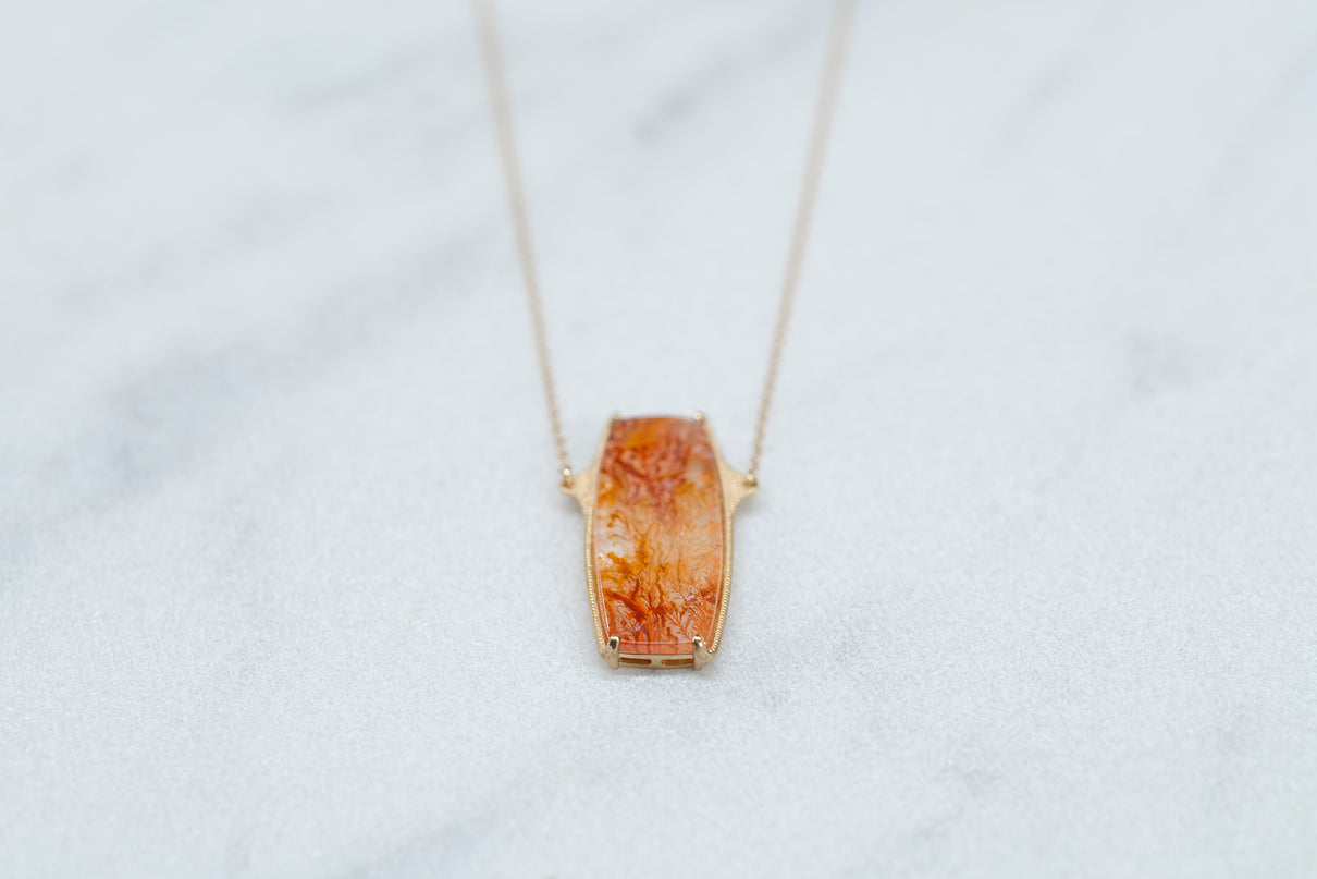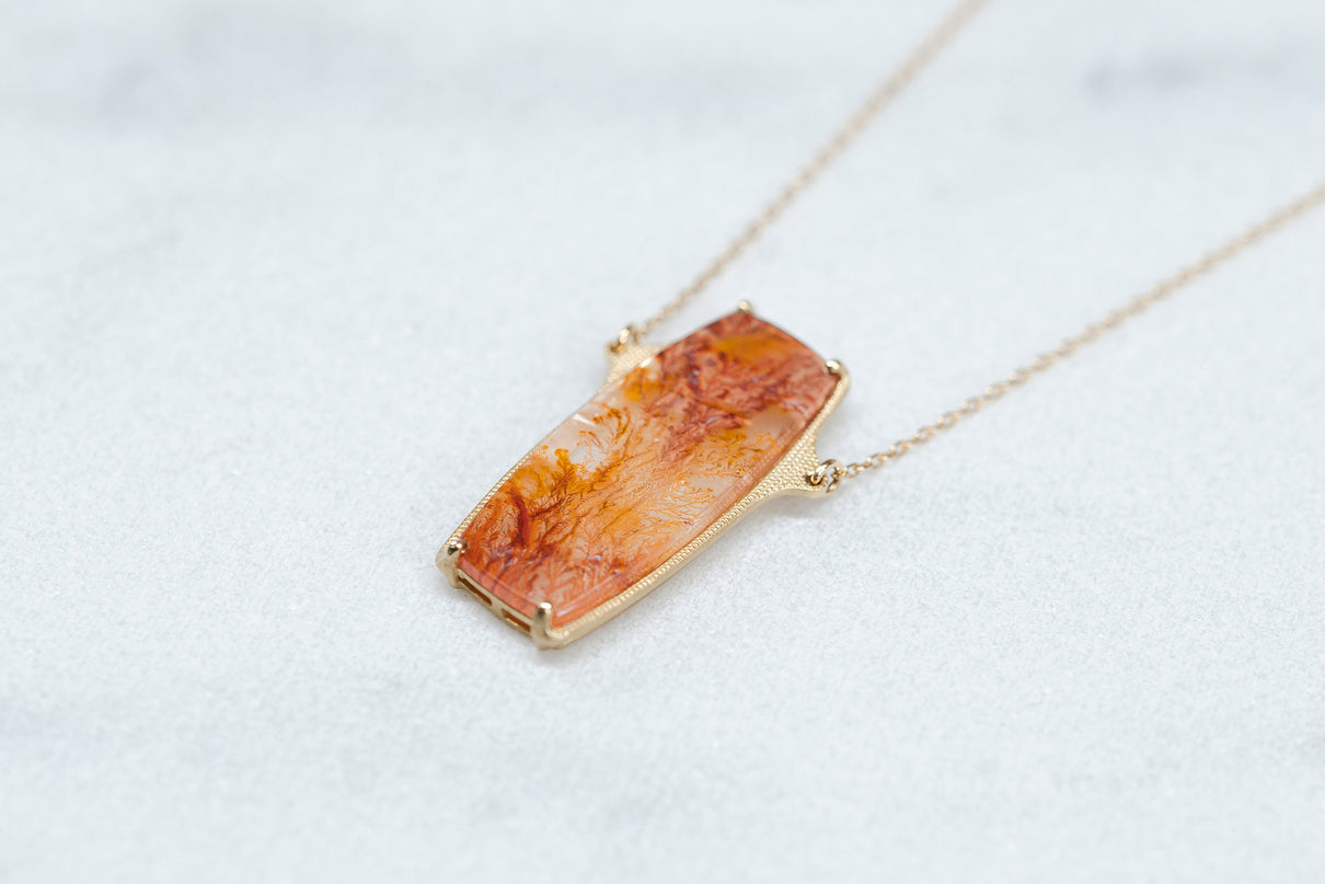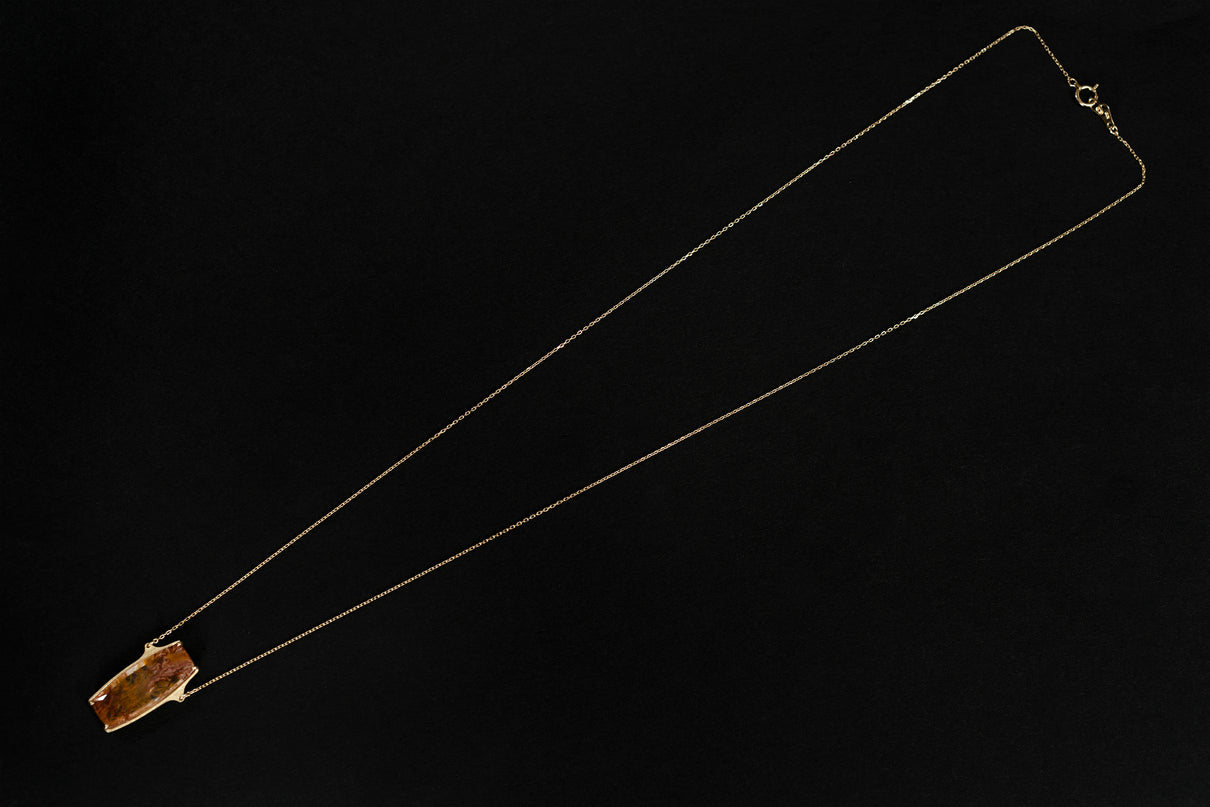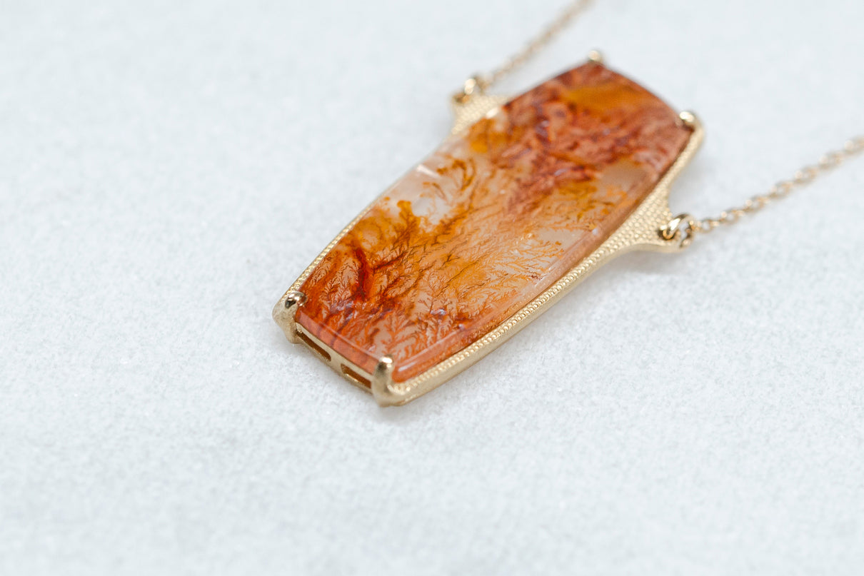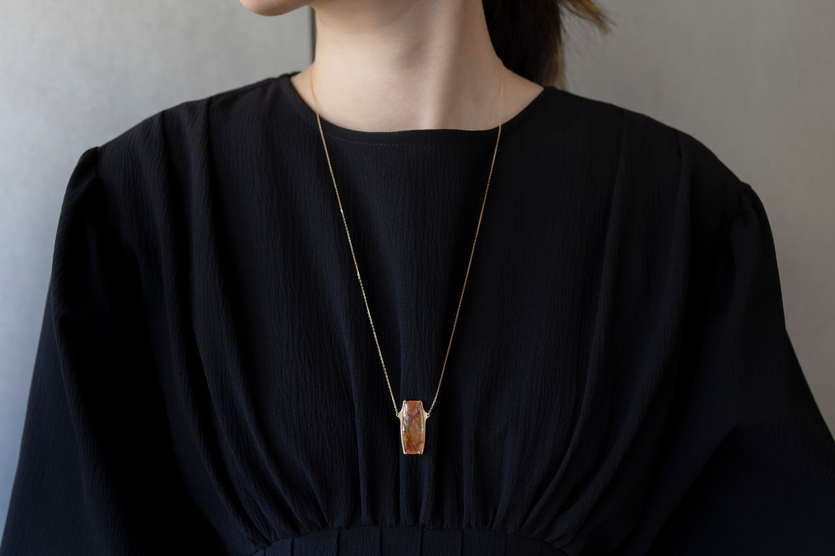 植物をそのまま水晶に閉じ込めたような幻想的な美しさを持つデンドリティッククォーツで仕立てた一点もののロングネックレス。水晶の僅かな隙間から二酸化マンガンなどが侵入し結晶化することで、あたかも実際の植物が水晶の中に閉じ込められたような模様を描き、その二つとない風景はまさに自然が生み出した作品といえます。様々な角度から滲むように伸びる鮮やかな色彩は、フラットなスクエア型の水晶のキャンバスの中で交差し、黄色から橙、赤色の繊細なグラデーションを描き出しています。石座には幾多の繊細なミル打ちを施し、控えめながらも存在感のあるアクセントとして輝きます。装いの主役として、華やかな彩りを添えてくれるアイテムです。