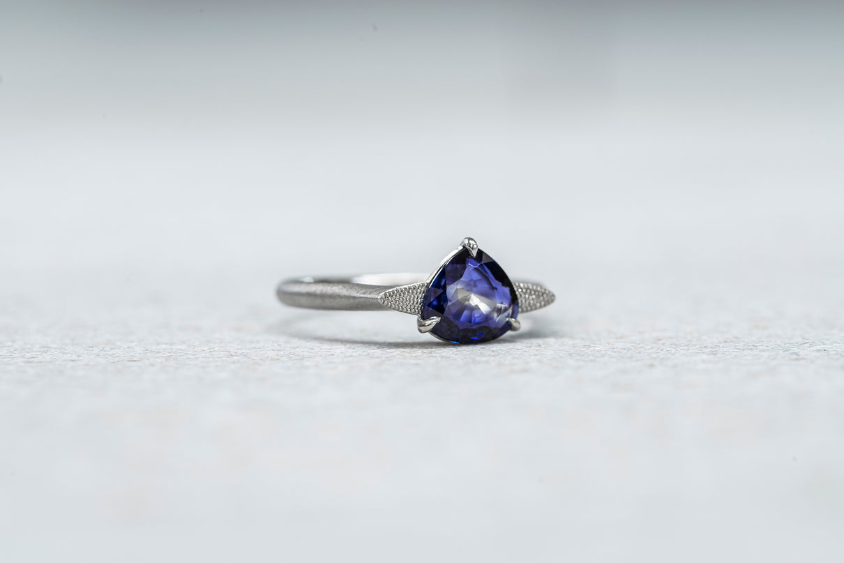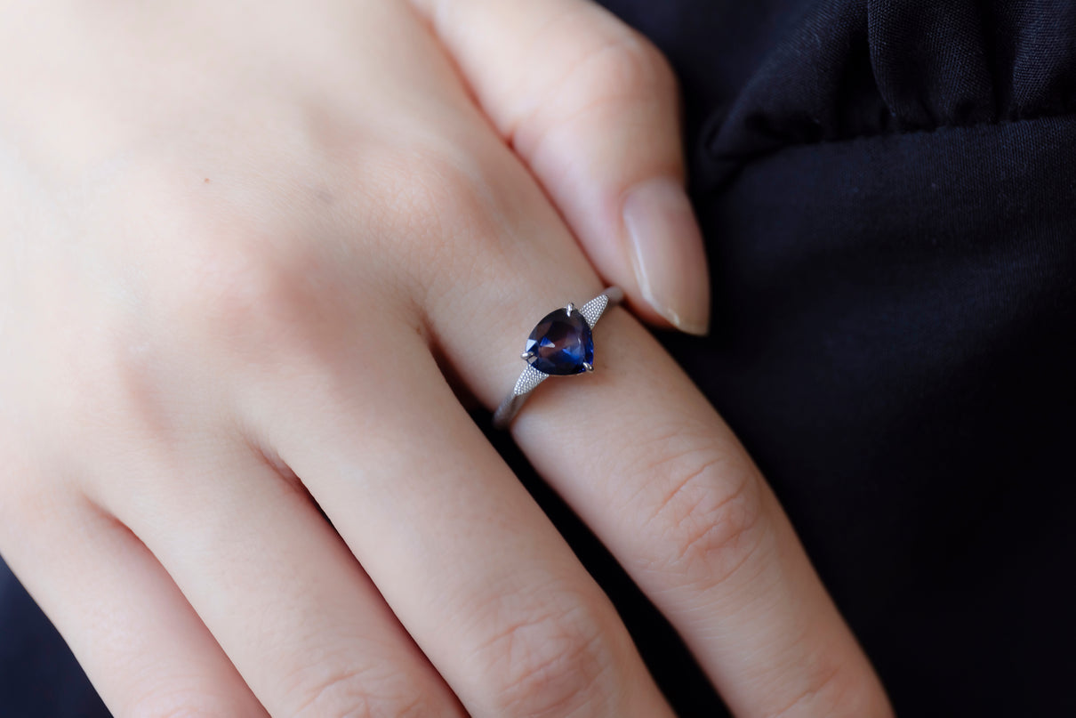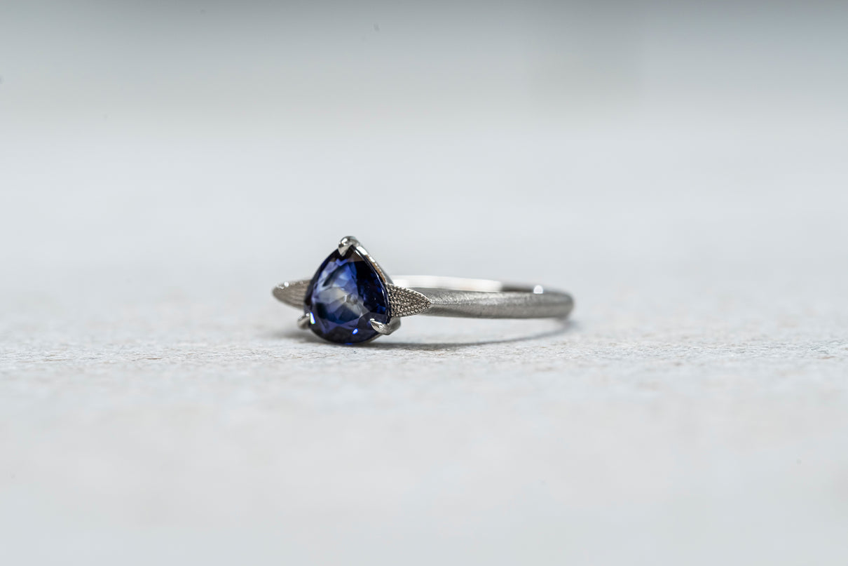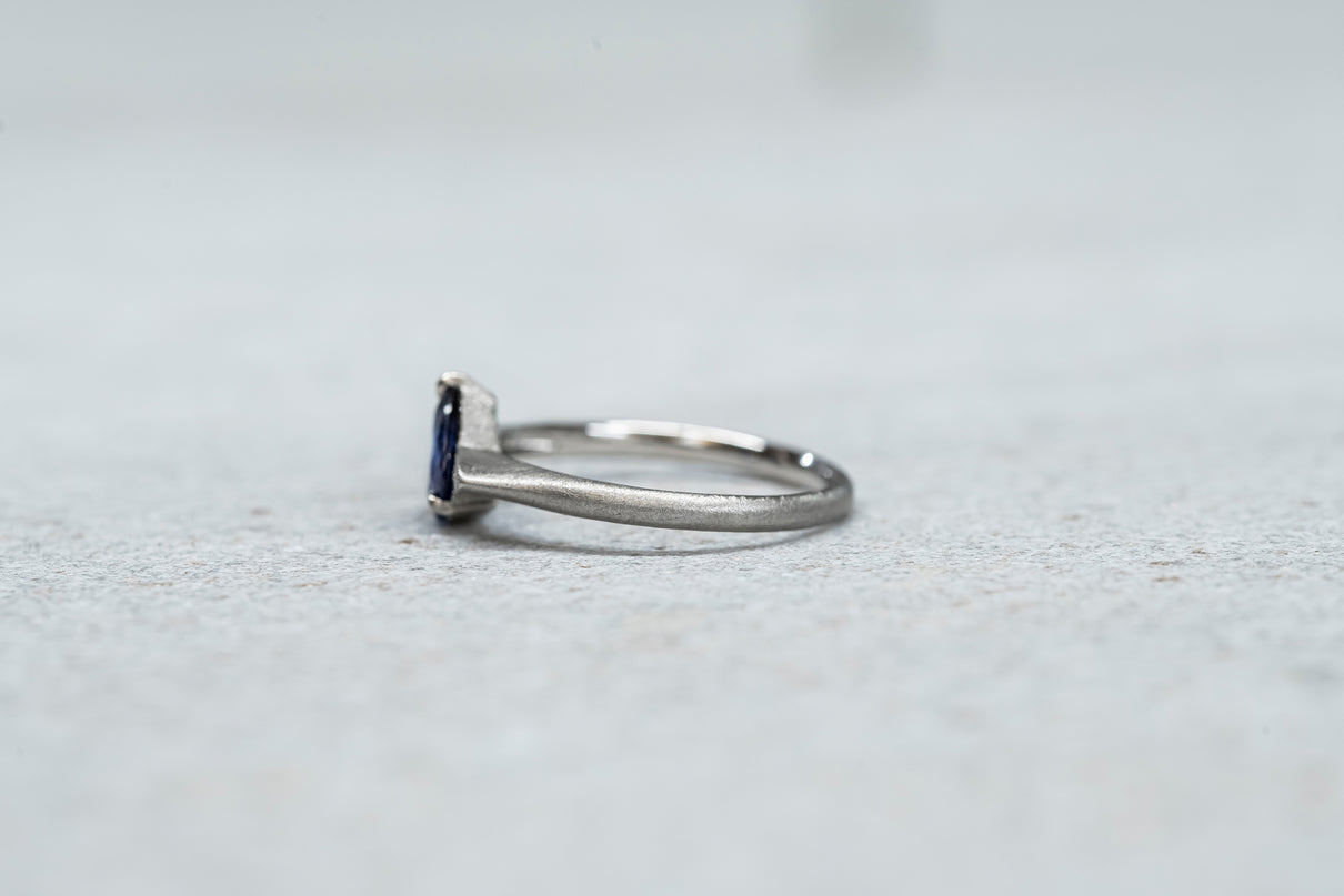 中央に一筋の光が差し込むように、直線的に切り替わる色のバランスが印象的なバイカラーサファイアを留めた一点もののリング。澄み渡る高い透明度を持ち、サファイアらしい上品で神秘的な青色が目を引くドロップカットのルースを3本の爪で留めたデザインです。サファイアよりも一段低く平面に切り出した石座の両サイドには繊細なミル打ちをあしらい、小さく羽を広げるようなシルエットに仕立てました。微細なマットテクスチャーを施したプラチナのリングアームは横から見た時の構築的な姿も印象的で、様々な角度から多様な表情を楽しむことができるリング。9月の誕生石としても親しまれているサファイアは、9月生まれの方の特別なお守りとしてもお勧めです。
